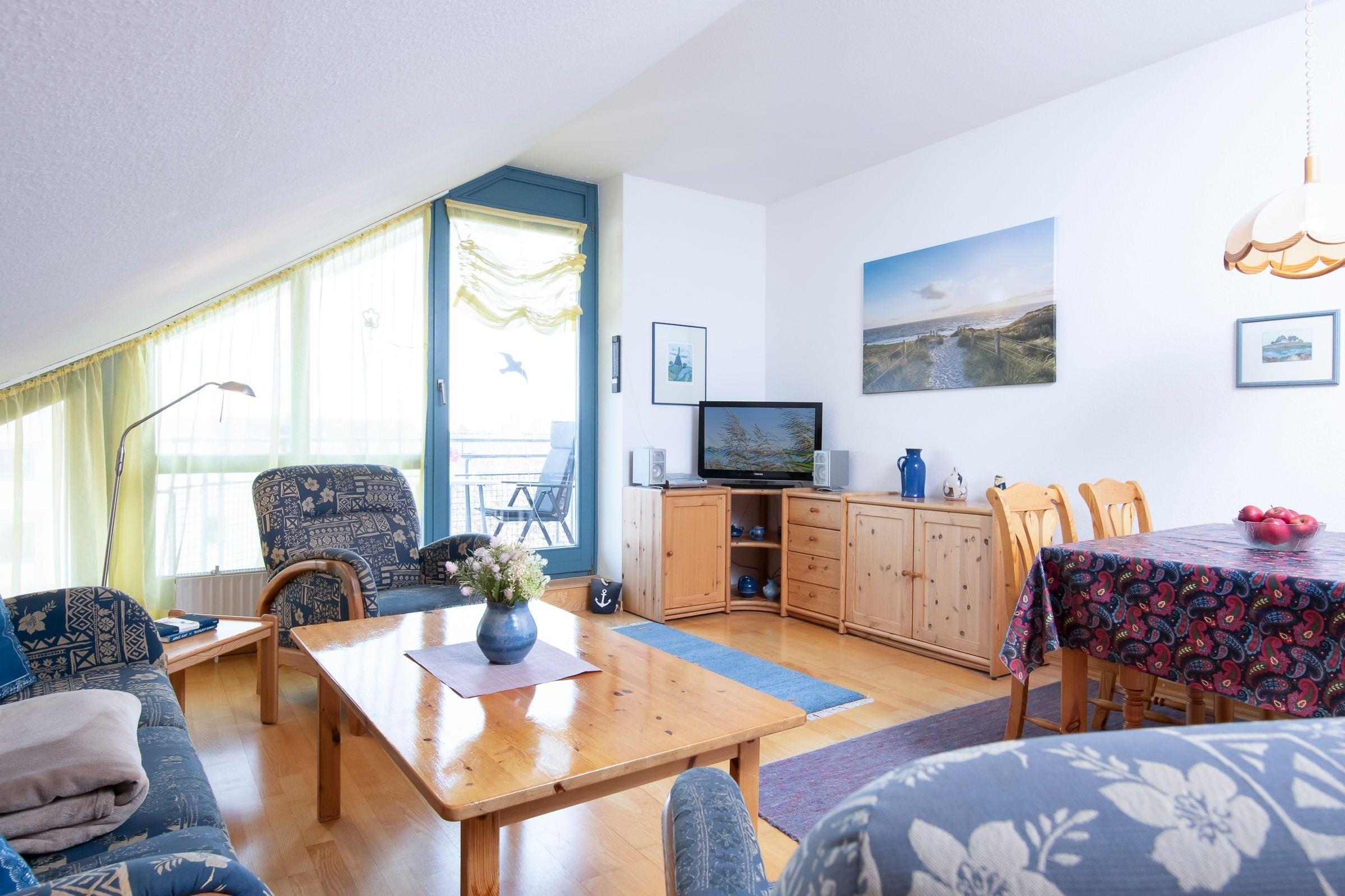 Der Flur hält ausreichend Stauraum für Ihre Jacken und Schuhe bereit. Der Wohn- und Essbereich ist geräumig und durch die große Fensterfront stets hell und lichtdurchflutet. Nehmen Sie Platz auf dem gemütlichen Sofa oder einem der zwei bequemen Sessel und lassen Sie die Abende vor dem Fernseher ausklingen. Vom Wohnbereich aus gelangen Sie auf den kleinen, möblierten Südbalkon, der zu erholsamen Stunden einlädt. Die moderne Küche mit hellen Fronten ist z. B. mit einem 4-Platten-Cerankochfeld, einem Geschirrspüler und einer Senseo-Kaffeemaschine gut ausgestattet. Die Wohnung verfügt über zwei separate Schlafzimmer: Eines mit einem Doppelbett (2x 90x200 cm) und eines mit zwei getrennt stehenden Einzelbetten (je 90x190 cm). Die Velux-Fenster in beiden Schlafzimmern lassen sich durch elektrische Rollläden angenehm abdunkeln, sodass Sie im Urlaub Ihren wohlverdienten Schlaf erhalten. Im innenliegenden, hell gefliesten Badezimmer erwartet Sie eine Dusche und sogar ein beheizbarer Handtuchhalter. Der WLAN-Anschluss ist selbstverständlich inklusive. Zusätzlich steht Ihnen der gemeinschaftlich genutzte Garten für eine ausgiebige Runde Federball oder gesellige Stunden im Freien zur Verfügung.