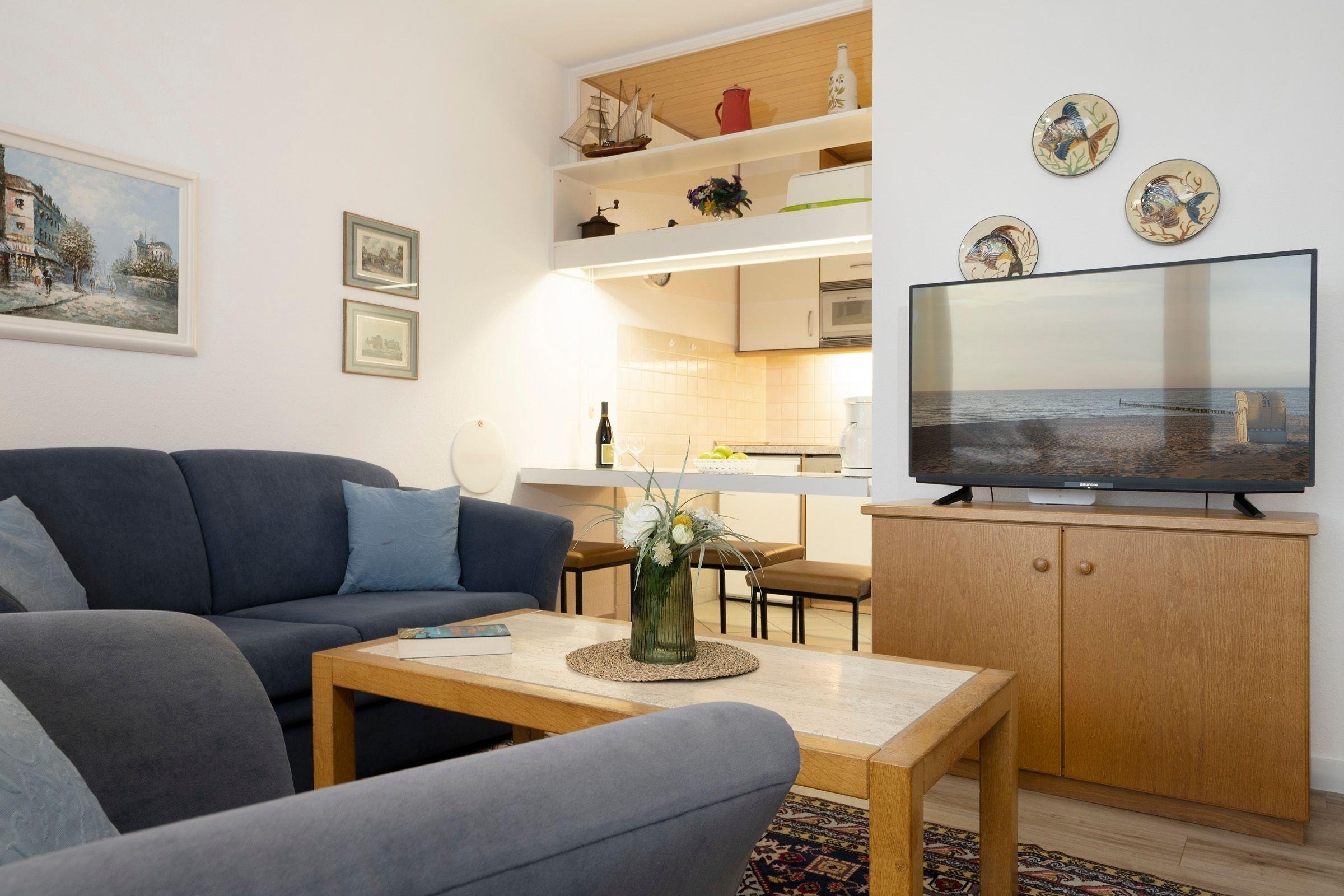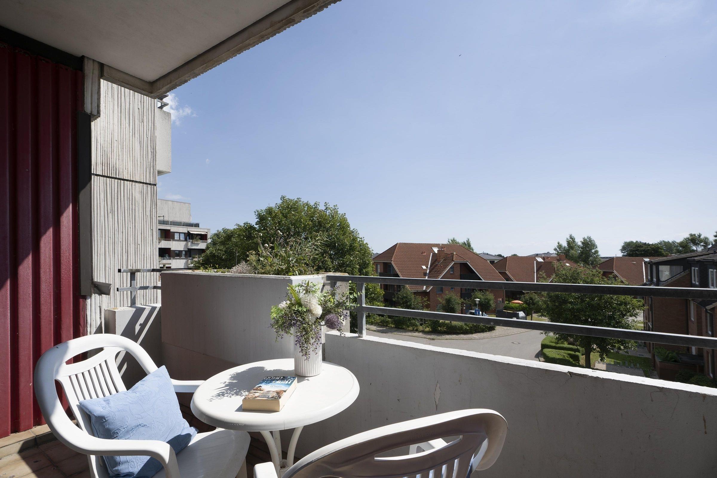 Der gemütlich eingerichtete Wohn- und Schlafbereich ist mit einem Schrankbett (ca. 2x 80x200 cm), einem Sofa und zwei Sesseln sowie einem Fernseher ausgestattet. In der Schrankwand ist ausreichend Platz, um Ihre Urlaubsgarderobe zu verstauen. Des Weiteren verfügt die Wohnung über eine gut ausgestattete Küche mit Küchenbar sowie über ein Badezimmer mit Badewanne. Auf dem möblierten Balkon können Sie morgens den Sonnenaufgang bei einer Tasse Kaffee genießen. Der WLAN-Anschluss ist selbstverständlich inklusive.
