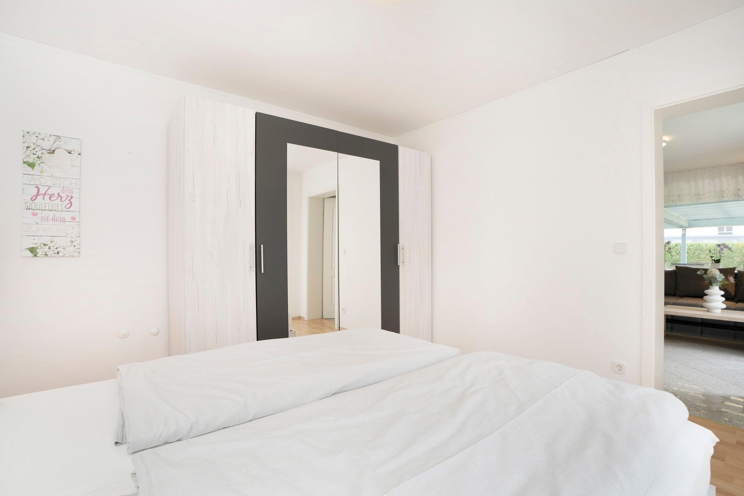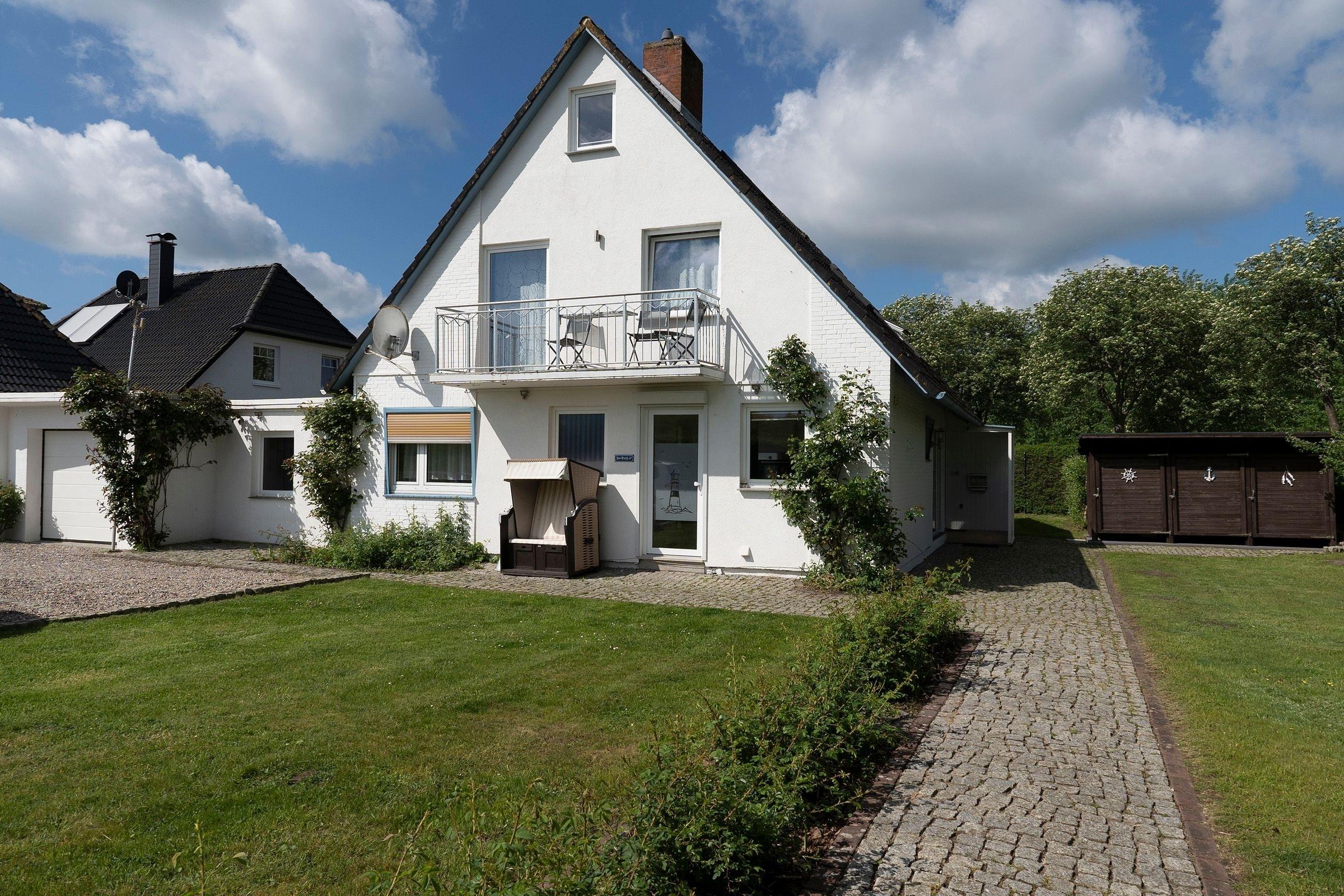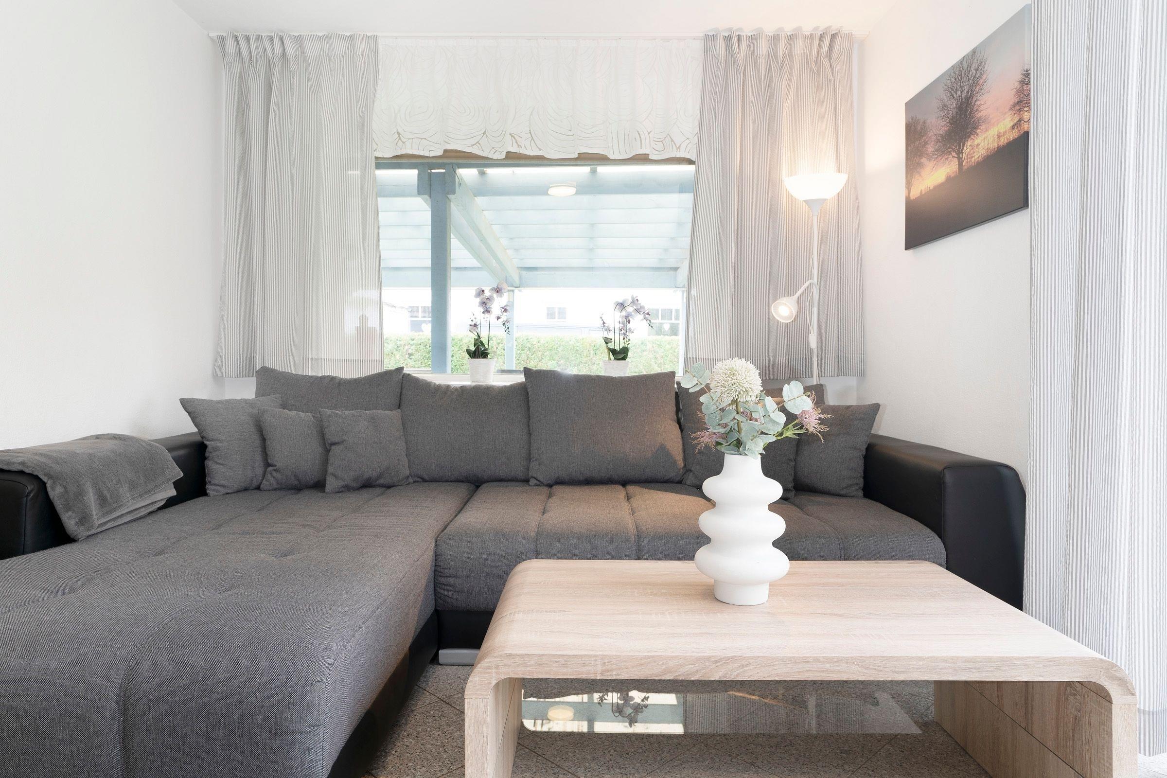 Der lichtdurchflutete Wohnraum ist offen gestaltet - ein Essplatz mit 4 wertigen Stühlen, sowie eine zusätzliche Bank, laden zu geselligen Runden ein und auf der lauschigen Sofalandschaft mit großem Flachbild-TV kann man es sich nach langen Strandtagen gemütlich machen. Von hier aus haben Sie direkten Zugang zum Garten und zwei eigenen Terrassen - eine große überdachte Terrasse und eine weitere mit einem Strandkorb in dem Sie die herrliche Abendsonne genießen können. Das Elternschlafzimmer ist mit komfortablem Doppelbett (2x 80x200 cm), Sideboard und 3-türigem Kleiderschrank ausgestattet, hier gibt es also reichlich Stauraum für Ihre Urlaubskleidung. Das zweite Schlafzimmer ist mit 2 Einzelbetten (je 90x200 cm), Nachttischen und Leseleuchten eingerichtet, zusätzlich hat ein Kinderbett in diesem Zimmer Platz. Von diesem Schlafzimmer aus hat man Zugang zum großen Badezimmer mit Badewanne und Dusche. Beide Schlafzimmer lassen sich durch Außenrollläden abdunkeln. Die Ferienwohnung verfügt zudem über ein weiteres Badezimmer mit Dusche, WC und Wasch-Trockner. Die separate, gut ausgestattete, Küche verfügt über Annehmlichkeiten wie eine Senseo-Kaffeemaschine, eine Kühl-Gefrierkombination und eine Spülmaschine. Von der Küche führt ebenfalls eine Tür direkt in den Garten.