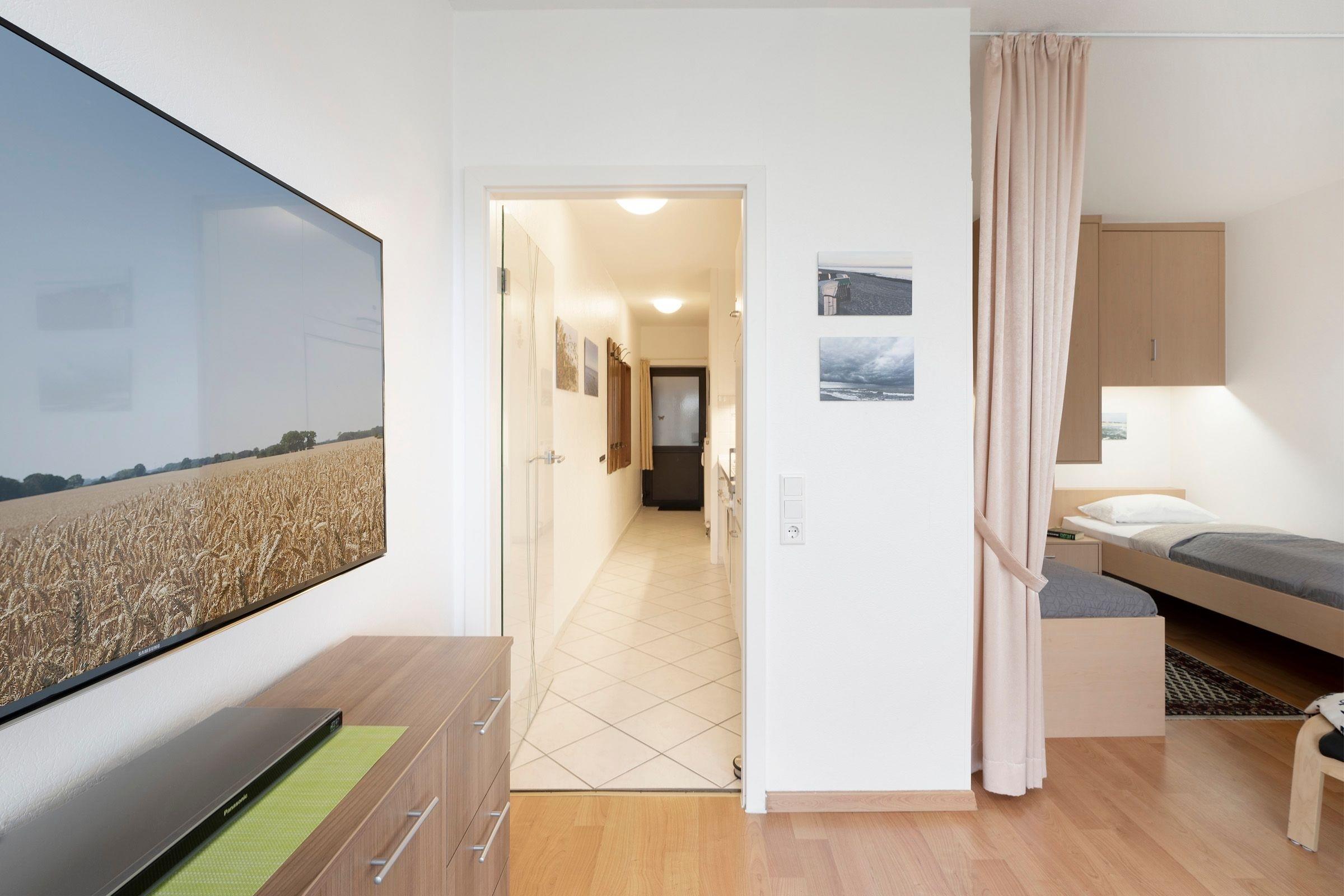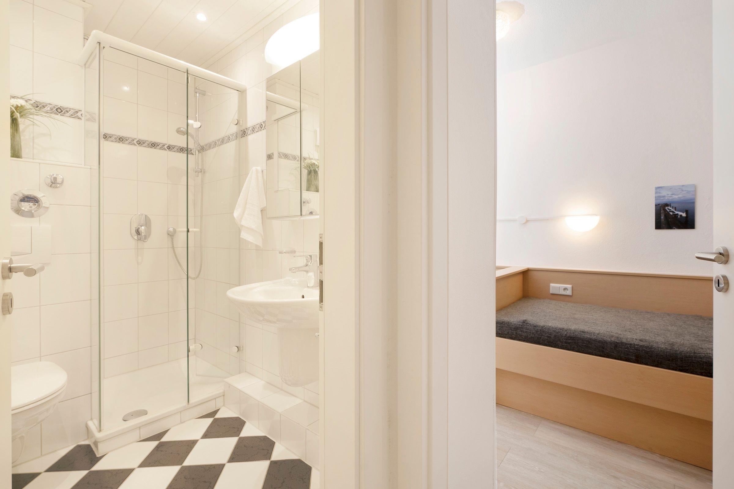 Mehr Ostsee geht kaum: Die Wohnung liegt nur rund 50 Meter vom Strand entfernt - und vom Balkon aus können Sie den Blick auf das zauberhafte Meer sowie die schöne Promenade genießen. Auch die durchdachte Aufteilung des Wohn/Schlafbereichs wird Sie begeistern: Am Fenster vorn befindet sich ein gemütlicher Essplatz, im hinteren Bereich stehen zwei Einzelbetten (je 90x190 cm). Alles ist hell und freundlich eingerichtet. Die offene Küche ist gut ausgestattet und ermöglicht eine angenehme Selbstverpflegung. Das Kinderzimmer ist ebenfalls mit zwei Einzelbetten (je 90x200 cm) ausgestattet. Das moderne Duschbad ist hell gefliest.