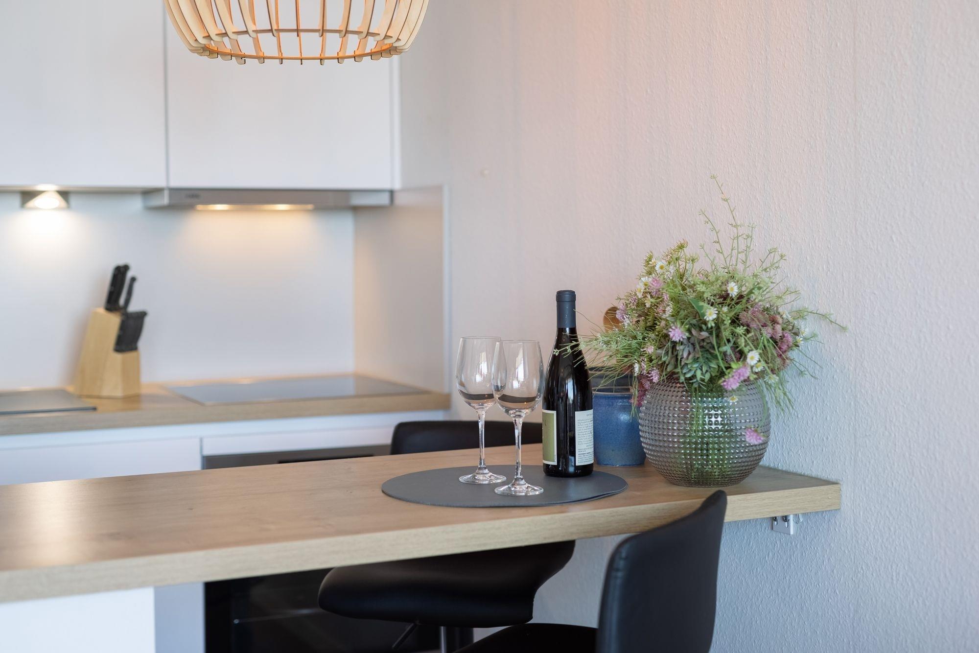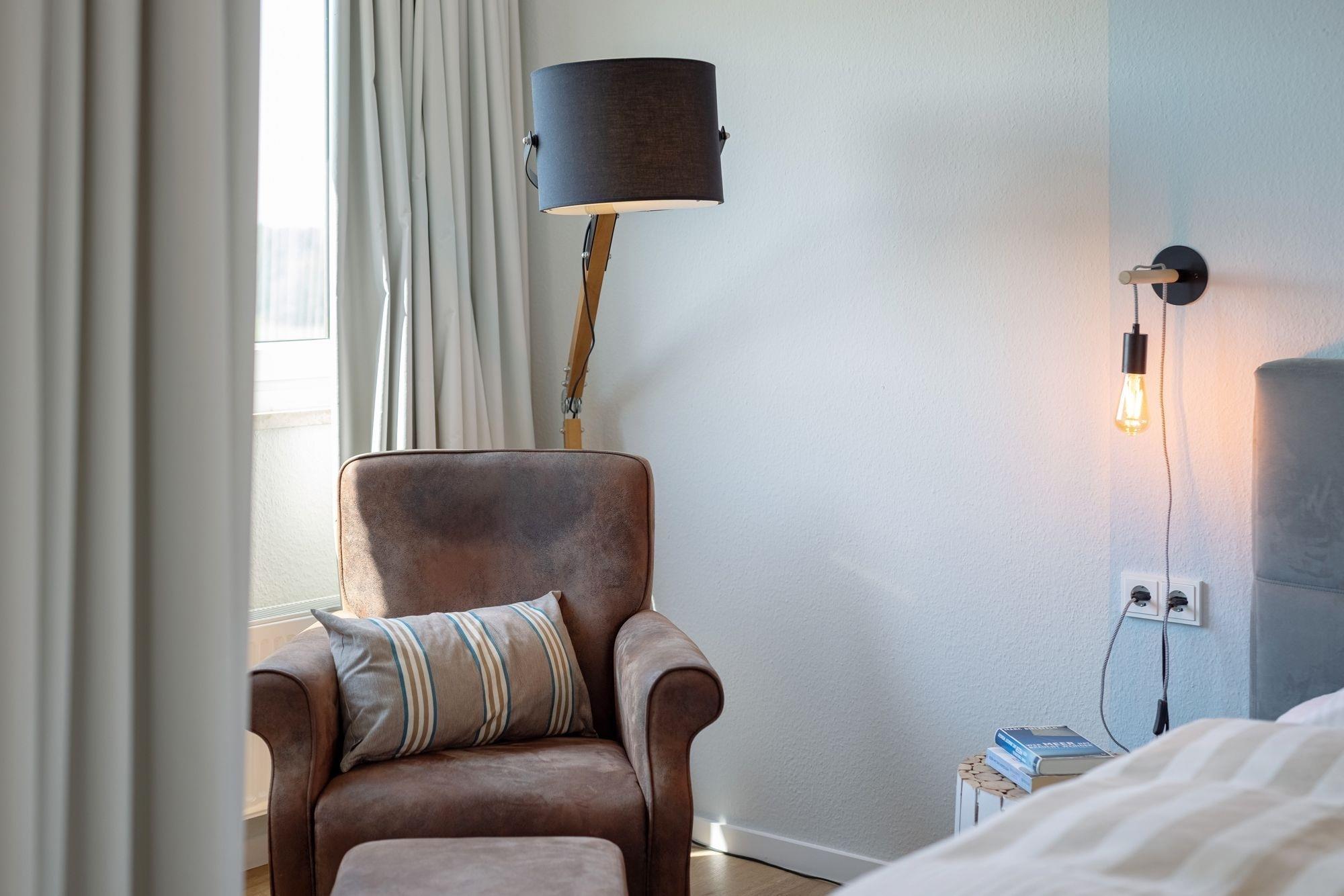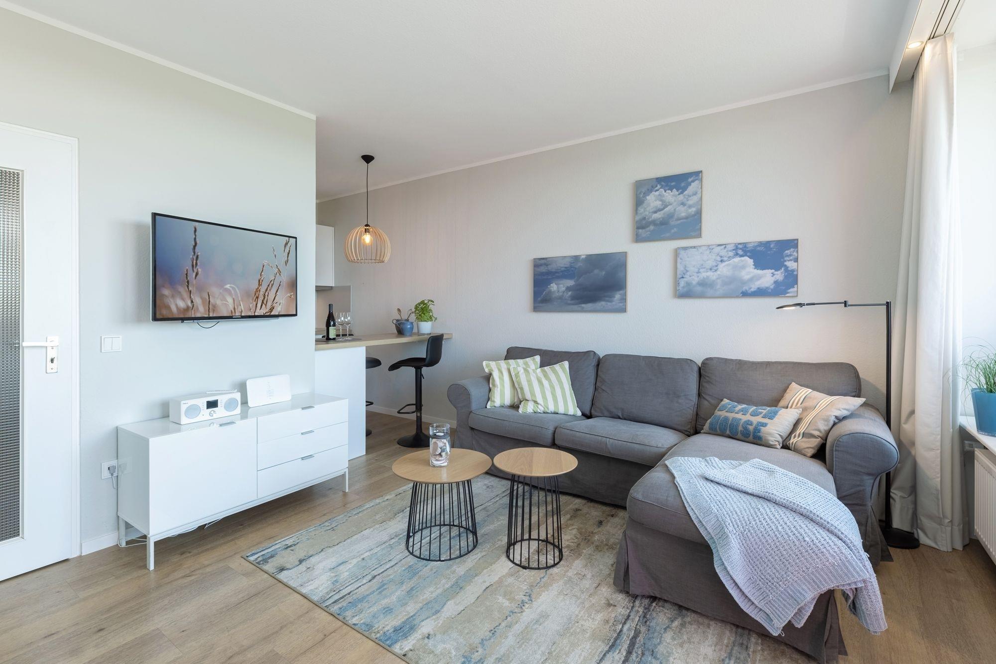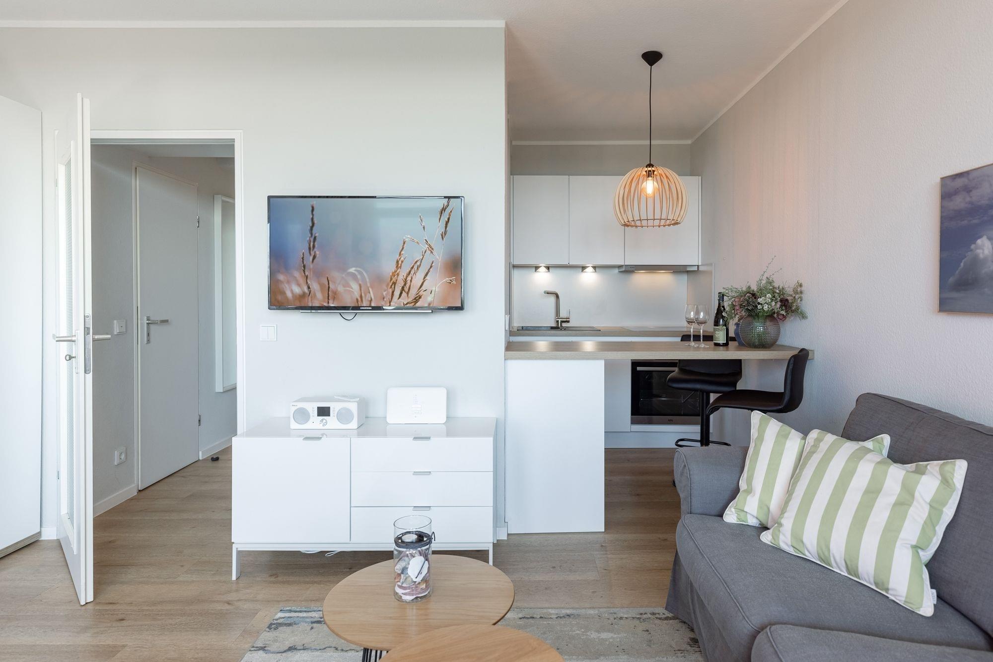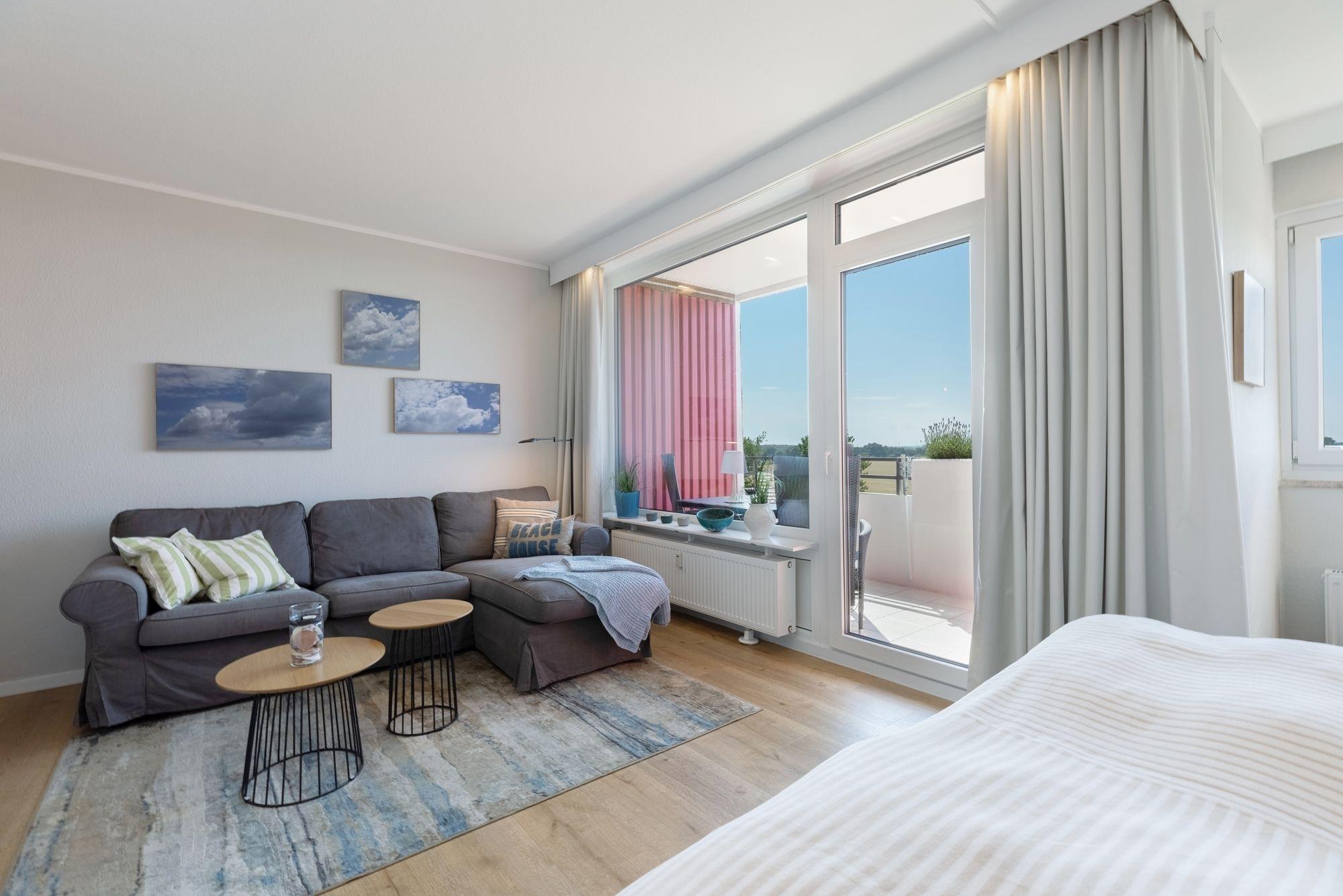 Die hochwertige Ausstattung dieser Ferienunterkunft ist harmonisch aufeinander abgestimmt. Der geschmackvoll und modern eingerichtete Wohn- und Schlafraum mit Boxspring-Doppelbett (180x200 cm, durchgehender Topper), Sofa, Flachbildfernseher sowie kleiner, gut ausgestatteter Küche lässt Sie einen traumhaften Urlaub verbringen. Das innenliegende Badezimmer erwartet Sie mit einer Dusche. Abends können Sie vom Balkon aus den Sonnenuntergang genießen.