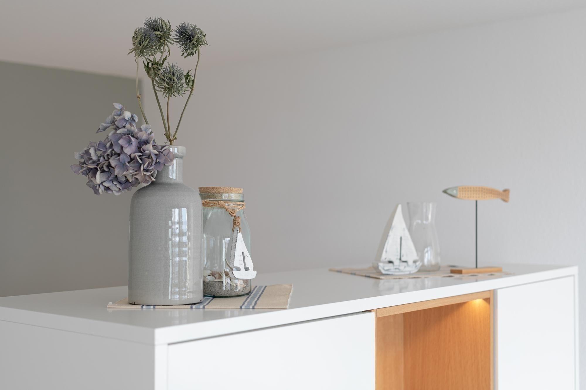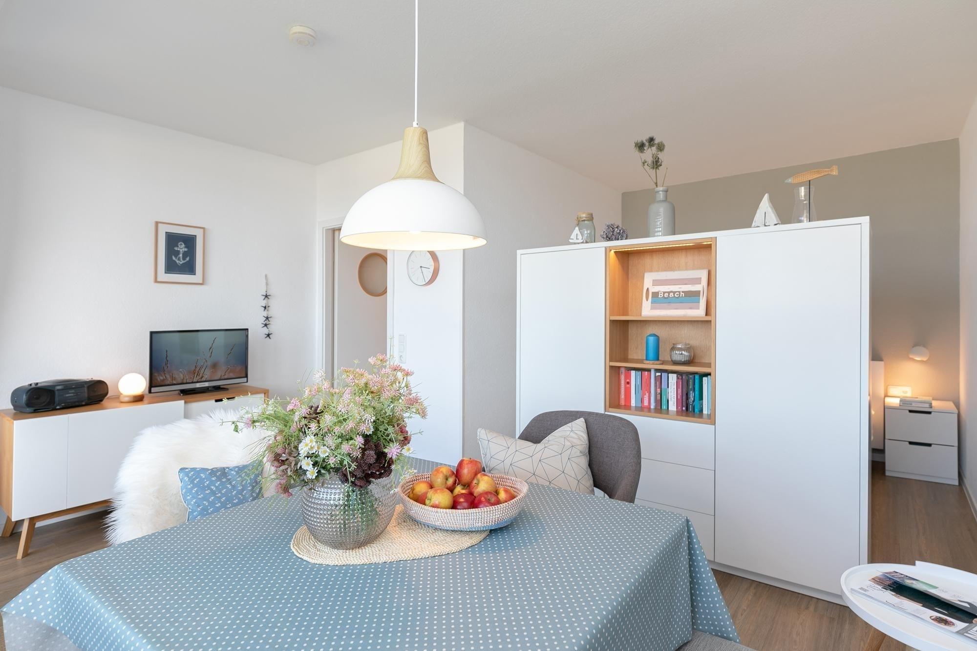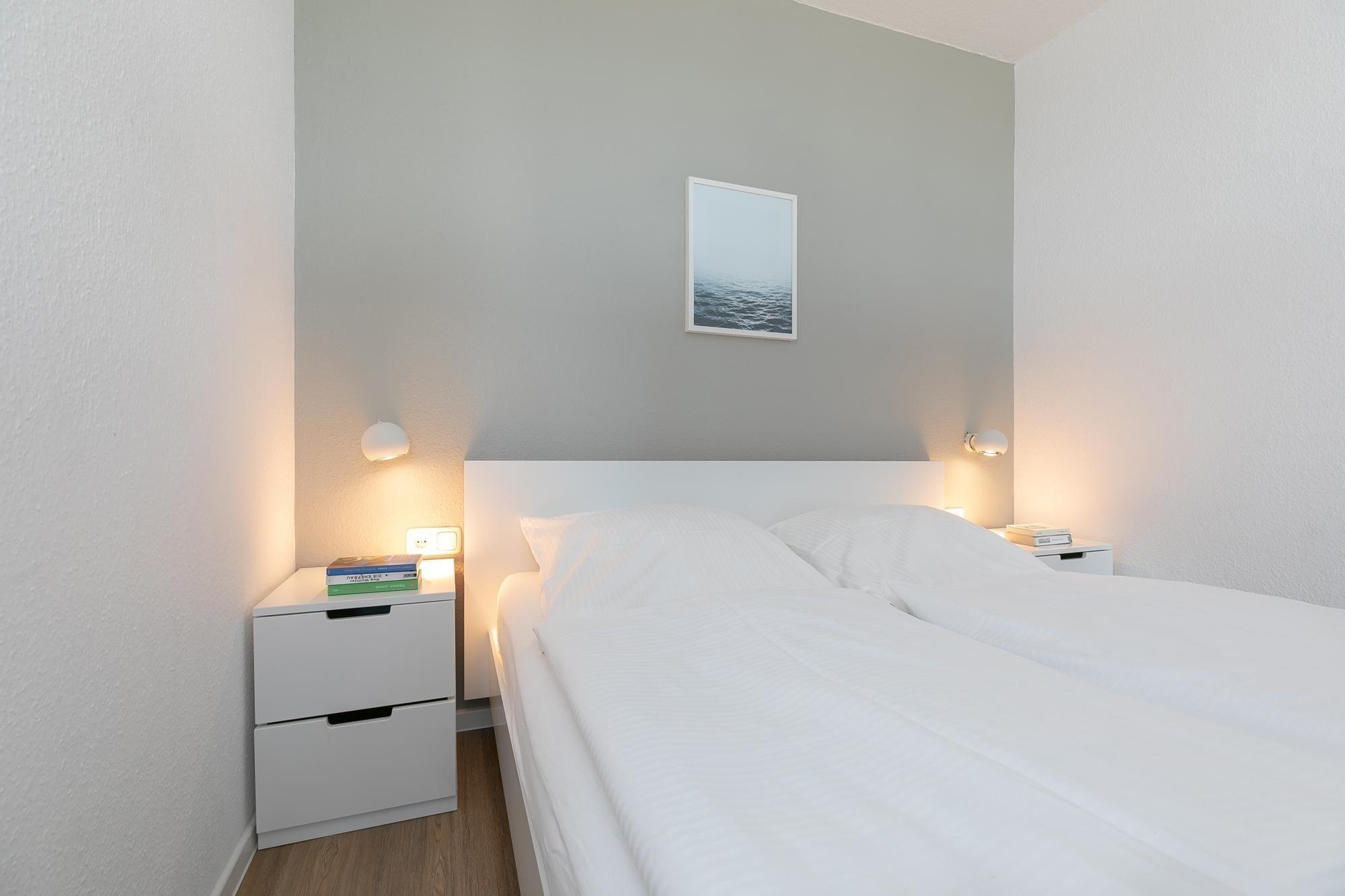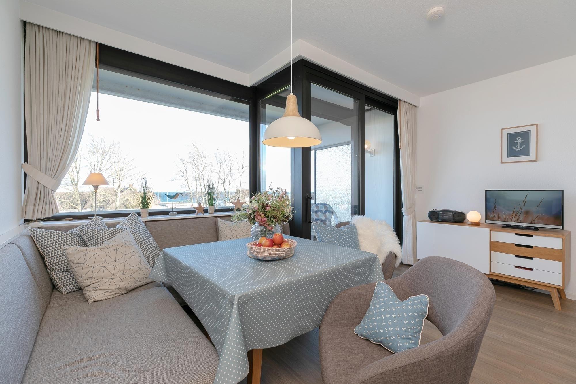 Schöne Urlaubstage verspricht der moderne, helle Wohn-Schlafraum mit Doppelbett (2x 90x200 cm), Sitzecke mit großzügiger Eckbank sowie einer wunderbaren Aussicht auf das Meer. Von hier aus gelangen Sie auch auf den überdachten Balkon, auf dem Sie Ihr morgendliches Frühstück bei Morgensonne ausgiebig genießen können. Die Küche mit Spülmaschine bietet als Highlight eine Nespresso-Kapselmaschine für den besonderen Kaffeegenuss. Das modernisierte Duschbad und ein weiteres Schlafzimmer mit zwei Einzelbetten (90x190 cm) sowie Spiele, Bücher, WLAN und TV lädt Paare und Familien gleichermaßen ein.
