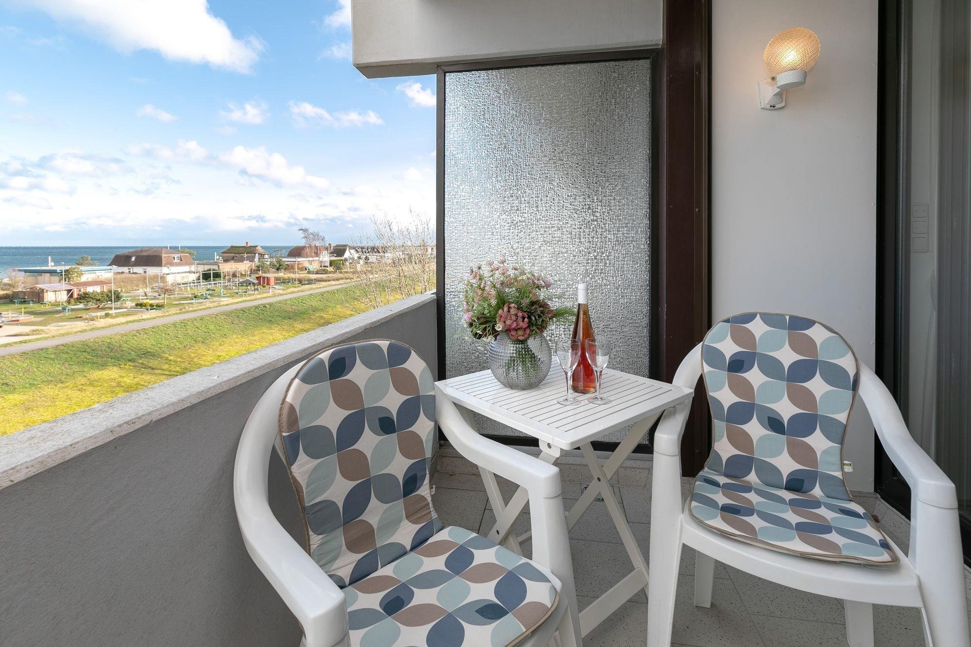 Moderne Ferienwohnung in Dahme mit Meerblick, Balkon und Zugang zu Schwimmbad und Sauna.