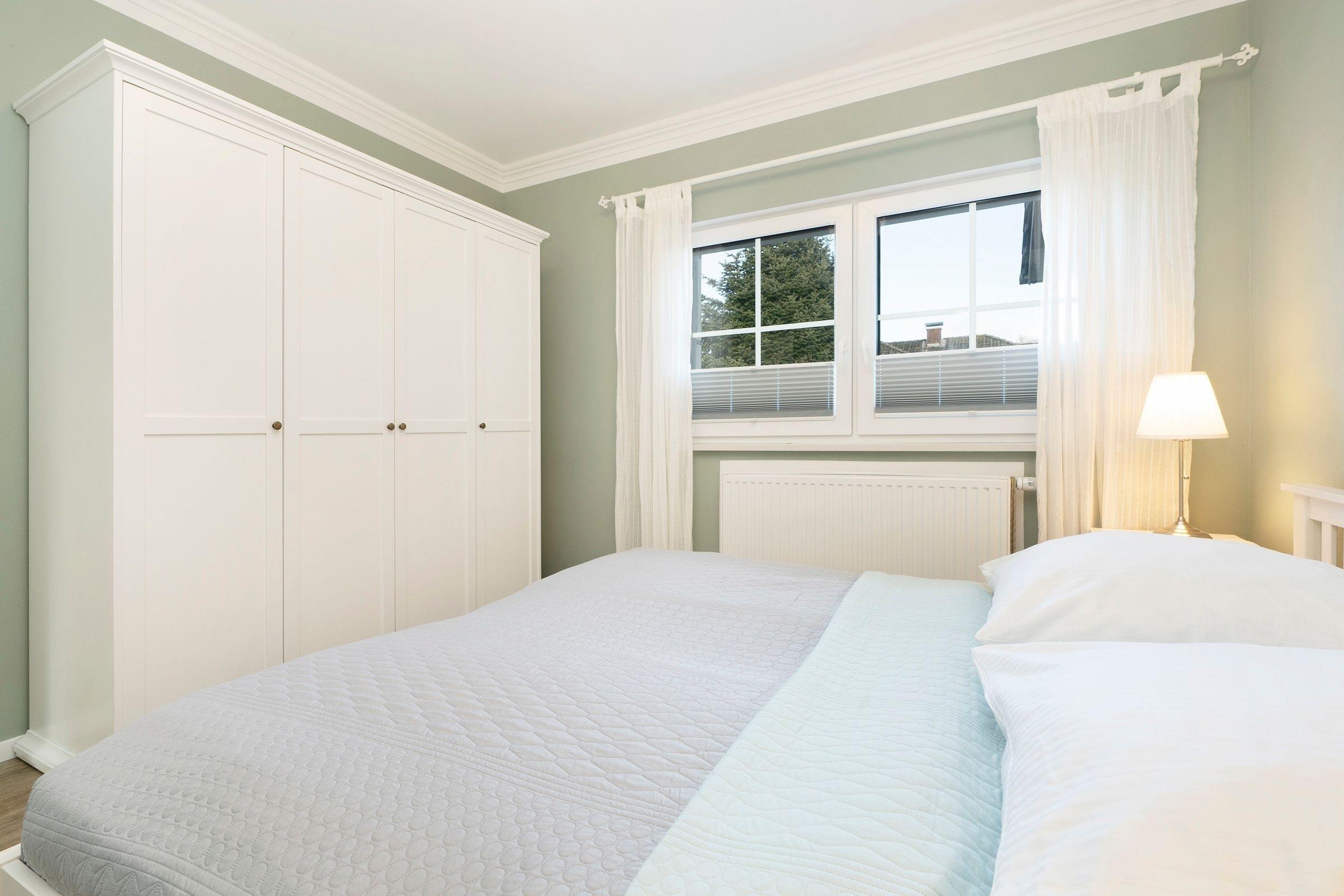 Schlafzimmer: 1 Doppelbett (2x 90x200 cm), Kleiderschrank, Lichtschutz (Plissee)