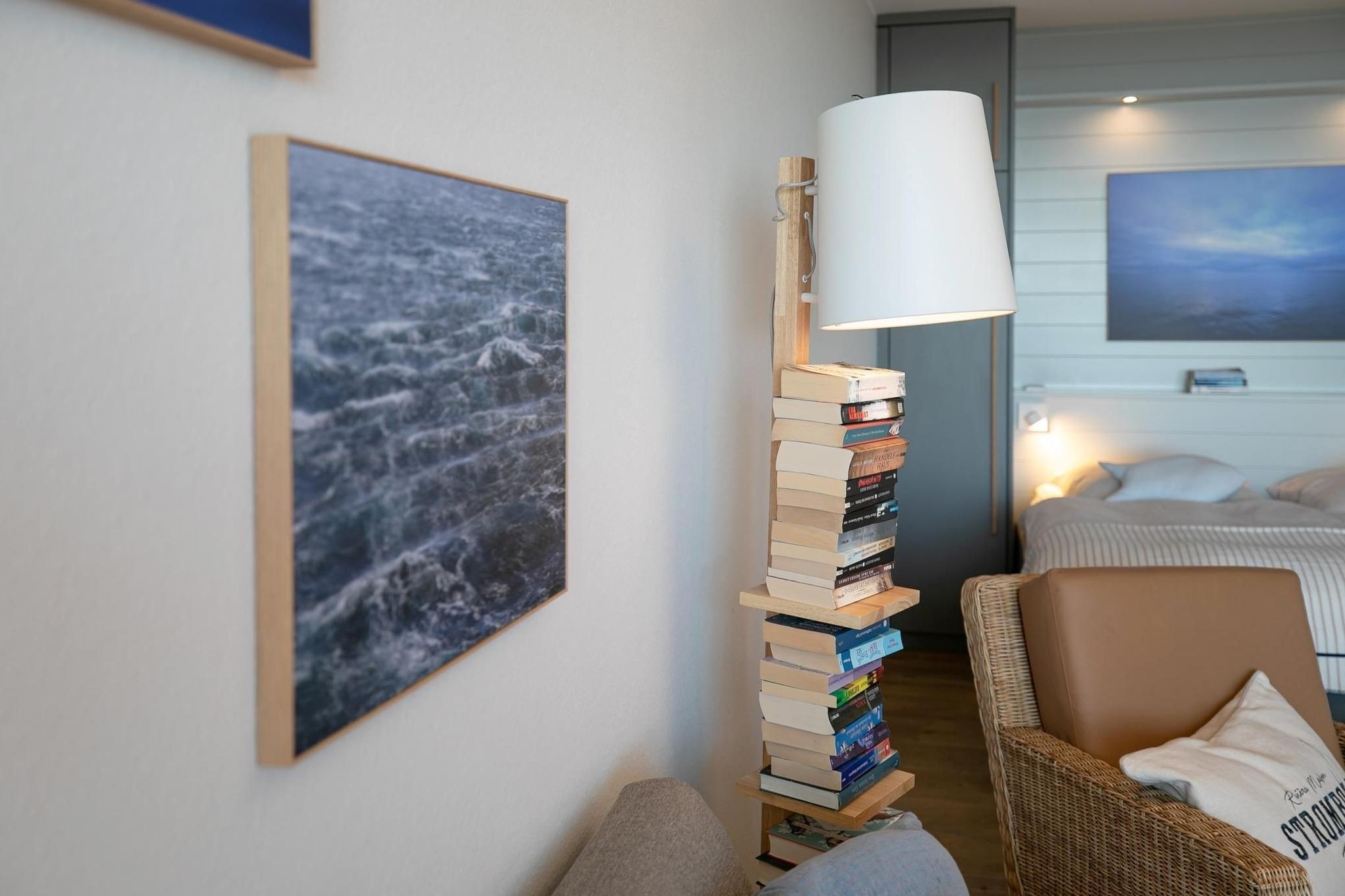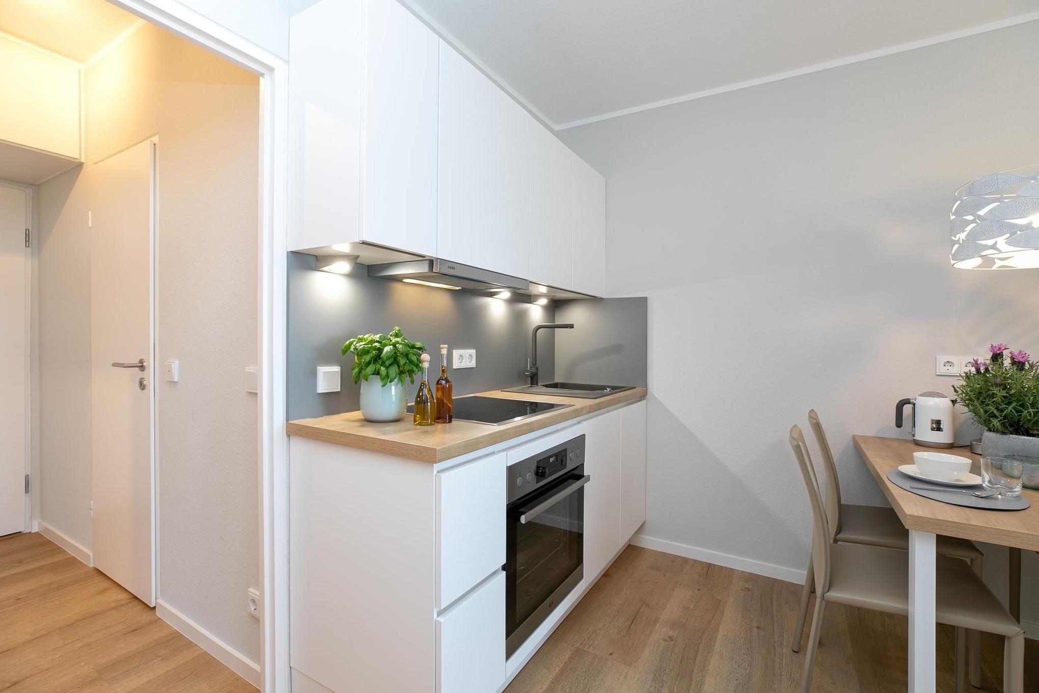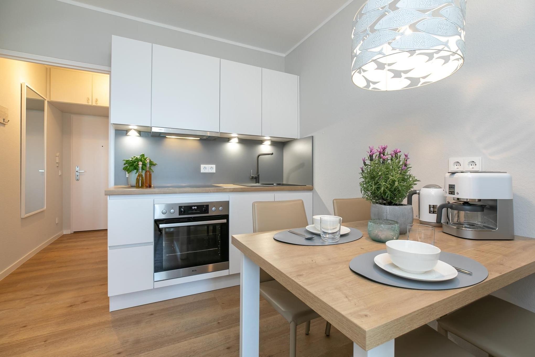 Es erwarten Sie ein kombinierter Wohn- und Schlafraum mit einem komfortablen Ecksofa, einem Flachbildfernseher, einem Boxspring-Doppelbett (180x200 cm) sowie eine voll ausgestattete Küche. Das separate Schlafzimmer verfügt über ein französisches Doppelbett (140x200 cm) und einen Kleiderschrank. Das moderne Badezimmer ist mit einer Dusche ausgestattet. Verbringen Sie viele Sonnenstunden auf dem überdachten, möblierten Balkon mit Fernblick auf die Ostsee.
