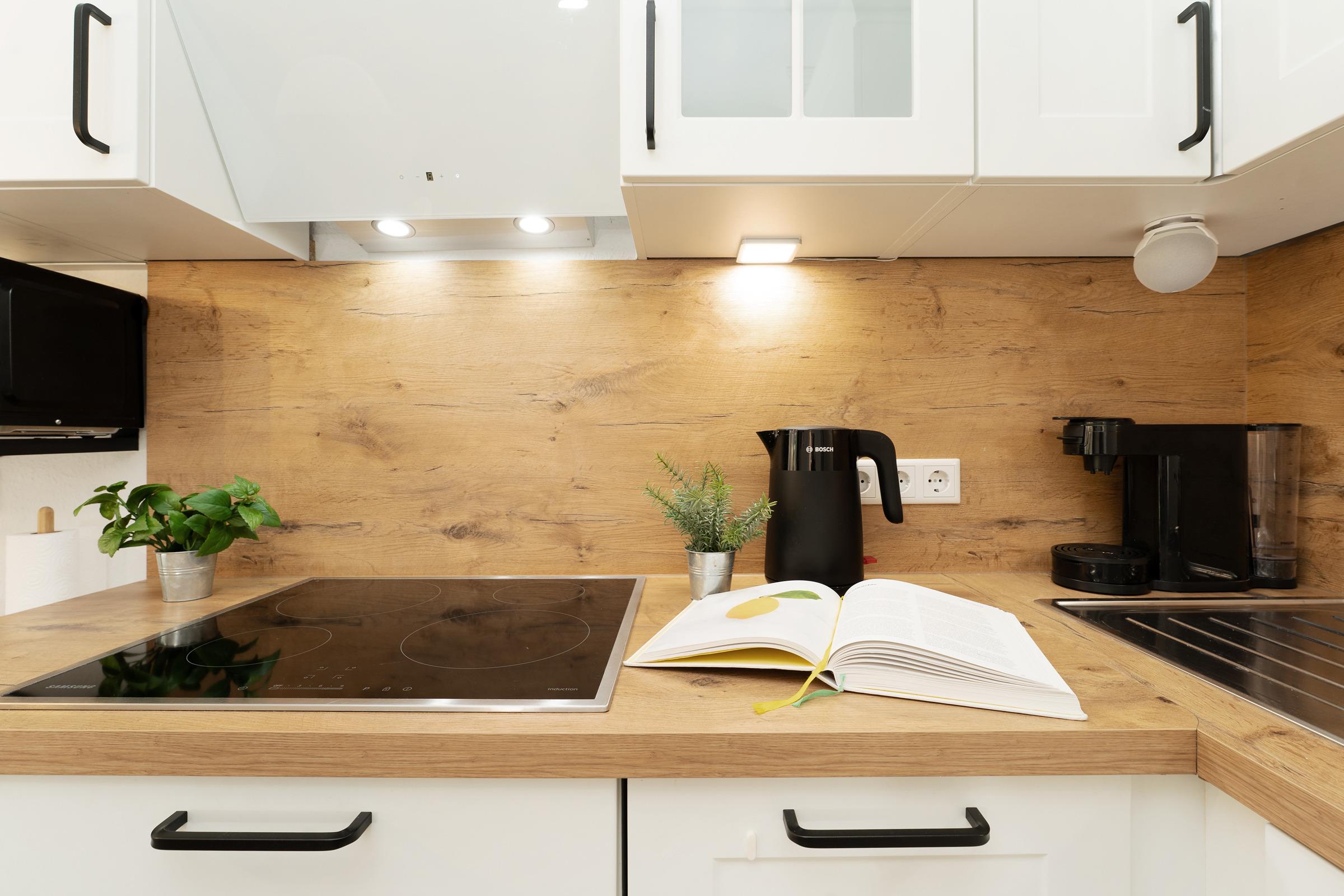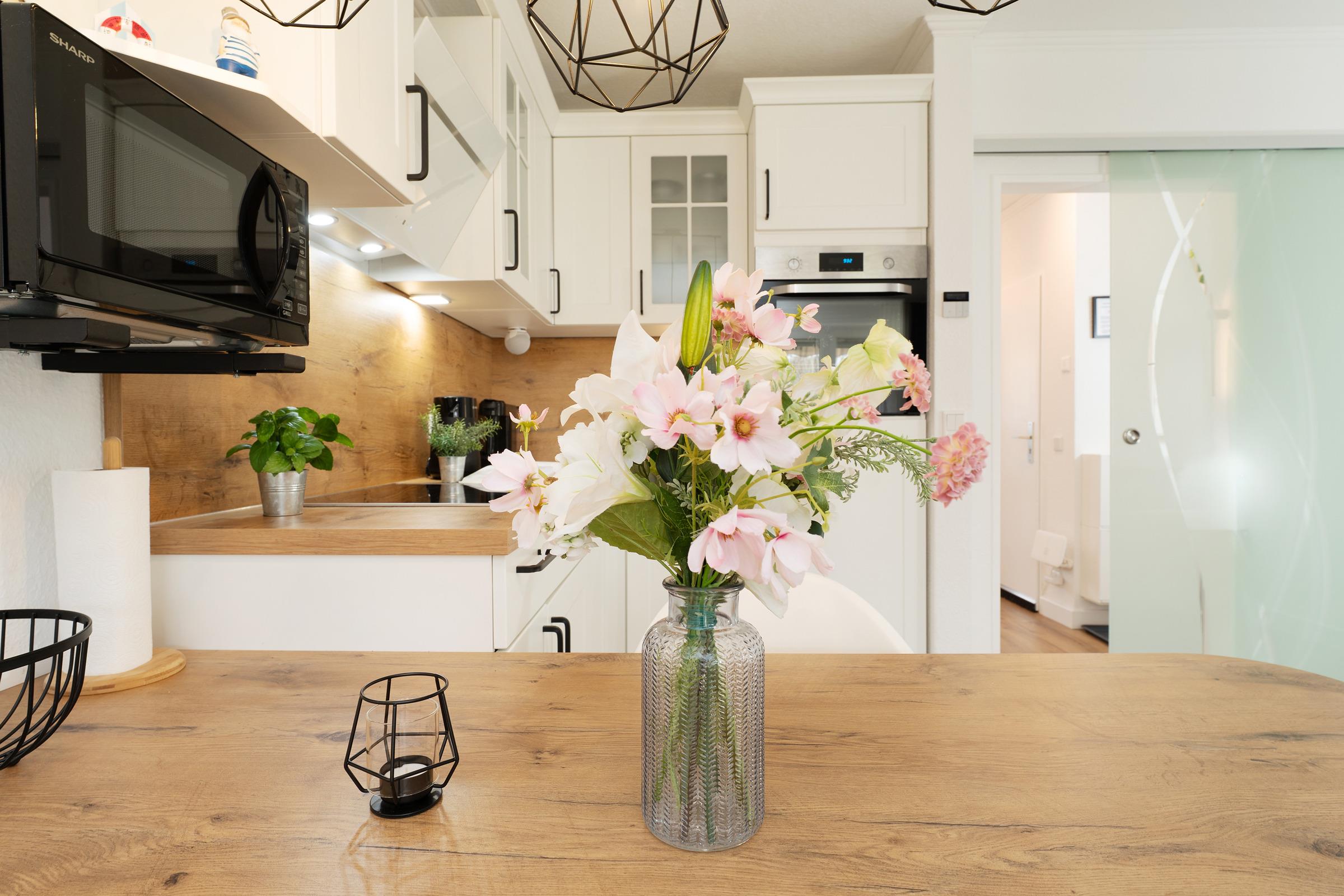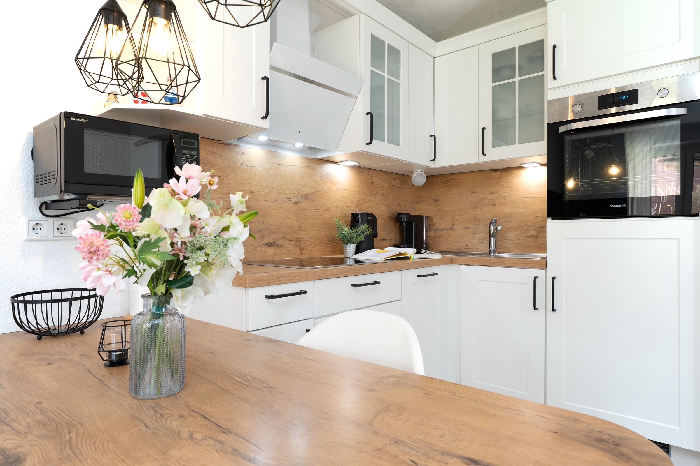 Herzstück der Wohnung ist der helle und offene Wohnbereich mit integriertem Essplatz für vier und angrenzender Küche. Alltagshelfer wie Induktionsherd, Backofen in angenehmer Arbeitshöhe, Mikrowelle und Spülmaschine sorgen für gute Laune, mit Blick ins Grüne kann man hier leckere Ferienmahlzeiten zaubern. Entspannen Sie im Wohnbereich auf bequemem Sofa und Sessel, ein Flatscreen-TV bietet elektronische Unterhaltung in HD-Qualität. Natürlich steht den Gästen auch ein kostenfreier WLAN-Anschluss zur Verfügung. Das hochwertige Schlafsofa offeriert einen weiteren gemütlichen Schlafplatz für zwei (Liegefläche 160x200 cm). Das Wohnzimmer führt direkt auf die möblierte Terrasse mit angrenzendem Gartenstück, hier lässt es sich wunderbar in der Morgensonne frühstücken oder abends entspannt den Tag ausklingen. Für gesellige BBQ Abende ist ein Elektrogrill vorhanden.