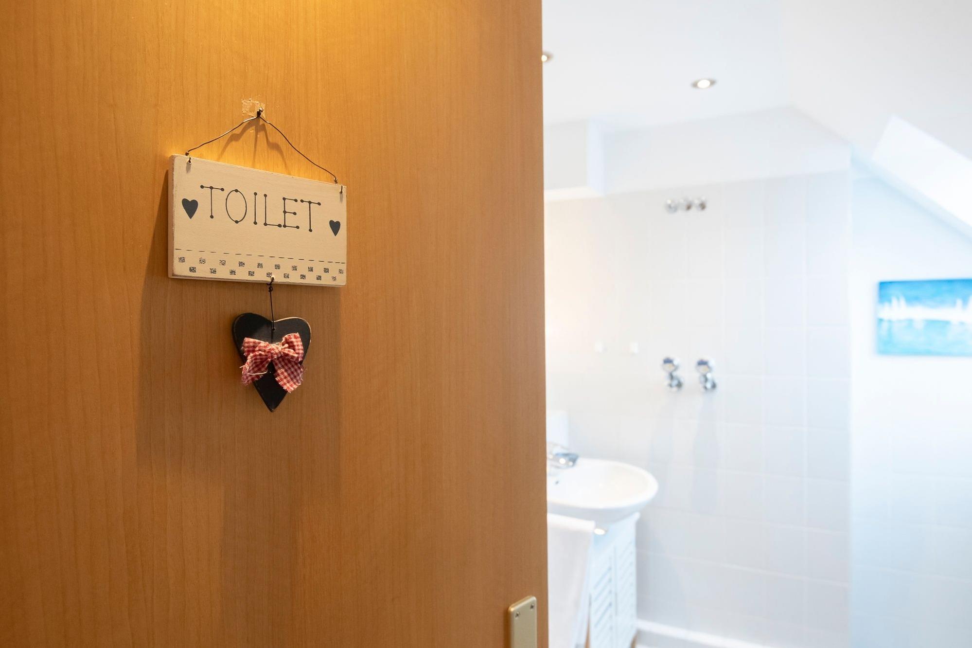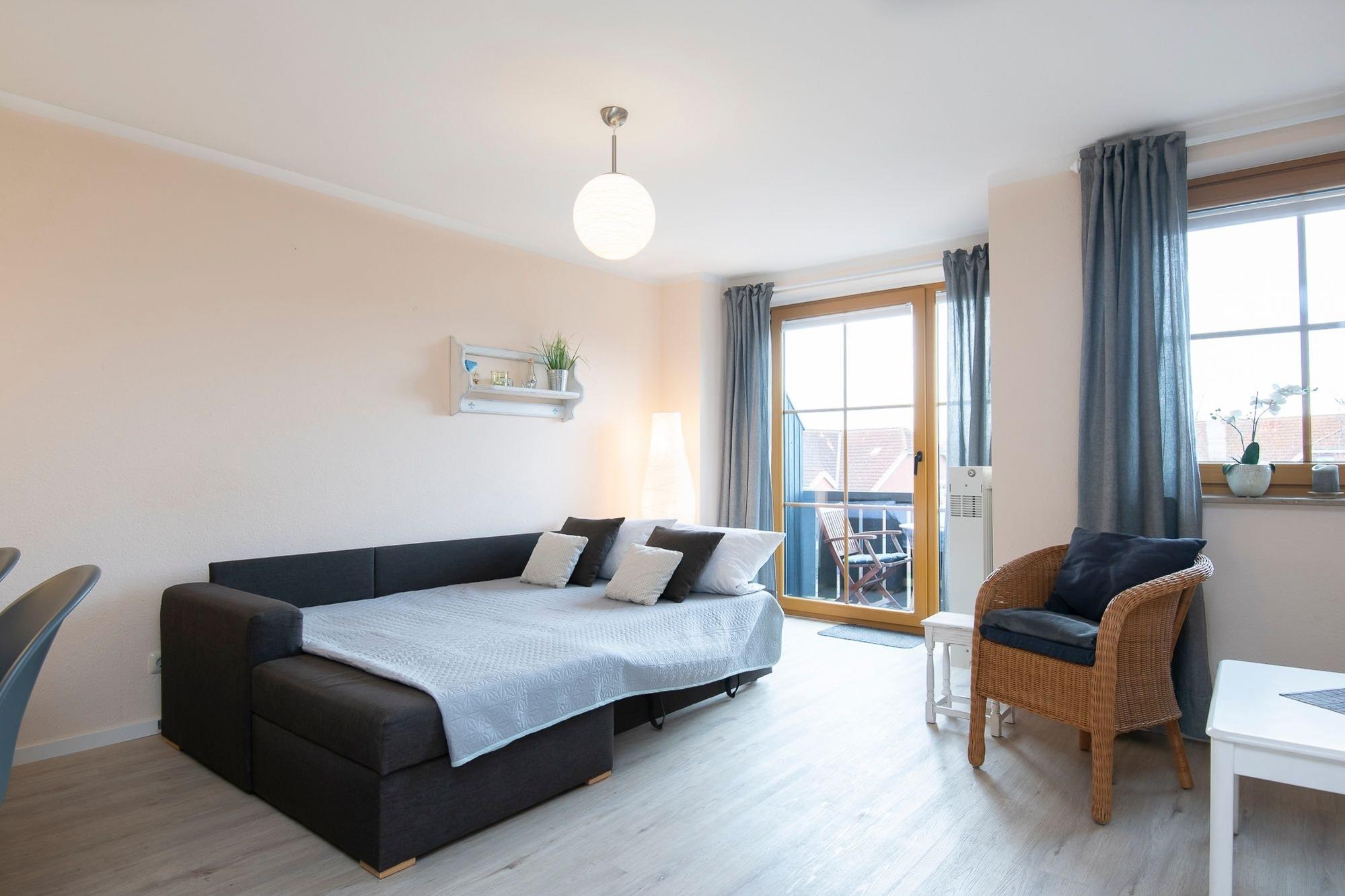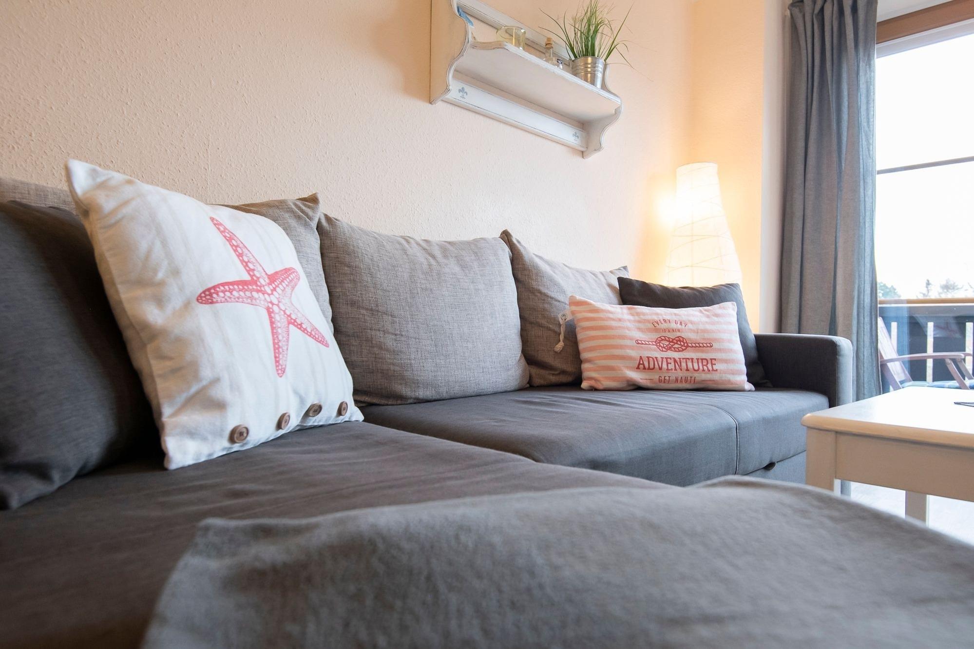 Das geschmackvolle Wohnzimmer mit integrierter Küche bildet das Herzstück dieser Ferienimmobilie. Das komfortable Sofa lädt am Tag zu gemütlichen Stunden vor dem Flachbild-Fernseher ein und verwandelt sich zur Nacht in einen bequemen Schlafplatz für Zwei (160x200 cm). Streamen Sie Ihre Lieblingsmusik über den kostenlosen WLAN-Anschluss und bleiben Sie auch im Urlaub erreichbar. Bekochen Sie sich und Ihre Lieben in der modernen, offenen Küche und genießen Sie die gezauberten Köstlichkeiten am Esstisch mit ausreichend Platz für alle Urlaubsgäste. Vom Wohnbereich aus haben Sie Zugang zum Süd-Westbalkon, auf dem Sie die Abende bei einem schönen Glas Wein entspannt ausklingen lassen können. Im separaten Schlafzimmer mit Doppelbett (180x200 cm) erholen Sie sich von einem ereignisreichen Urlaubstag. Hier können Sie dann eine Tasse frischen Morgenkaffee auf dem zweiten möblierten Balkon genießen. Ein weiteres Schlafzimmer mit 2 Einzelbetten (je 90x190 cm) und charmanten Dachschrägen wird Ihnen behagliche Nächte bescheren. Eine wohltuende Dusche im hell gefliesten Bad lässt Sie erfrischt in den neuen Urlaubstag starten.