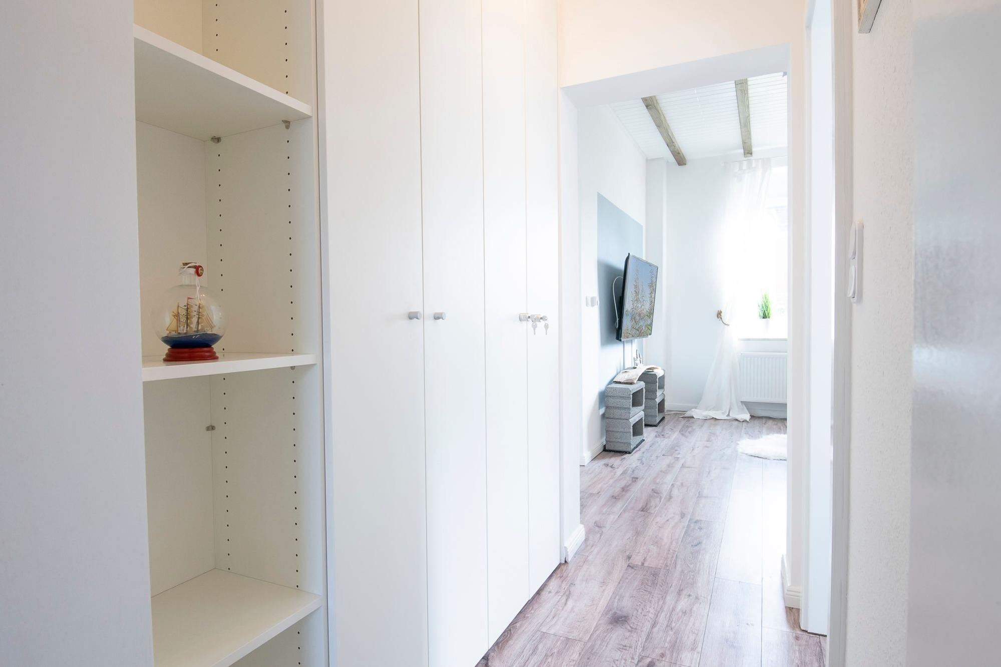 Hell und freundlich begrüßt Sie eine moderne vollausgestattete Küche, die u.a. mit Induktionsherd, Backofen und Spülmaschine ausgestattet ist und das Herz von Hobbyköchen höher schlagen lässt. Anschließend eröffnet sich Ihnen das heimelige Wohnzimmer mit TV inklusive Chromecast und Sofa, welches sich mit wenigen Handgriffen in eine bequeme Schlafstätte (150x200 cm) verwandeln lässt. Über den kostenlosen WLAN-Anschluss bleiben Sie auch im Urlaub erreichbar und können erste Schnappschüsse nach Hause schicken. Von hier haben Sie auch Zugang zur möblierten Terrasse mit angrenzendem Gemeinschaftsgarten. Für lauschige Abende ist dies genau das richtige Plätzchen zum Entspannen. Durch einen kleinen Flur gelangen Sie ins separate Schlafzimmer mit großem einladenden Doppelbett (2x 90x200 cm) und Kleiderschrank für Ihre Garderobe. Sowohl das Schlafzimmer, als auch das Wohnzimmer lassen verdunkeln und versprechen eine ungestörte Nachtruhe. Über den Flur erreichen Sie ebenfalls das Tageslichtbad, das mit Dusche und Fön die Ausstattung dieses Feriendomizils komplettiert.
