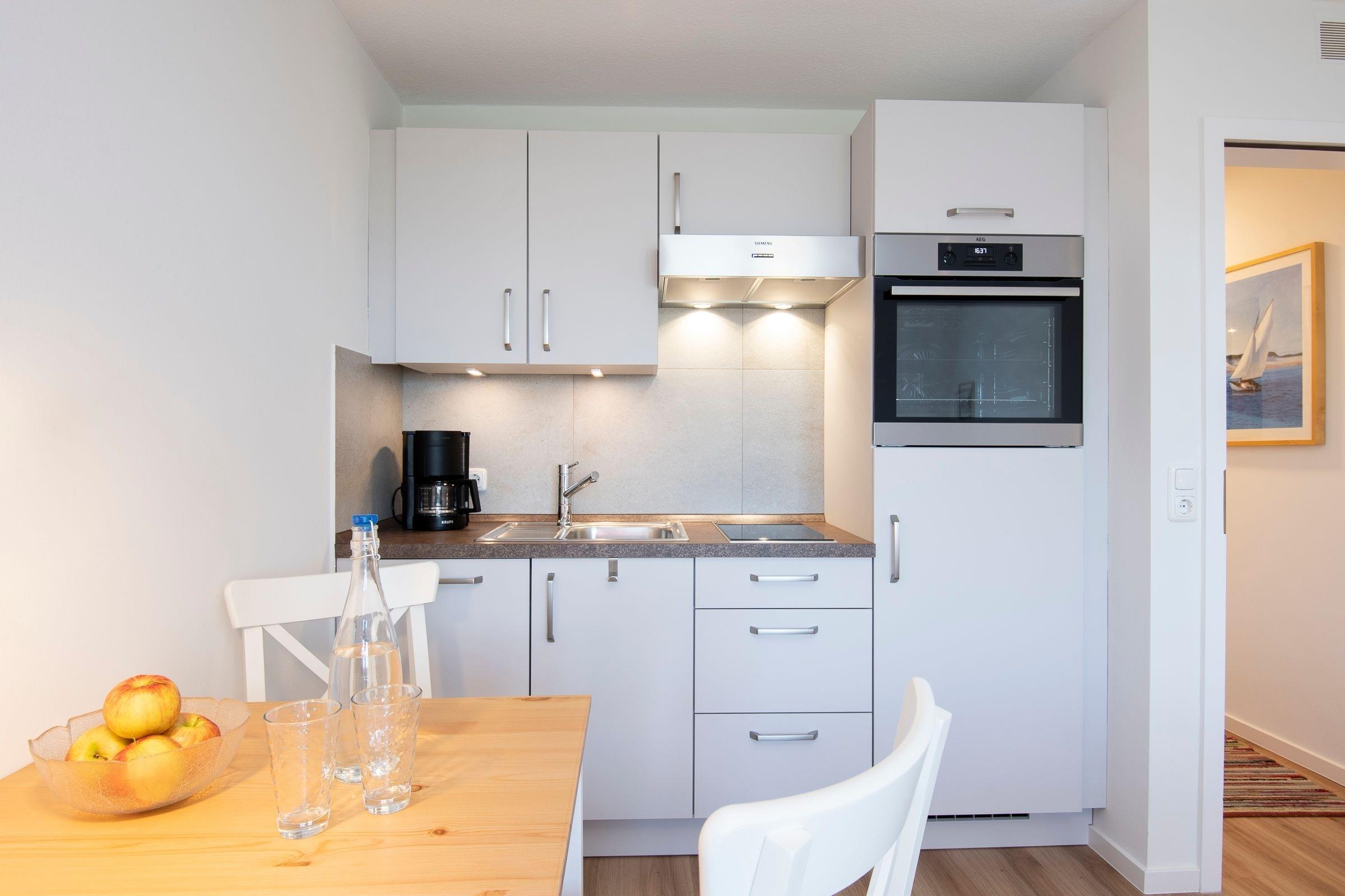 Diese Ferienwohnung ist mit einer Wohnfläche von ca. 26 m² ein wahres Raumwunder. Die gesamte Einrichtung ist bestens durchdacht und harmonisch aufeinander abgestimmt. Der kombinierte Wohn- und Schlafbereich verfügt über ein komfortables Doppelbett (2x 80x200 cm), einen Kleiderschrank und eine Garderobe für Ihre Kleidung sowie über einen großen Flachbildfernseher. Ebenfalls vorhanden sind ein Esstisch mit 2 Stühlen und eine kleine Küchenzeile mit hellen Fronten. Die Küche ist mit allen Notwendigkeiten ausgestattet, die Sie im Urlaub benötigen. Hier finden Sie z. B. einen Induktionsherd mit 2 Kochfeldern, einen Backofen und einen Kühlschrank sowie einen Geschirrspüler vor. Das innenliegende, hell geflieste Badezimmer ist ebenfalls modern eingerichtet und erwartet Sie mit einer Dusche, einem WC und einem Waschbecken. Weiterhin sind ein schmales Regal für Ihre Badutensilien und ein beheizbarer Handtuchhalter vorhanden. Der WLAN-Anschluss ist selbstverständlich inklusive.