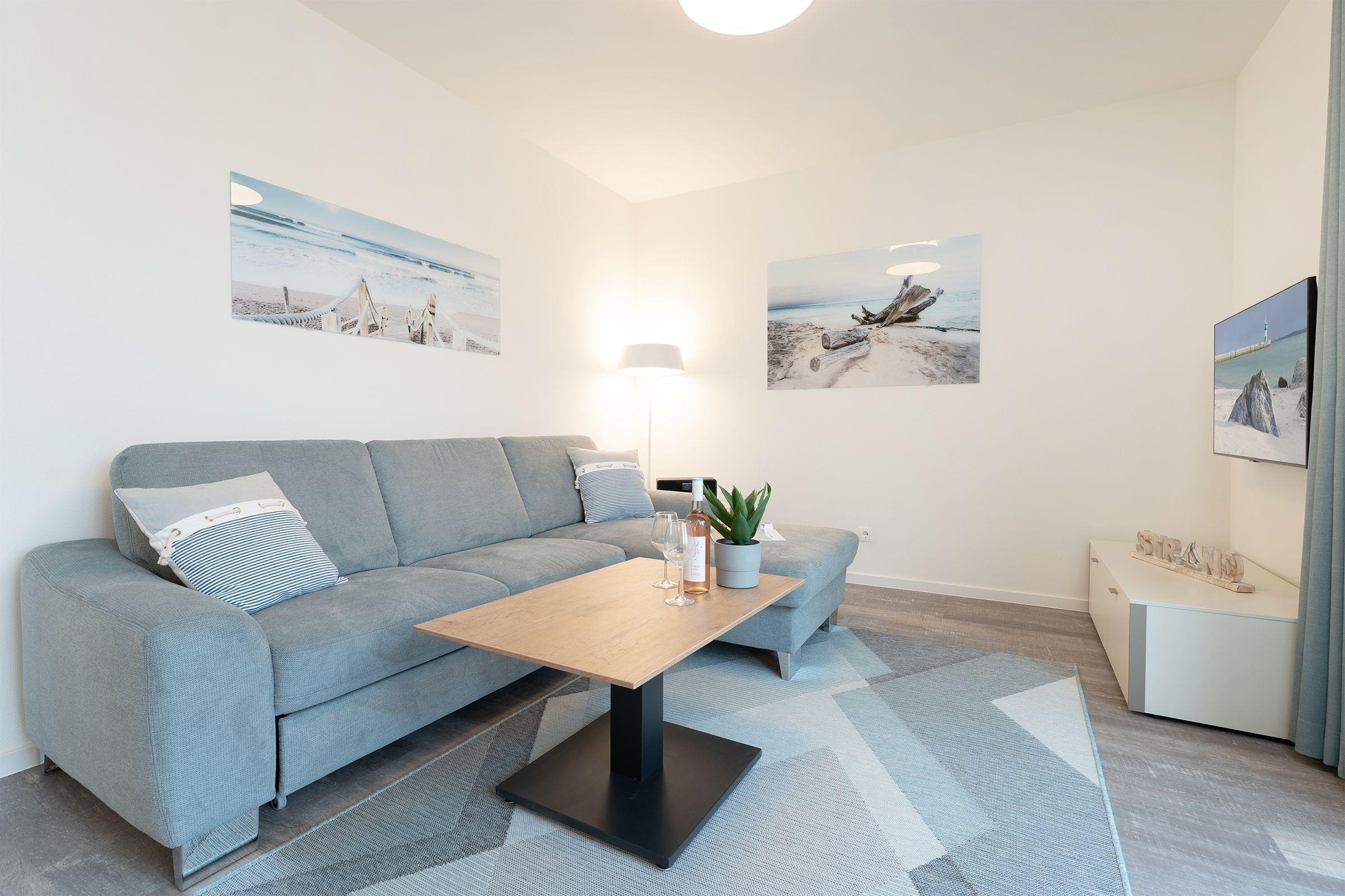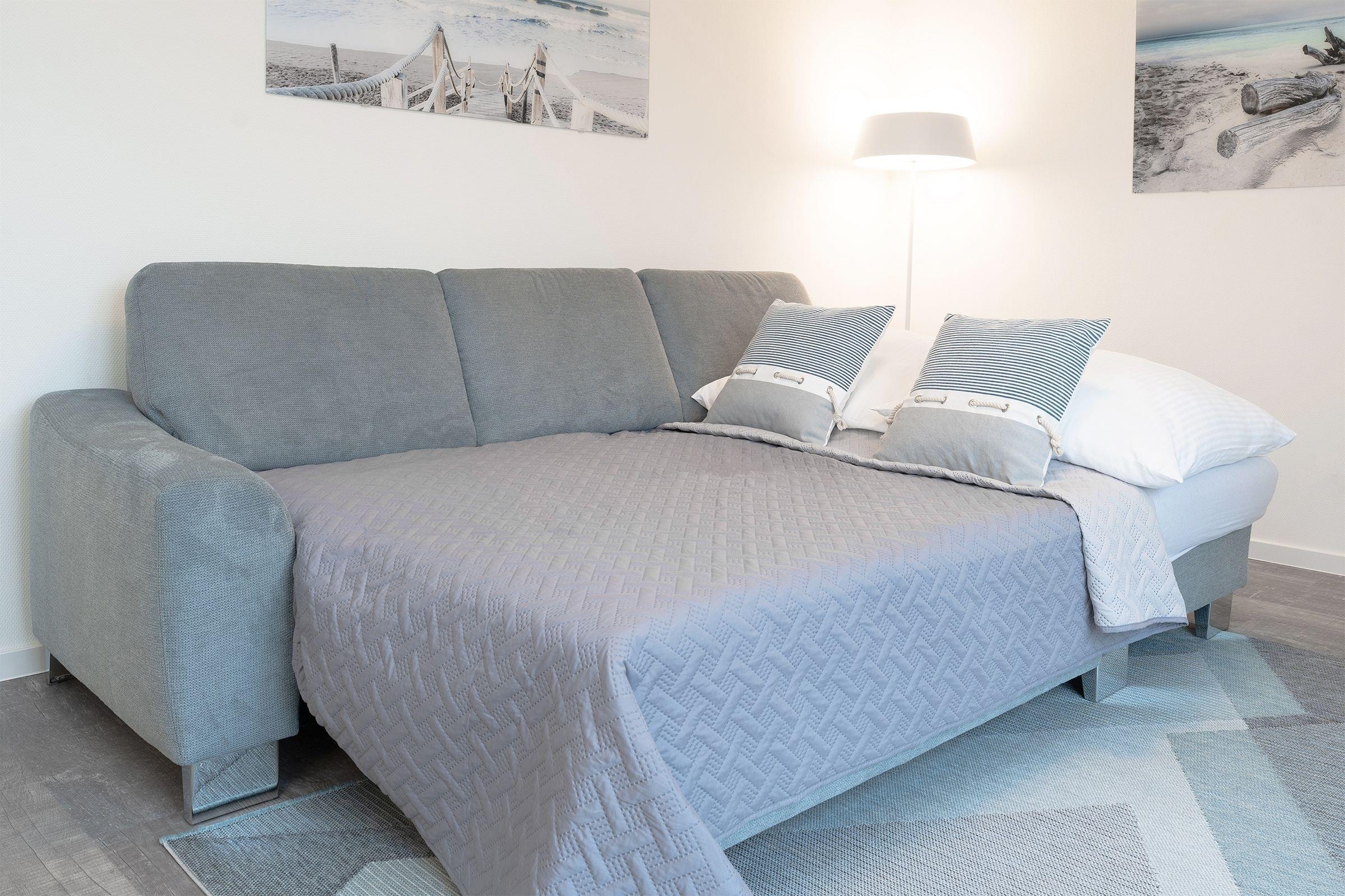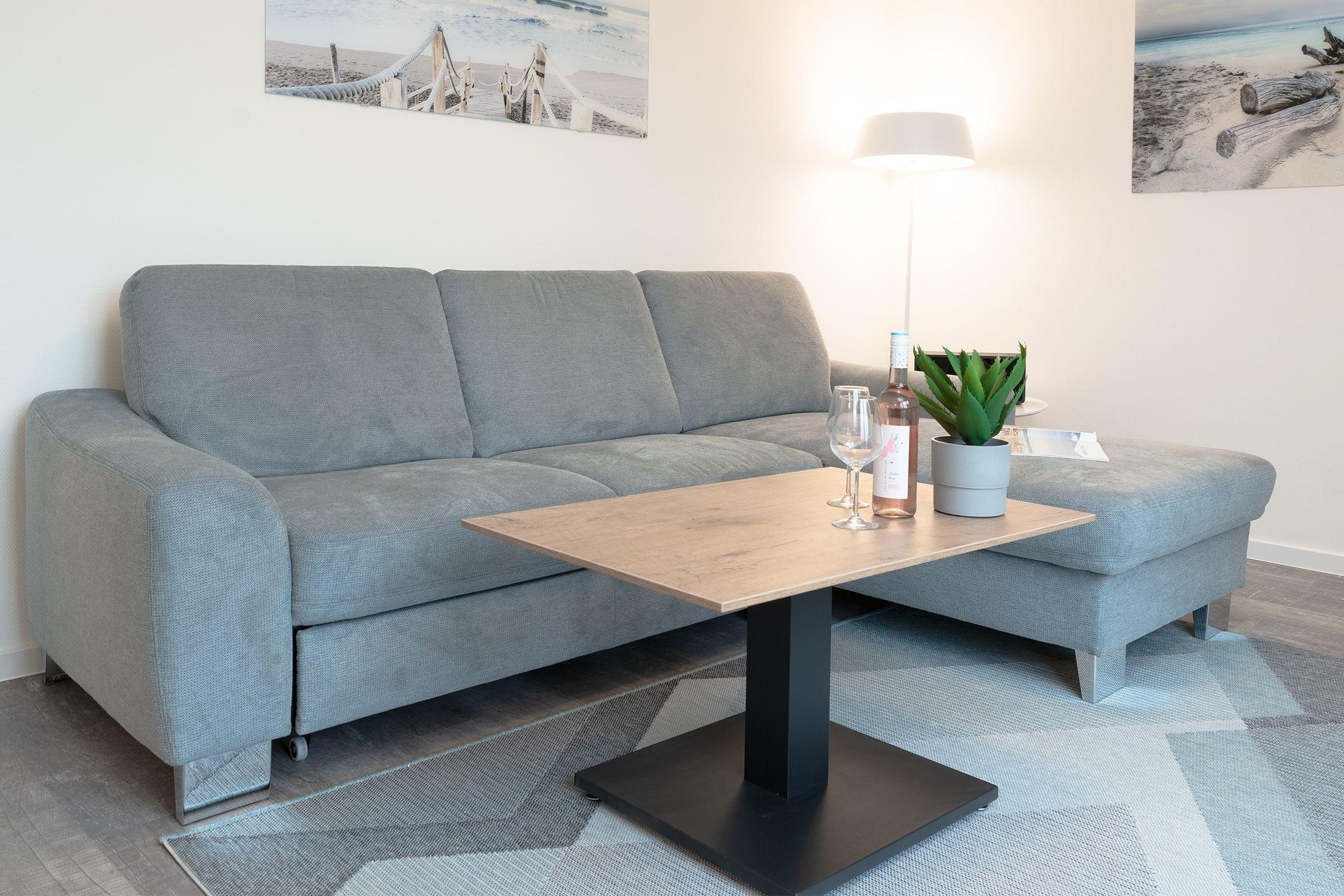 Der offene Wohn-, Ess- und Kochbereich empfängt Sie lichtdurchflutet und mit maritimer Gemütlichkeit. Auf dem kuscheligen Sofa, das sich mit wenigen Griffen zu einem weiteren Schlafplatz verwandeln lässt (ca. 140x200cm) können Sie den Urlaubstag entspannt vor dem TV ausklingen lassen. Durch die große Terrassentür gelangen Sie auf die möblierte Dachterrasse, auf der Sie ein Strandkorb zum Relaxen einlädt, hier lässt es sich an warmen Sommerabenden, als auch bei frischeren Temperaturen mit einer Decke gut aushalten.