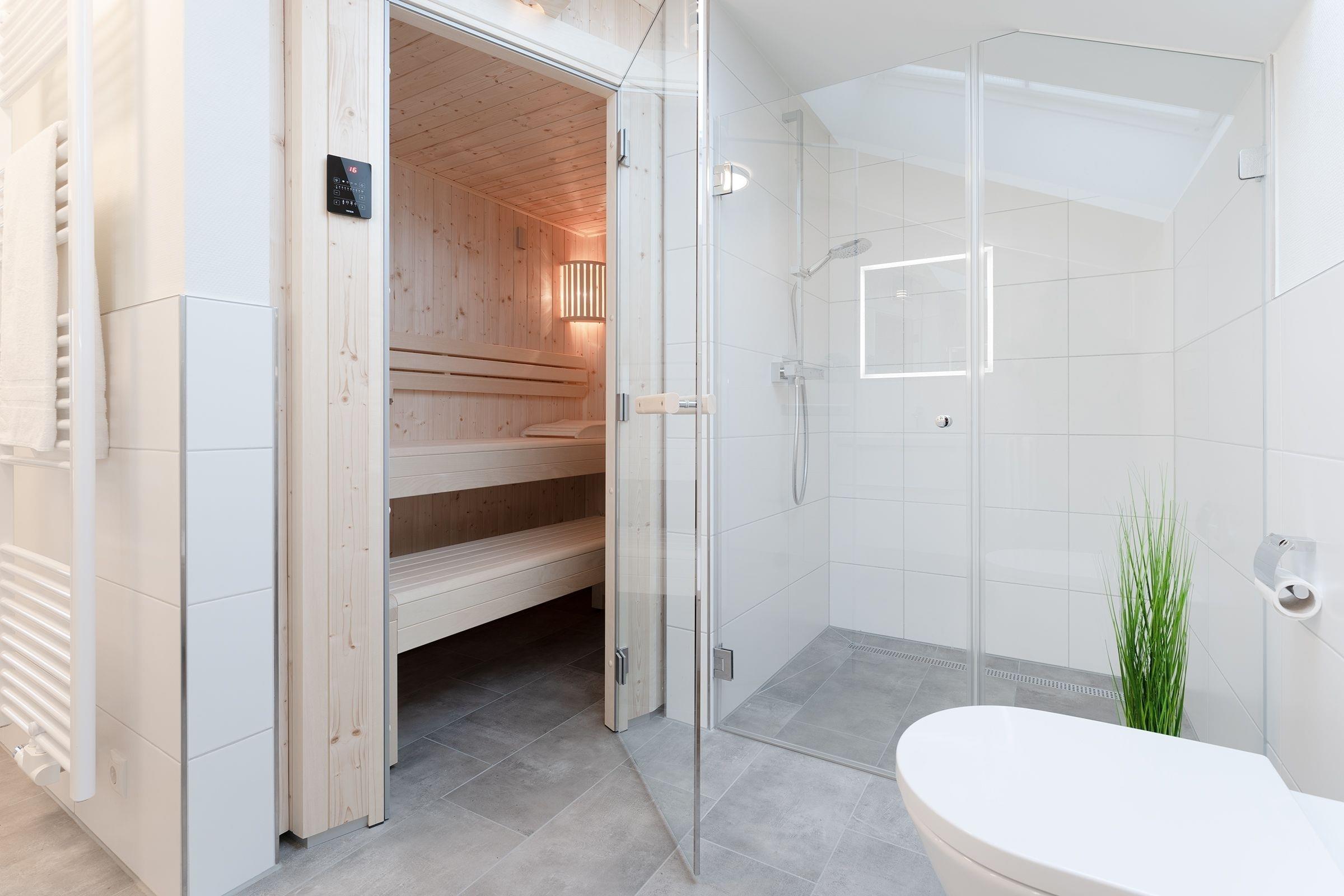 Nach langen Strandspaziergängen und einem Saunagang entspannt es sich ganz hervorragend in dem komfortablen Boxspringbett (ca. 180x200cm). 2 weitere Gäste können es sich hier auf einem weiteren Schlafsofa bequem machen (ca. 140 x 200 cm). Auch das Tageslichtbad wird Sie mit seinem klaren Design und großzügiger, ebenerdiger Dusche mit charmantem Oberlicht überzeugen.