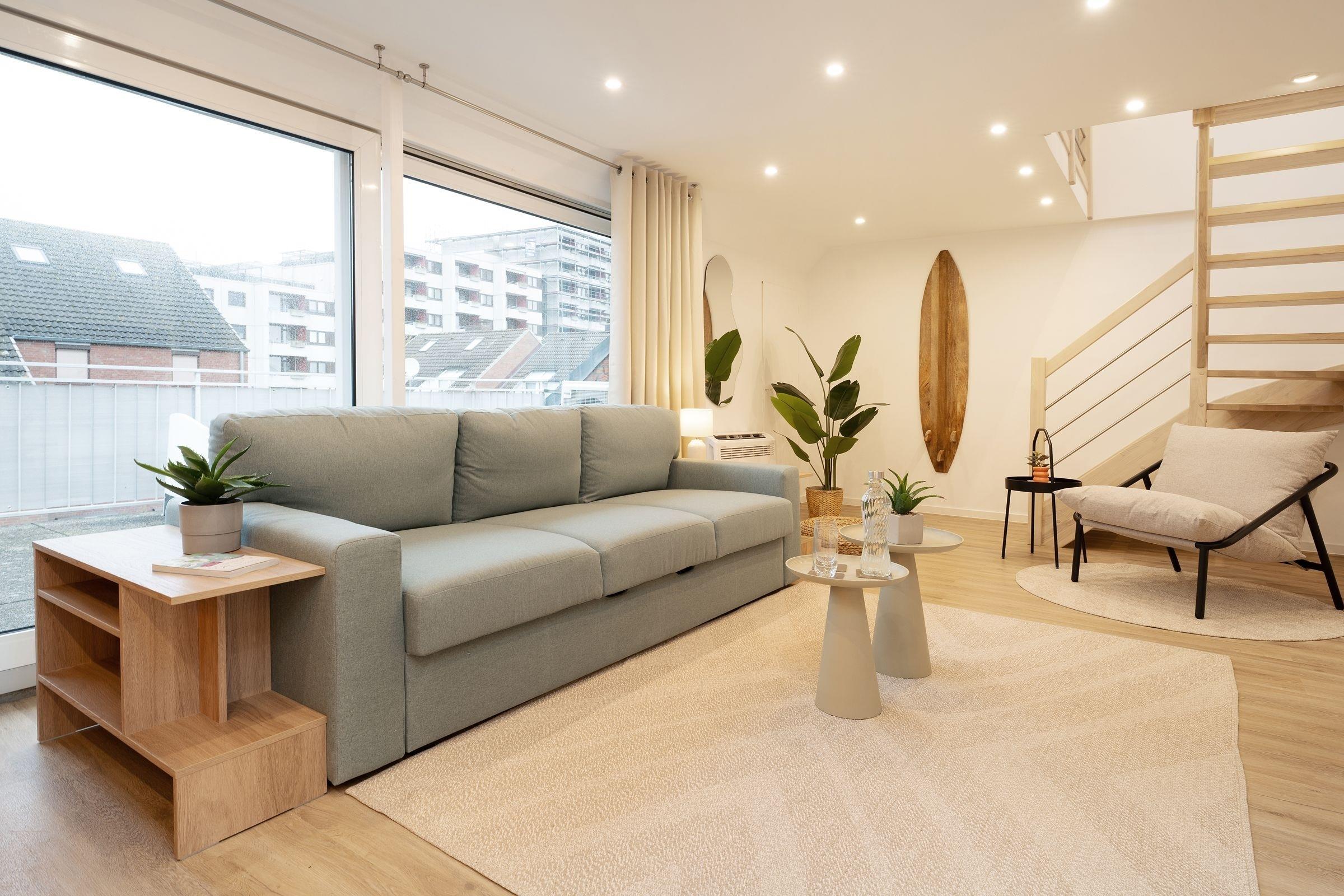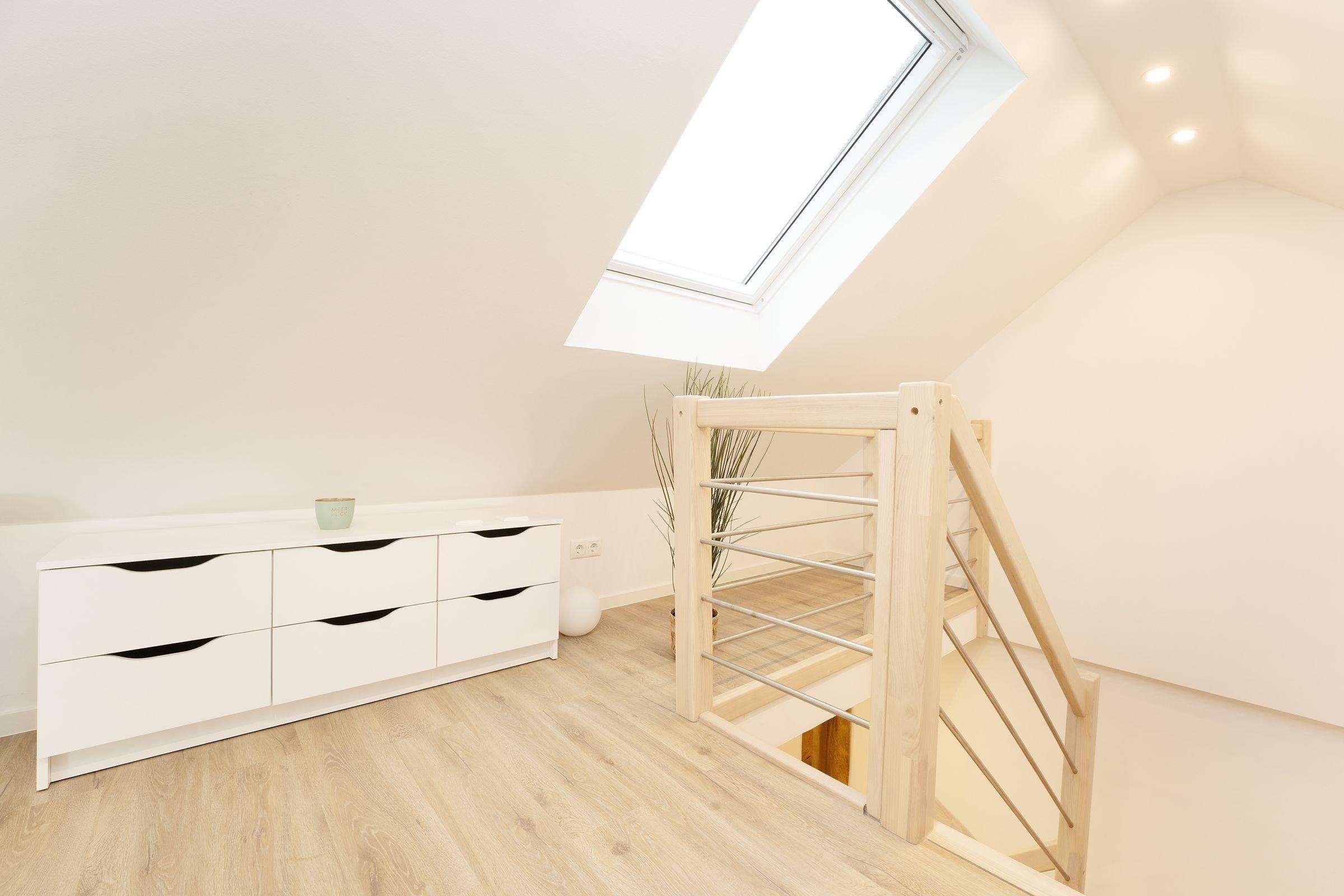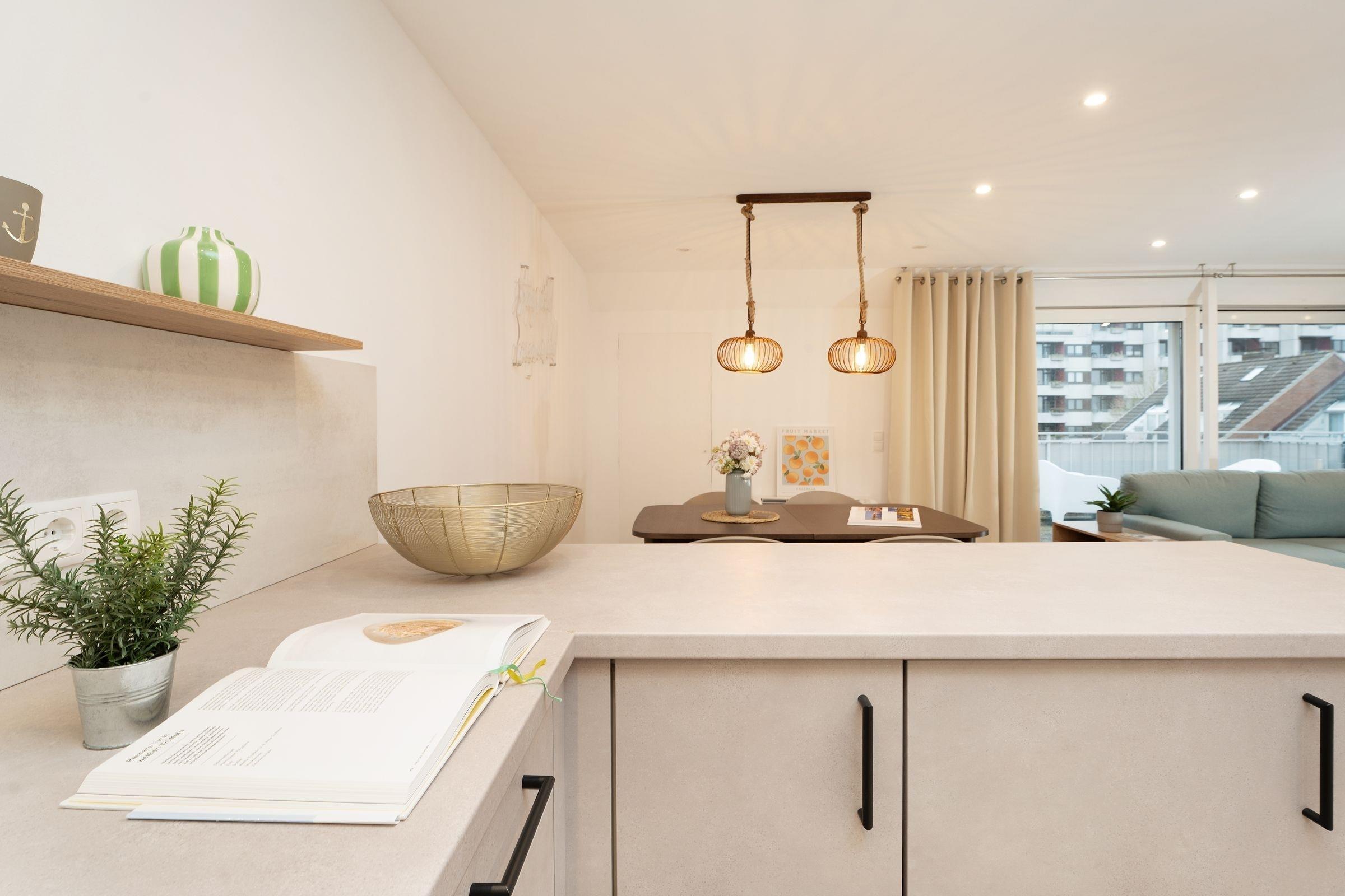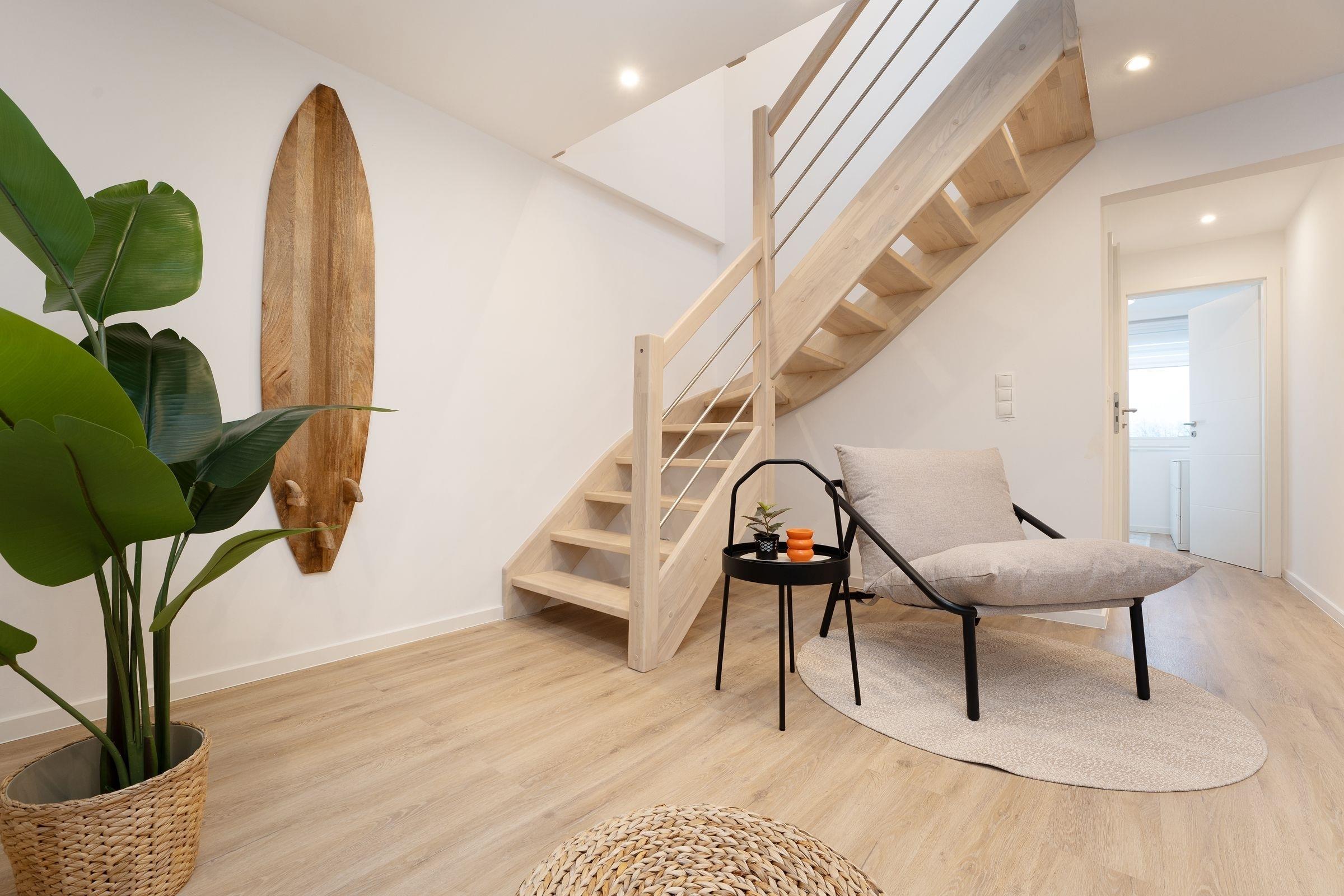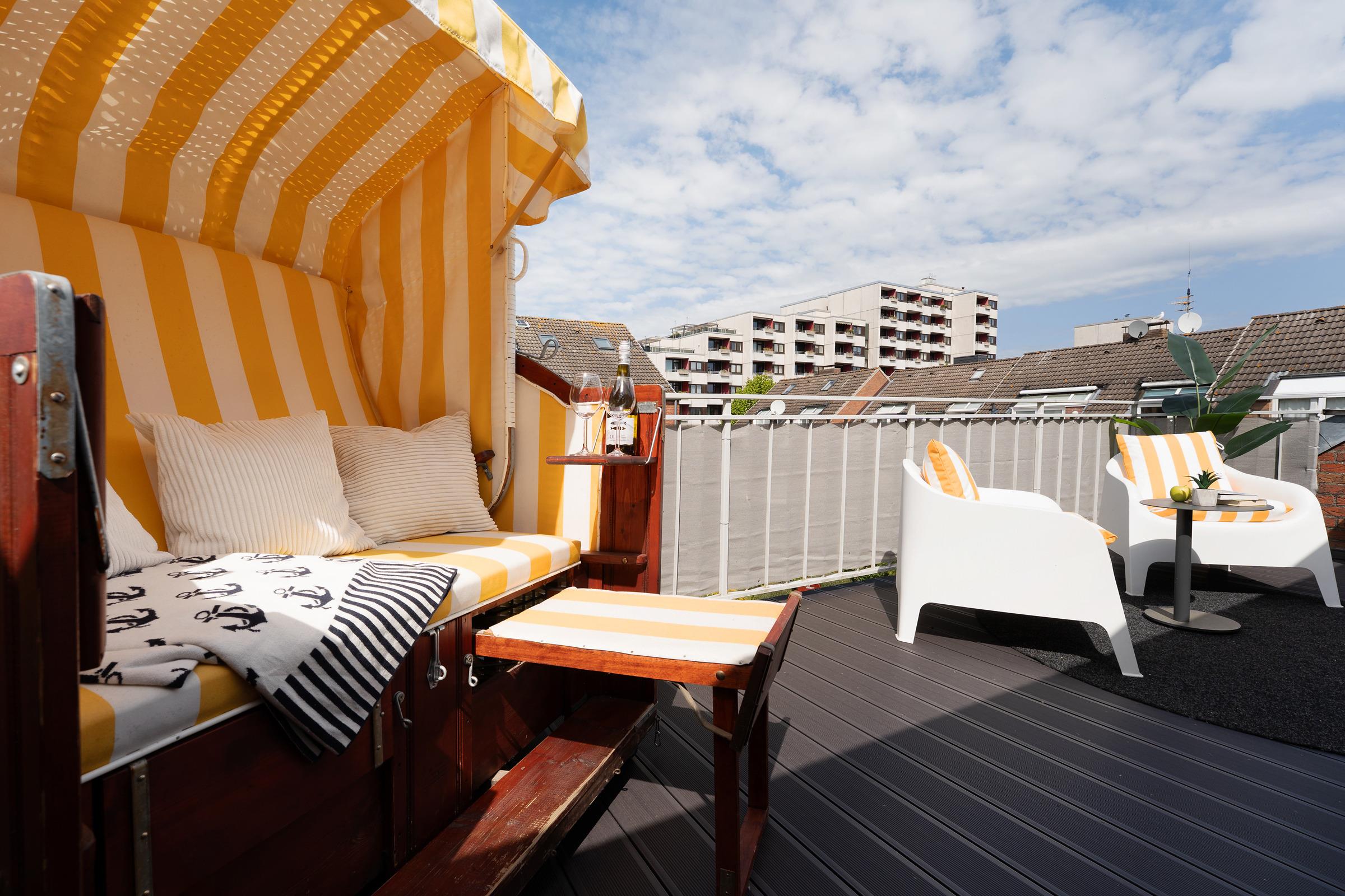Die Ferienwohnung Küstenkind heißt Sie herzlich willkommen! Der charmante Wohnbereich überzeugt durch seine geschmackvolle Einrichtung. Das gemütliche Sofa kann bei Bedarf in einen weiteren Schlafplatz (140x200 cm) für 2 Personen verwandelt werden. In der angrenzenden offenen Küche können Sie dank der guten Ausstattung mühelos Ihre Lieblingsrezepte zubereiten und anschließend auf einem der beiden möblierten Balkone speisen. Im Strandkorb können Sie die letzten Sonnenstrahlen des Tages genießen. Das große Schlafzimmer, das Sie über eine Treppe erreichen, empfängt Sie mit einem Doppelbett (2x 90x200 cm). Das kleinere Schlafzimmer ist mit einem ausziehbaren Kojenbett (2x 90x200 cm) ausgestattet. Beide Schlafzimmer lassen sich durch Außenrollläden verdunkeln. Im innenliegenden Badezimmer mit bodengleicher Dusche können Sie sich in Ruhe für Ihren Urlaubstag fertig machen.