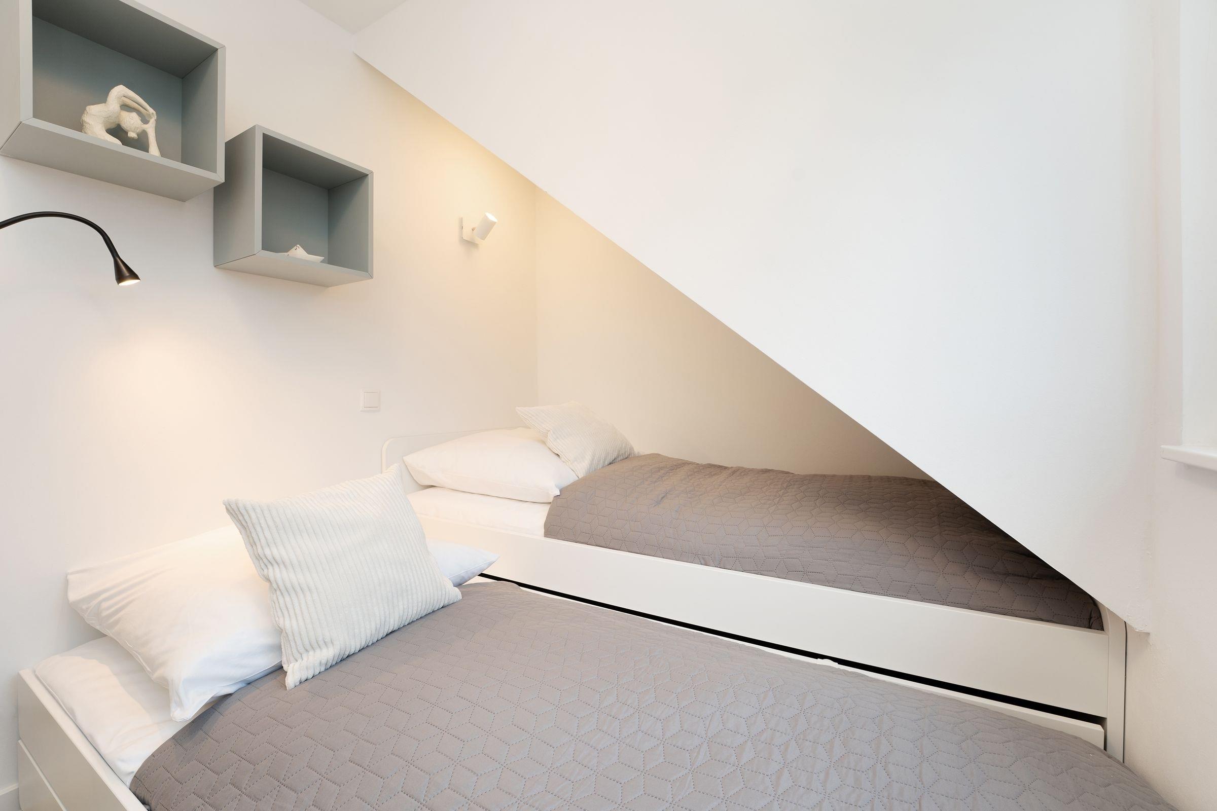 Schlafzimmer 2: Ausziehbares Kojenbett (2x 90x200 cm), Verdunkelung: Außenrollläden, kein Platz für Babybett vorhanden