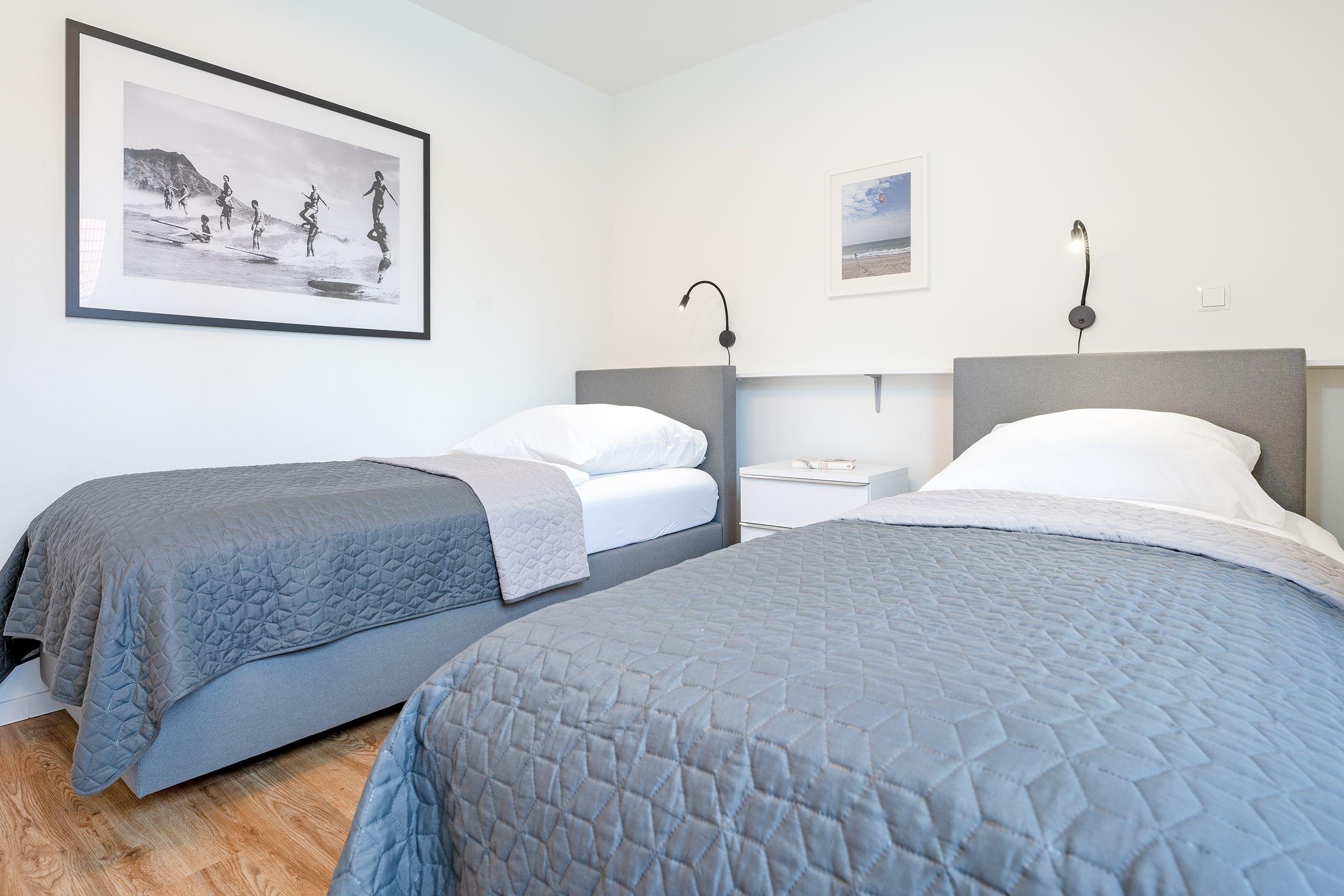 Schlafzimmer 2: 1 Boxspringbett (2x 90x200 cm zusammen oder getrennt stellbar), Kleiderschrank, TV, Verdunkelungsart: Vorhänge + Plissees, Platz für Babybett vorhanden