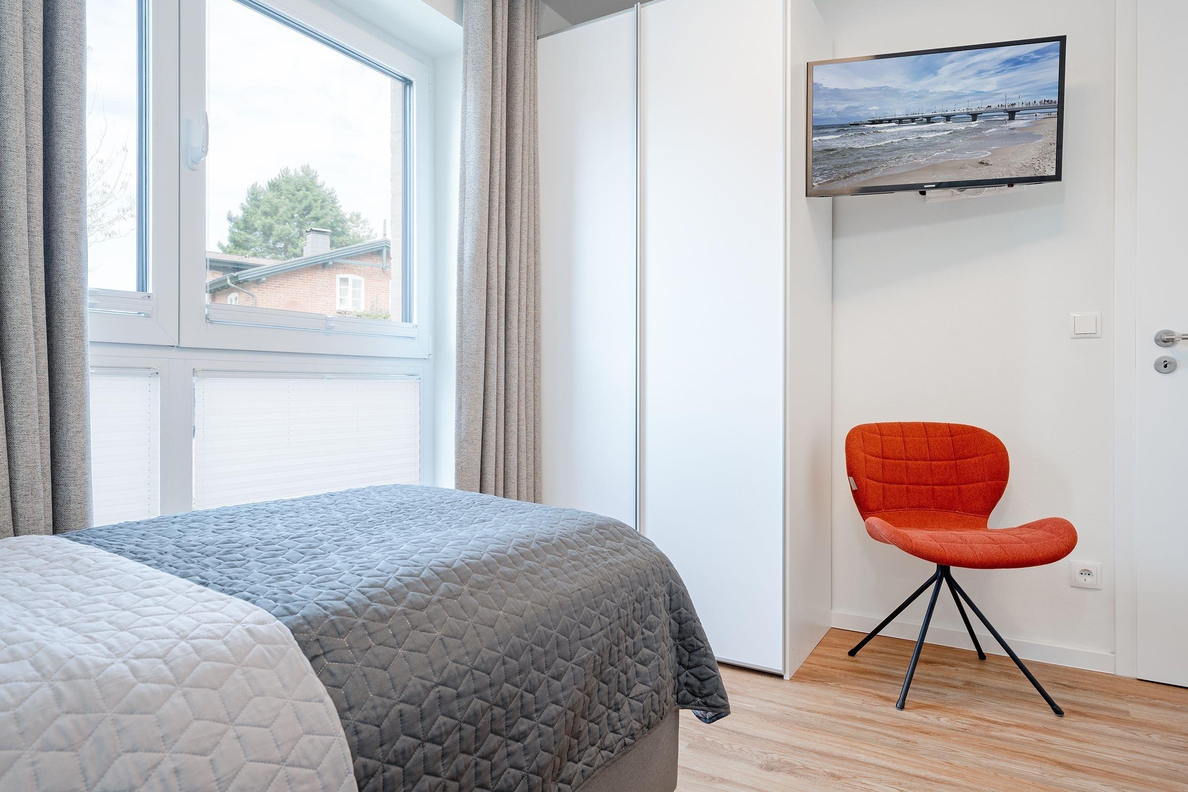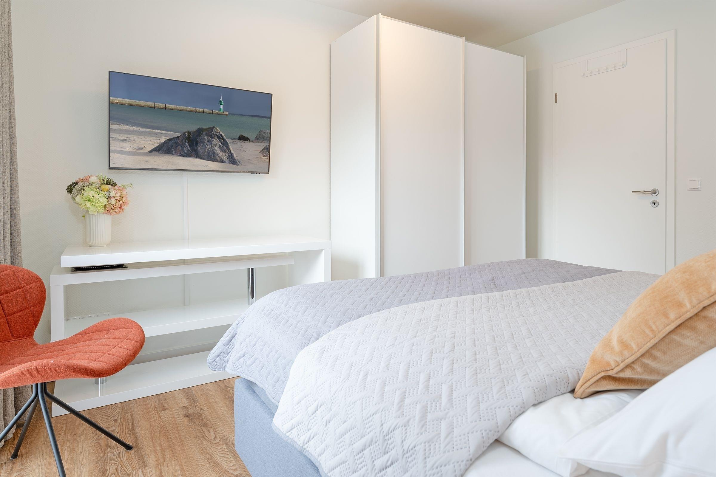 Schlafzimmer 1: 1 Boxspringbett (180x200 cm), Kleiderschrank, TV, Verdunkelungsart: Vorhänge + Plissees, Platz für Babybett vorhanden