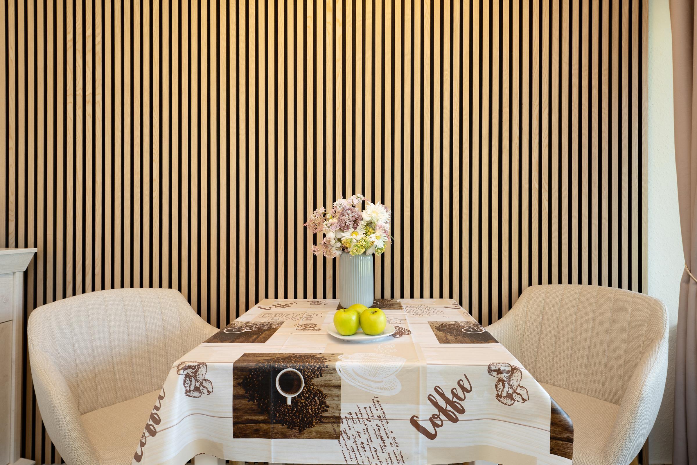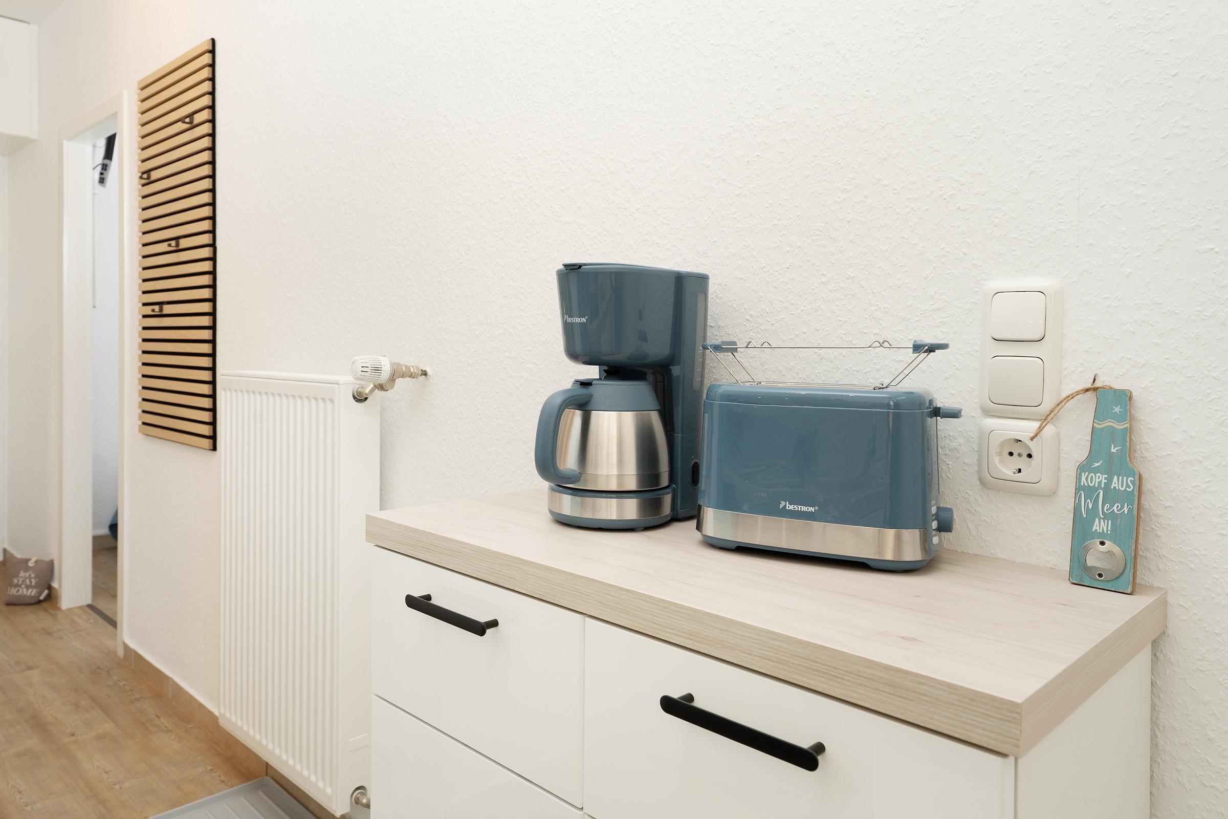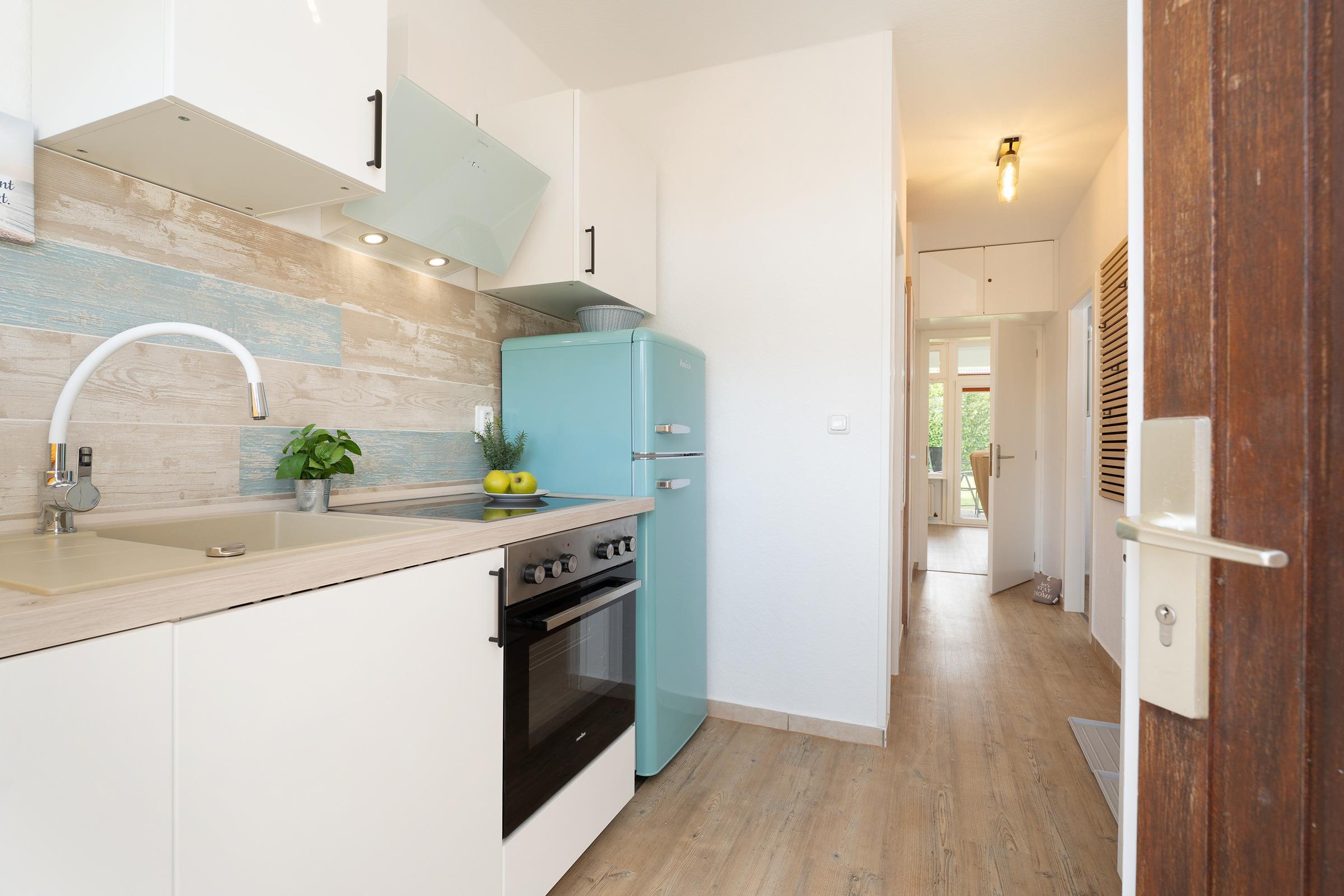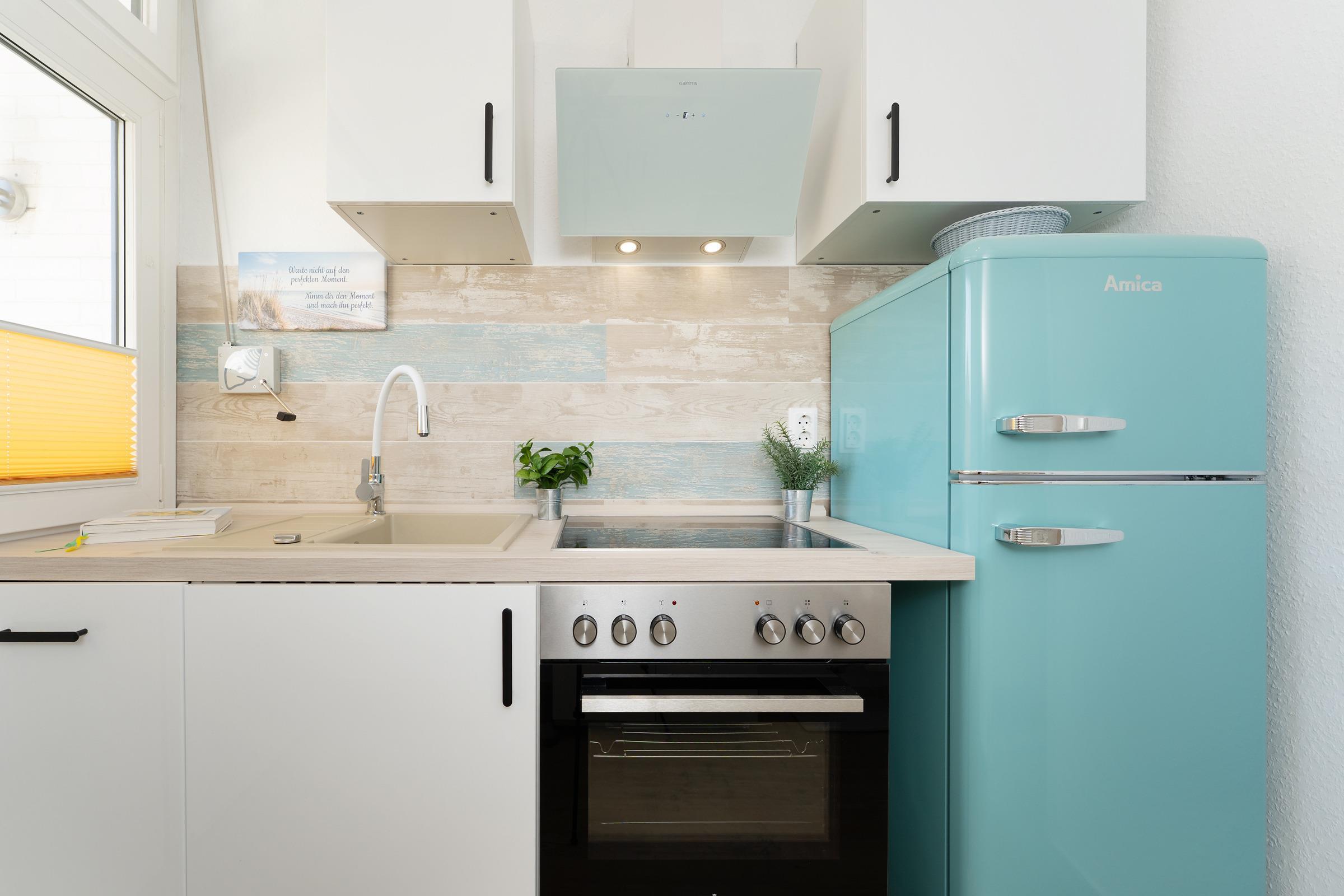 Die offene Küche ist mit Ceranfeld, Backofen, Kühlschrank mit Gefrierfach, Kaffeemaschine, Toaster und Wasserkocher bestens ausgestattet. Ein gemütlicher Essbereich lädt ein zu gemeinsamen Mahlzeiten.