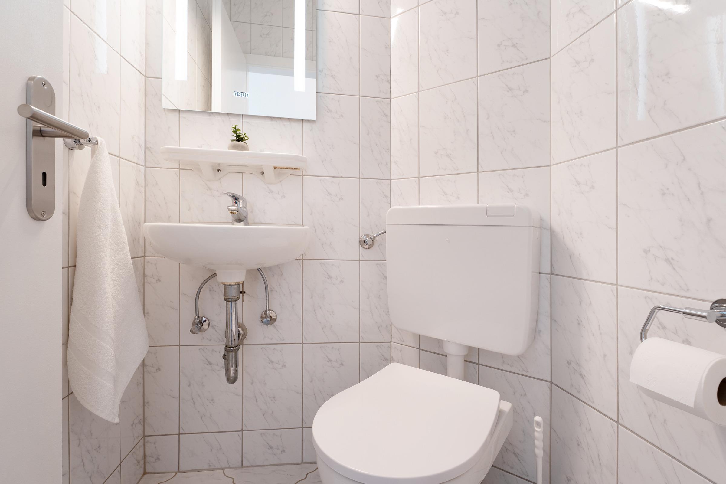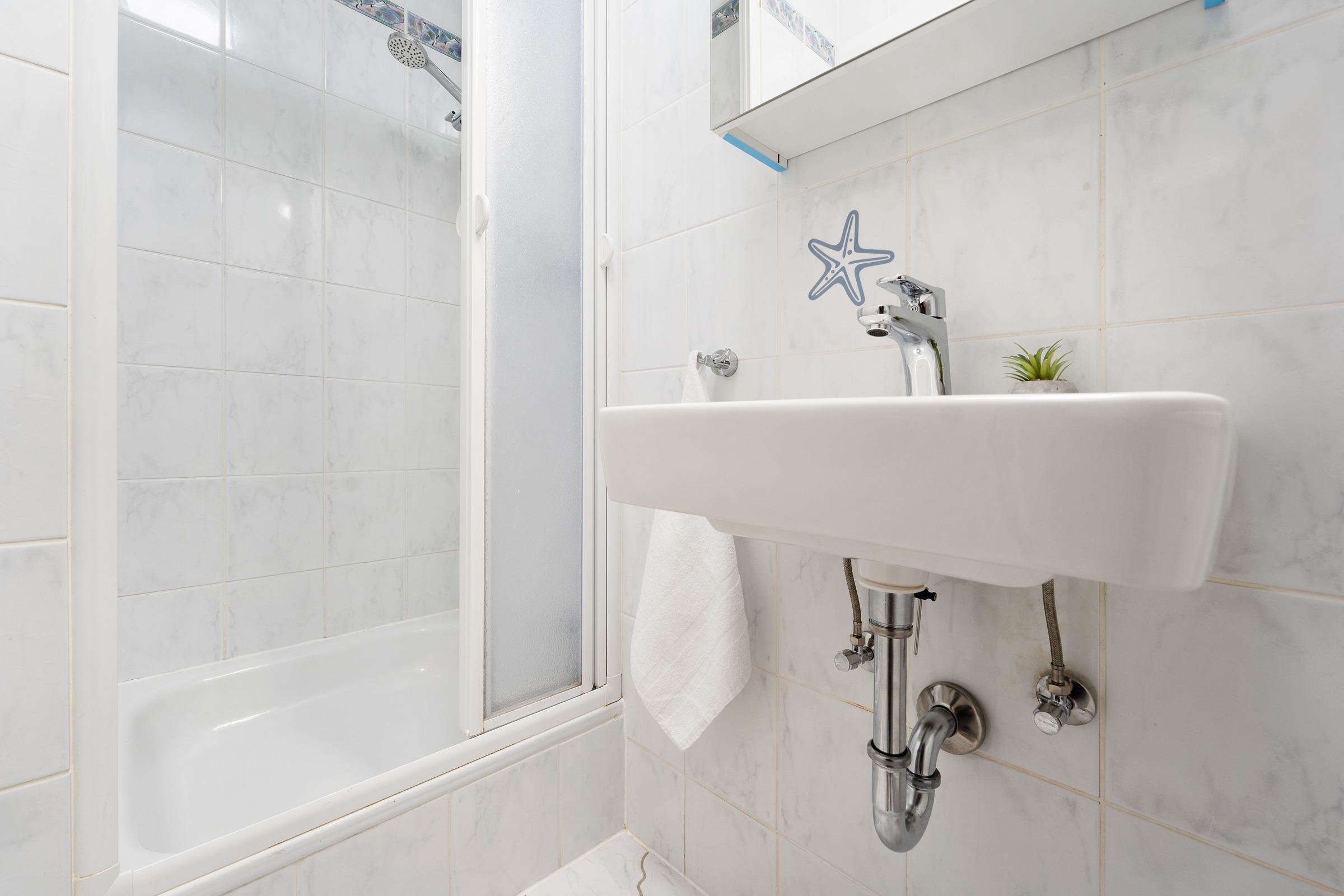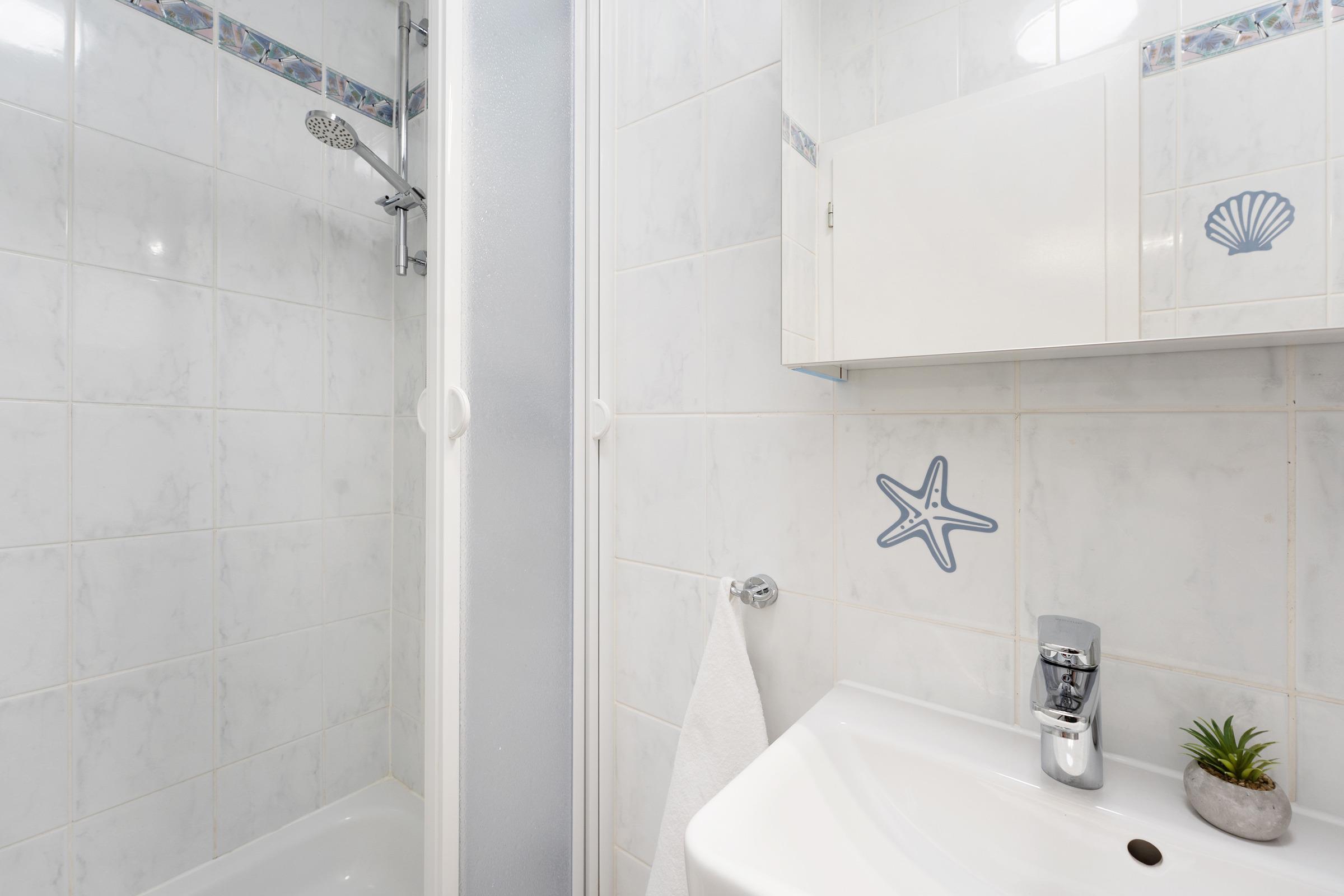 Das separate Schlafzimmer ist mit einem komfortablen Doppelbett ausgestattet und bietet eine ideale Atmosphäre für ruhige Nächte. Ein modernes Badezimmer mit Dusche, Waschbecken und WC rundet das Angebot ab. Ein Haartrockner sowie praktische Extras wie Sichtschutz für die Fenster sind vorhanden.