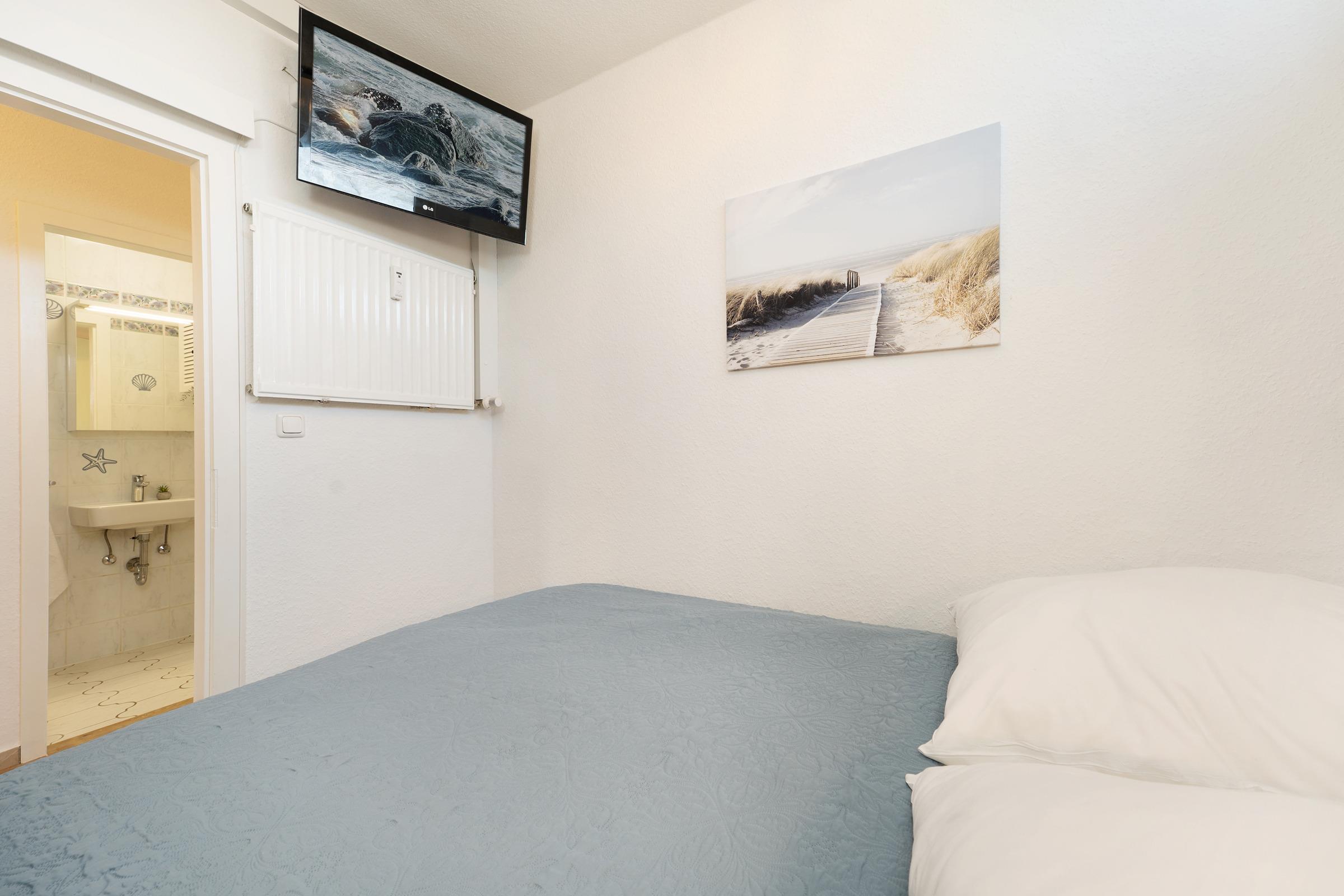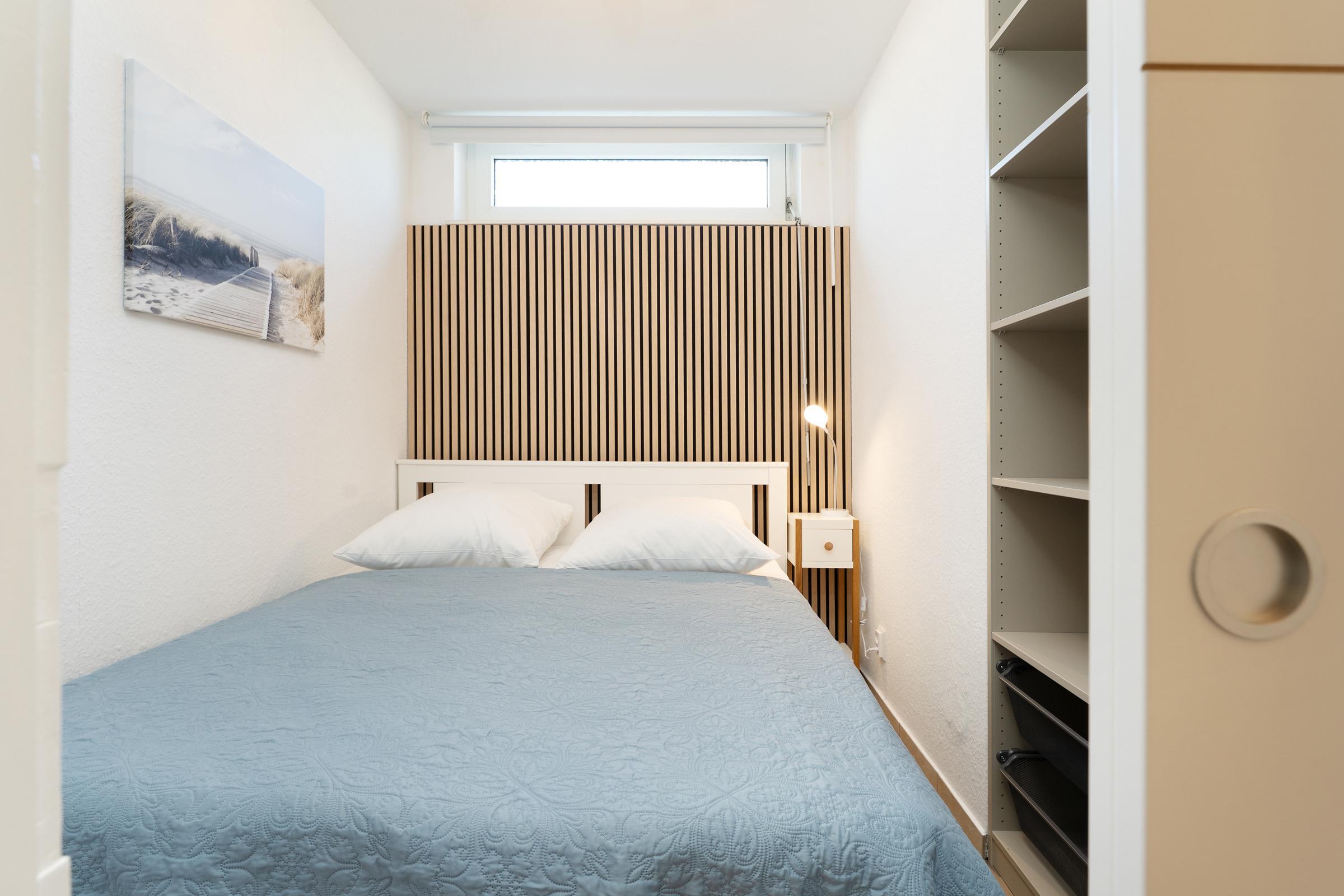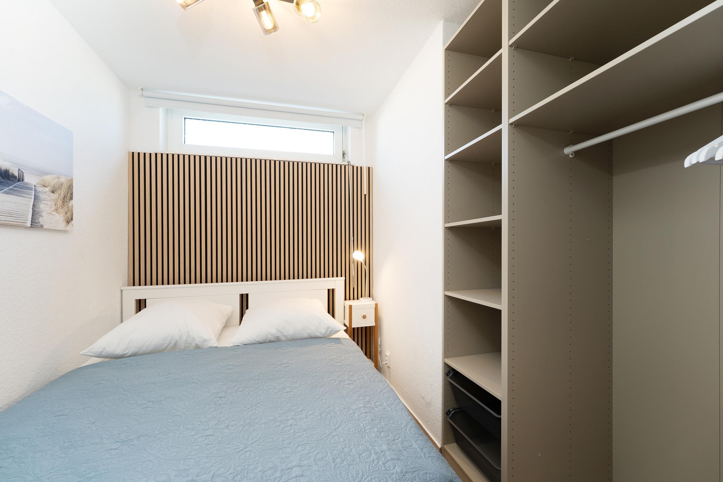 Schlafzimmer: 1 Doppelbett (160x200 cm), Kleiderschrank, TV, Verdunkelung: Gardinen und Außenjalousien