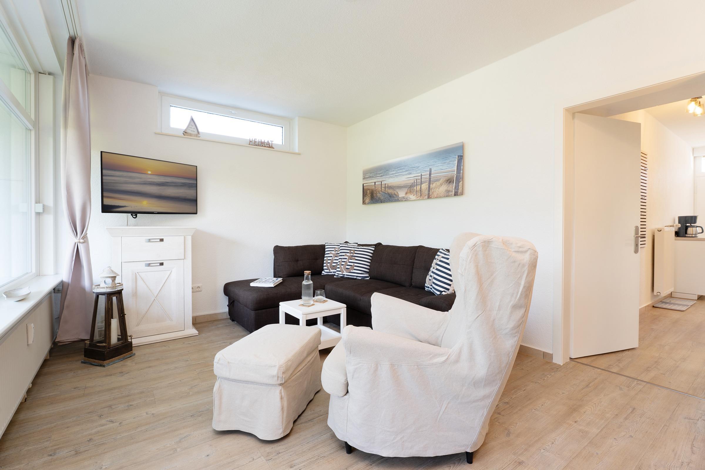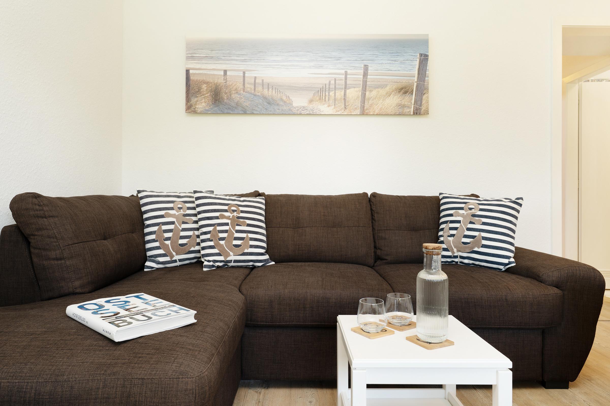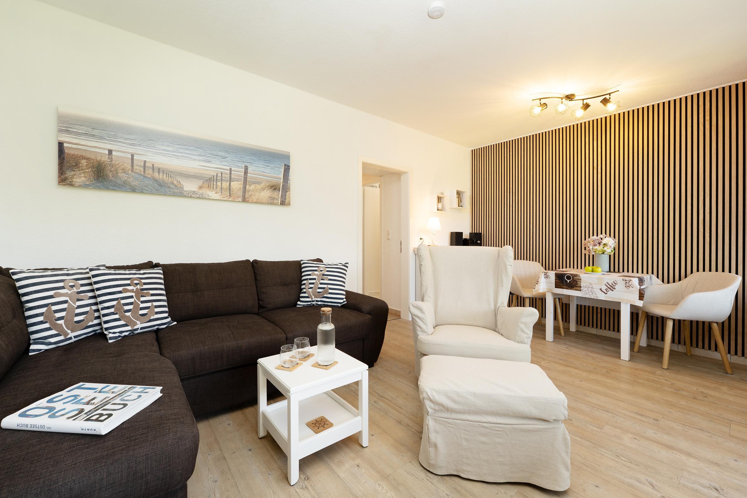Willkommen in dieser gemütlichen Ferienwohnung in Dahme an der Ostseeküste, die mit moderner Ausstattung und einer entspannten Atmosphäre überzeugt. Der offene Wohnbereich ist ausgestattet mit einer bequemen Sitzecke, einem Flachbild-TV und kostenfreiem WLAN – ideal zum Entspannen nach einem Tag am Strand. Vom Wohnbereich aus gelangen Sie direkt auf die sonnige, überdachte Süd-Terrasse, die für gemütliche Stunden zum Verweilen einlädt.