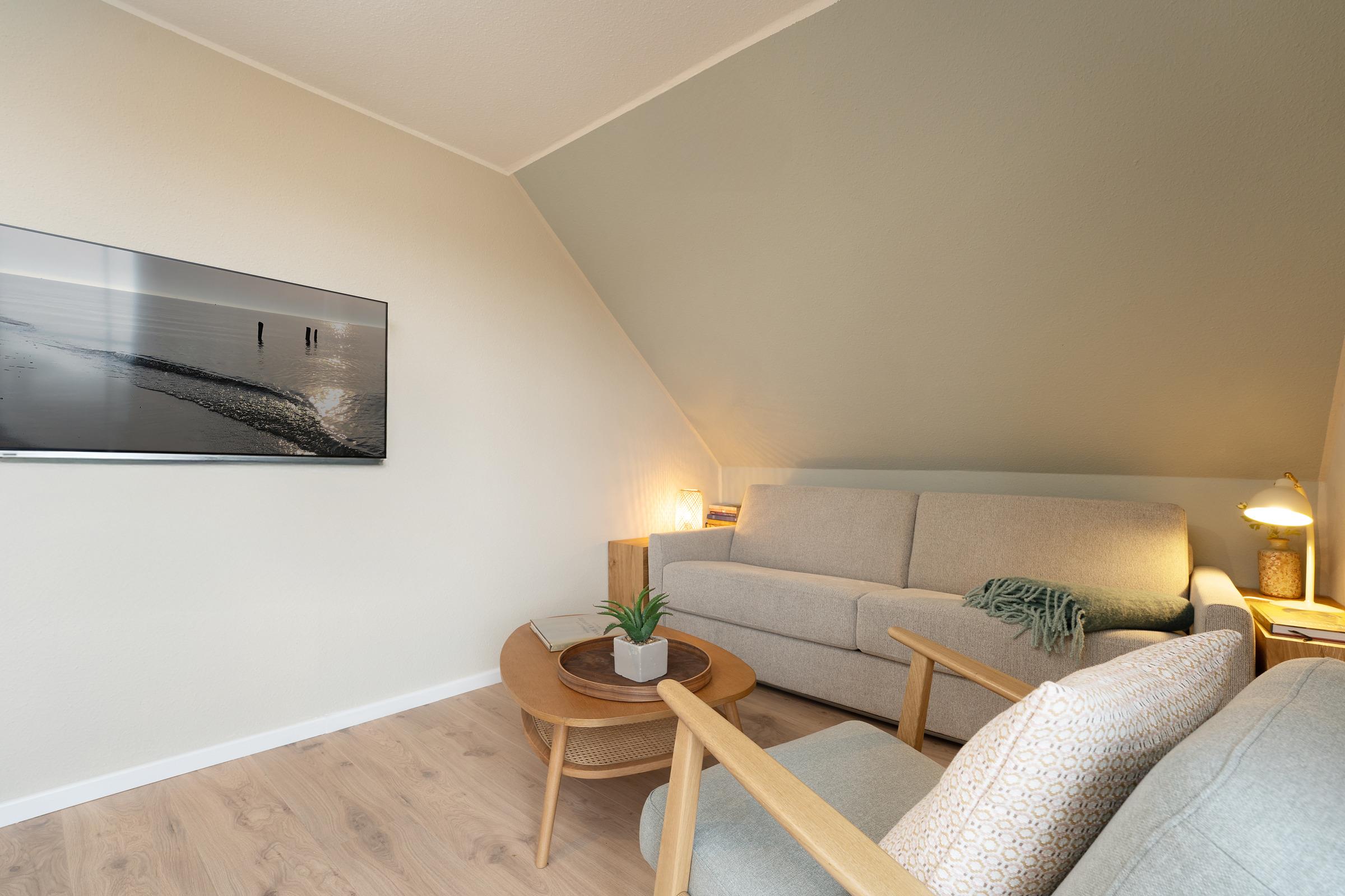 Wohnzimmer: 1 Schlafsofa (160x200 cm), TV, Verdunkelung: Gardinen, Platz für ein Babybett vorhanden
