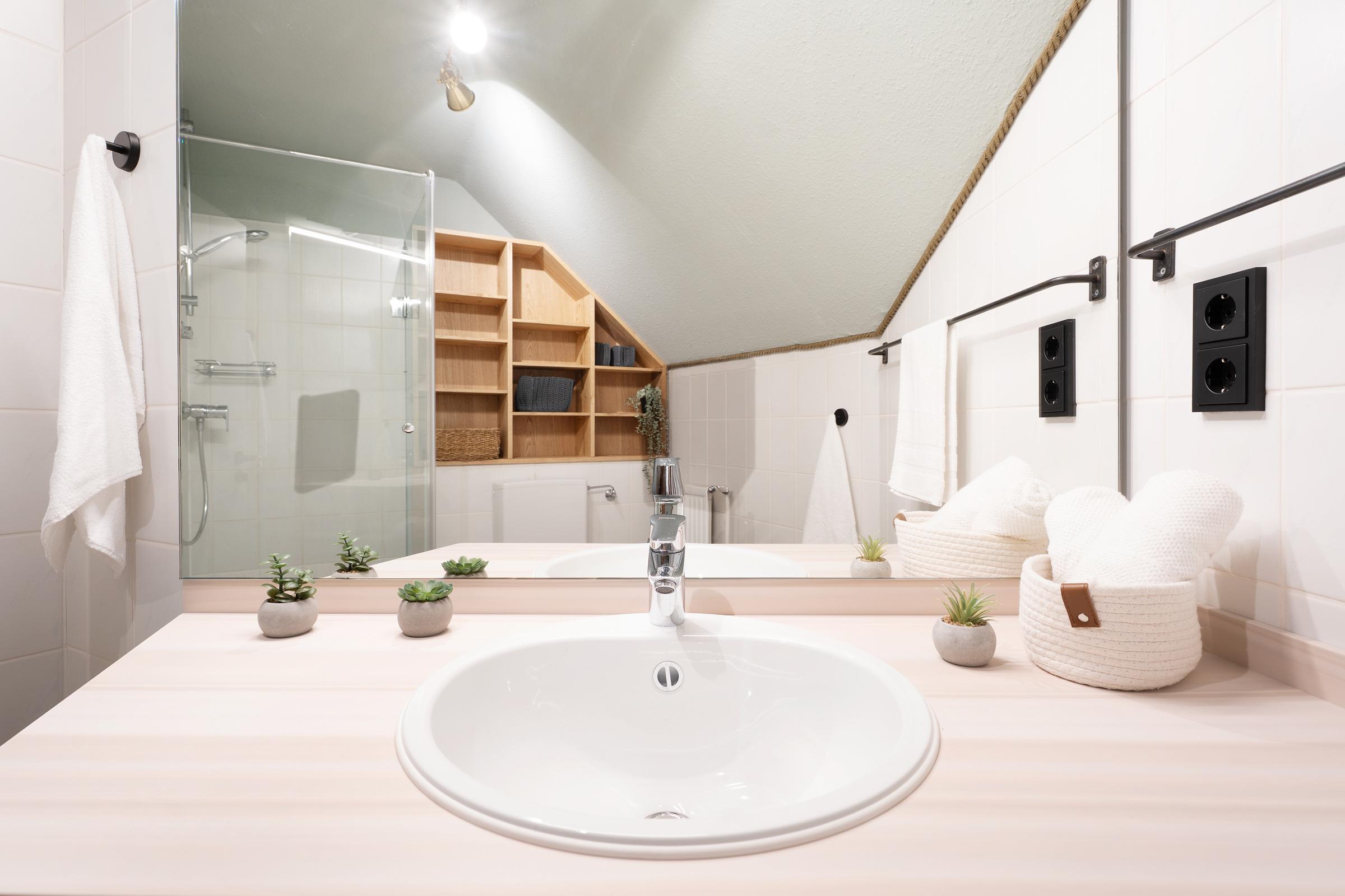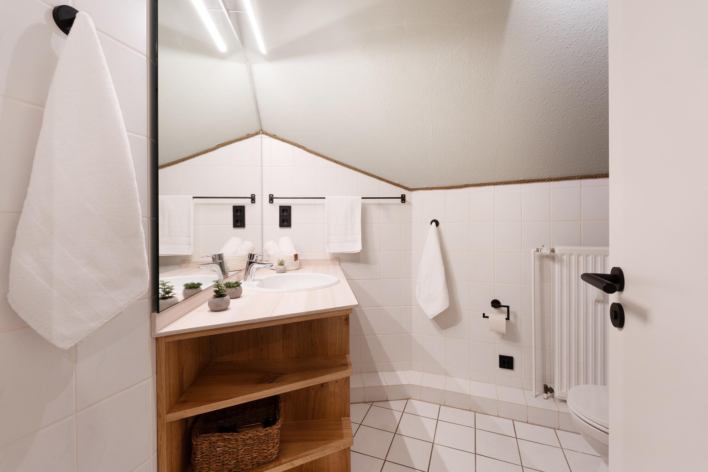 Das Badezimmer ist mit einer Dusche, WC und Waschbecken ausgestattet.