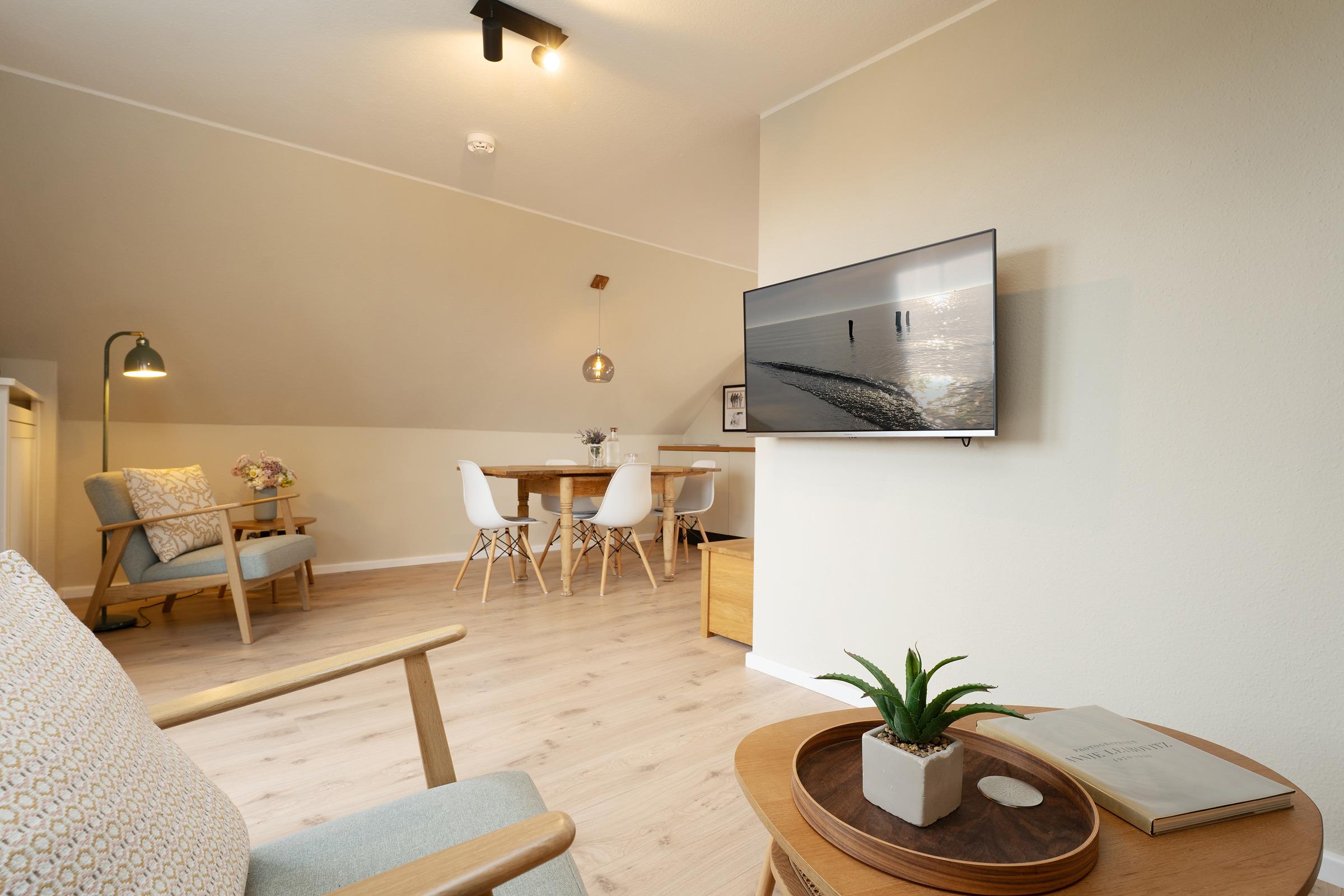 Der Wohnbereich lädt mit gemütlichem Sofa, TV und Zugang zum möblierten Balkon zum Entspannen ein. Von hier genießen Sie einen schönen Blick in Richtung Meer – perfekt für sonnige Stunden im Freien.