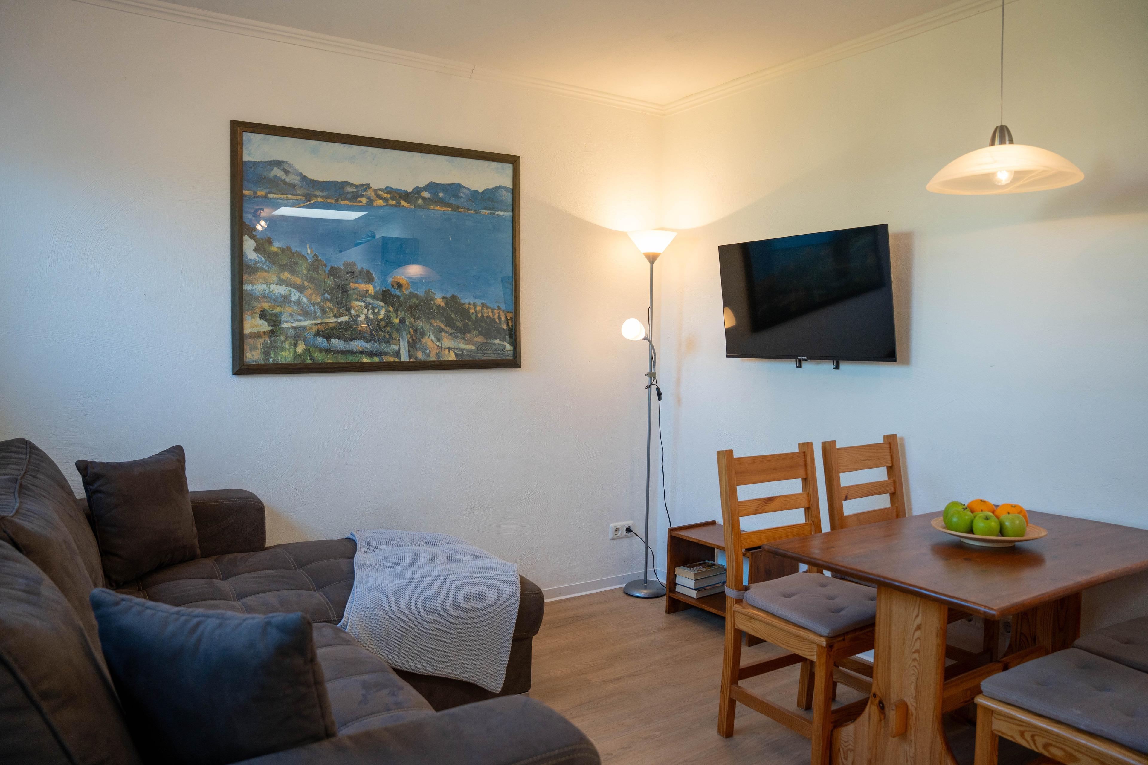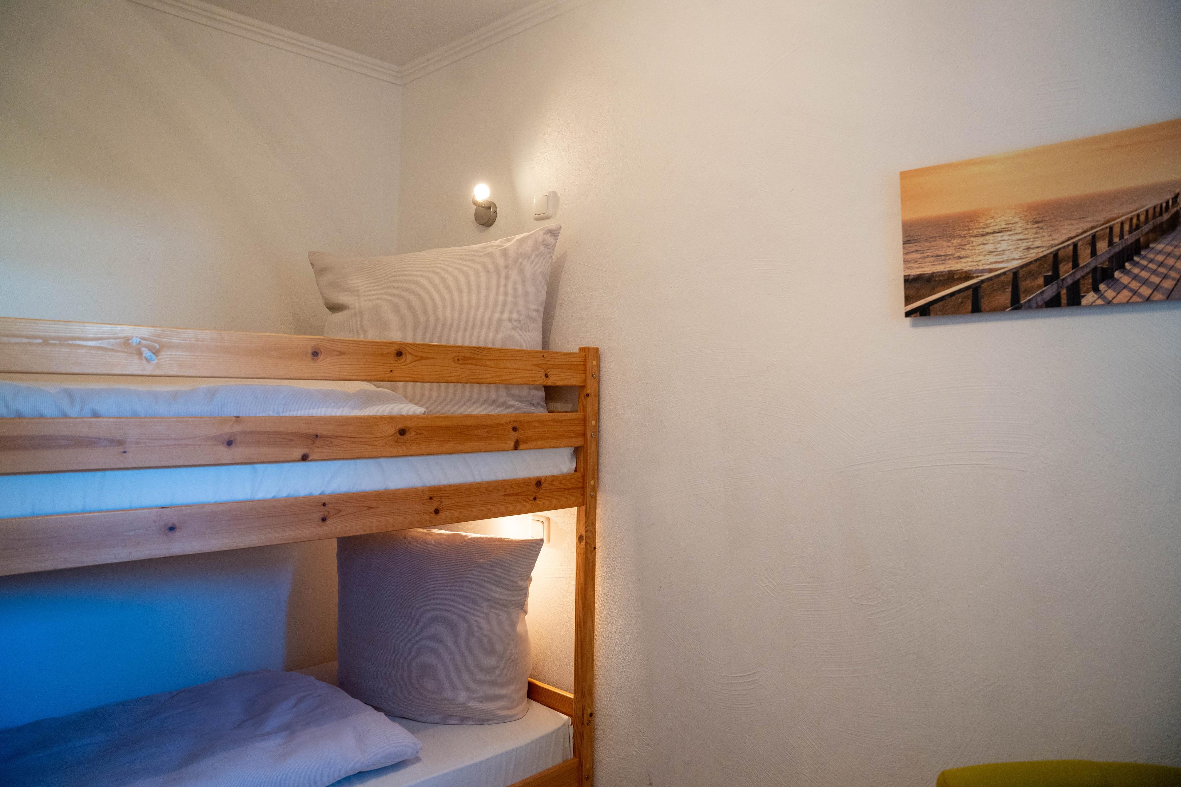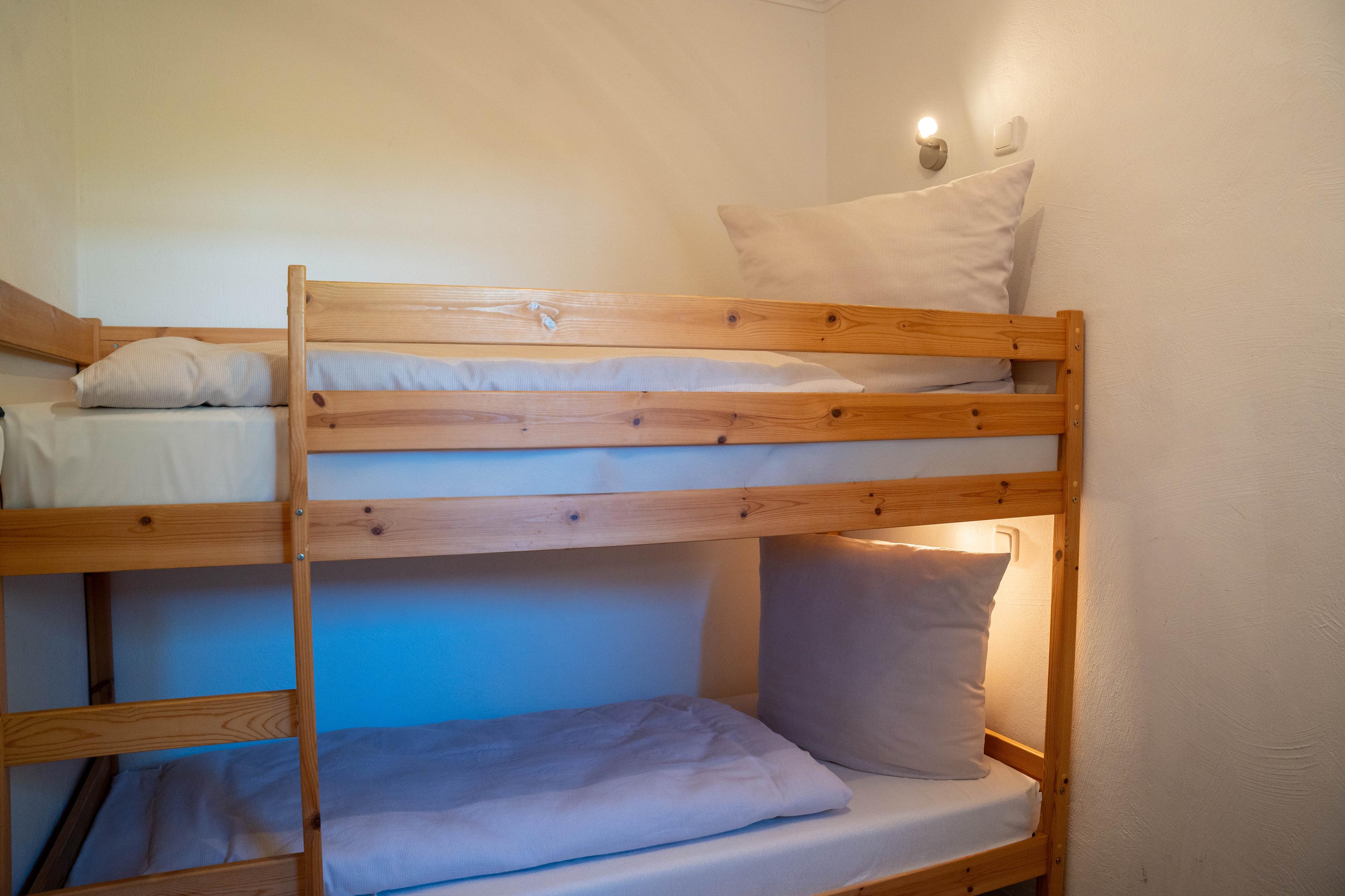 Der Bungalow verfügt über ein Schlafzimmer mit einem Doppelbett (180 x 190 cm) sowie einen separaten Schlafraum mit einem Etagenbett (90 x 190 cm). Die offene Küchenzeile ist mit einem Geschirrspüler ausgestattet. Im Wohnbereich können Sie auf der Couch entspannen. .Die Einrichtung ist funktional, und es gibt eine Sitzecke für bis zu vier Personen, perfekt für gemeinsame Mahlzeiten oder entspannte Abende. Im Außenbereich gibt es eine kleine Terrasse, wo sie entspannen können.