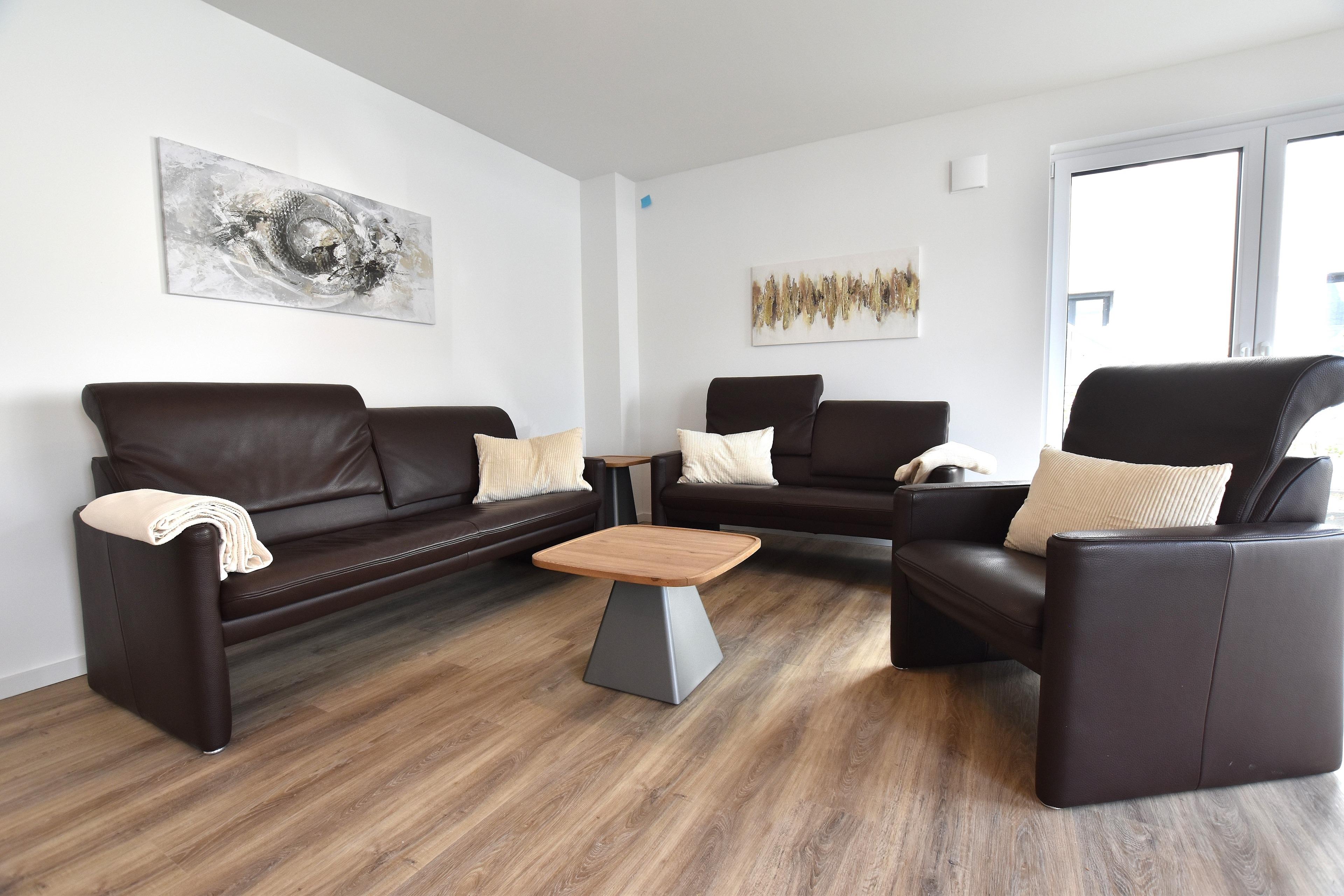 • Sofaecke: Zwei komfortable Ledersessel und ein großer Flachbild-TV (Empfang über Joyn) laden zu entspannten Abenden ein.