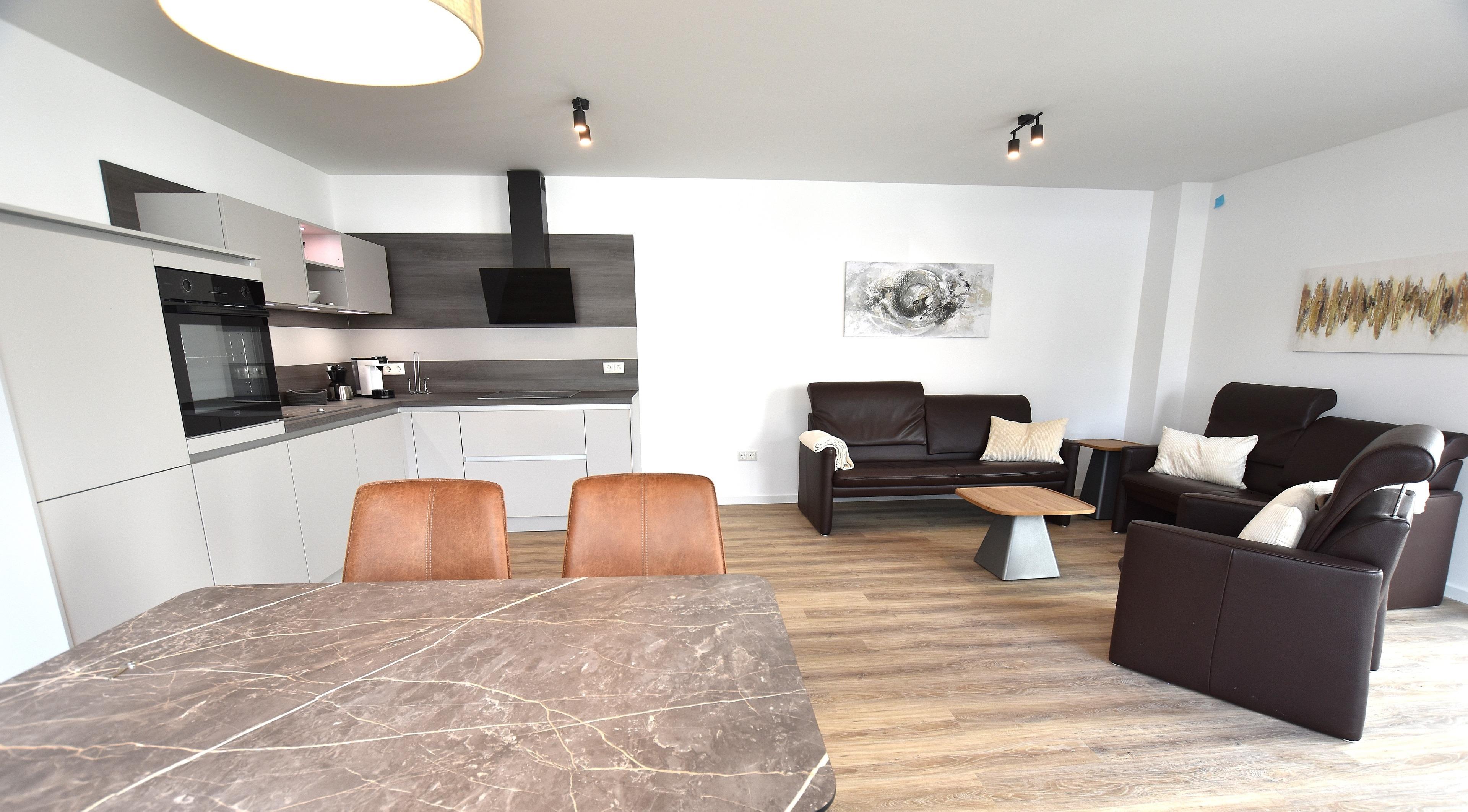 • Wohn- und Essbereich: Der offene Wohnbereich bietet einen Essplatz mit vier bequemen Stühlen sowie eine voll ausgestattete Einbauküche mit Mikrowelle mit Grillfunktion, Geschirrspüler, Kaffeemaschine und Kapselmaschine – natürlich mit allen wichtigen Küchenutensilien.