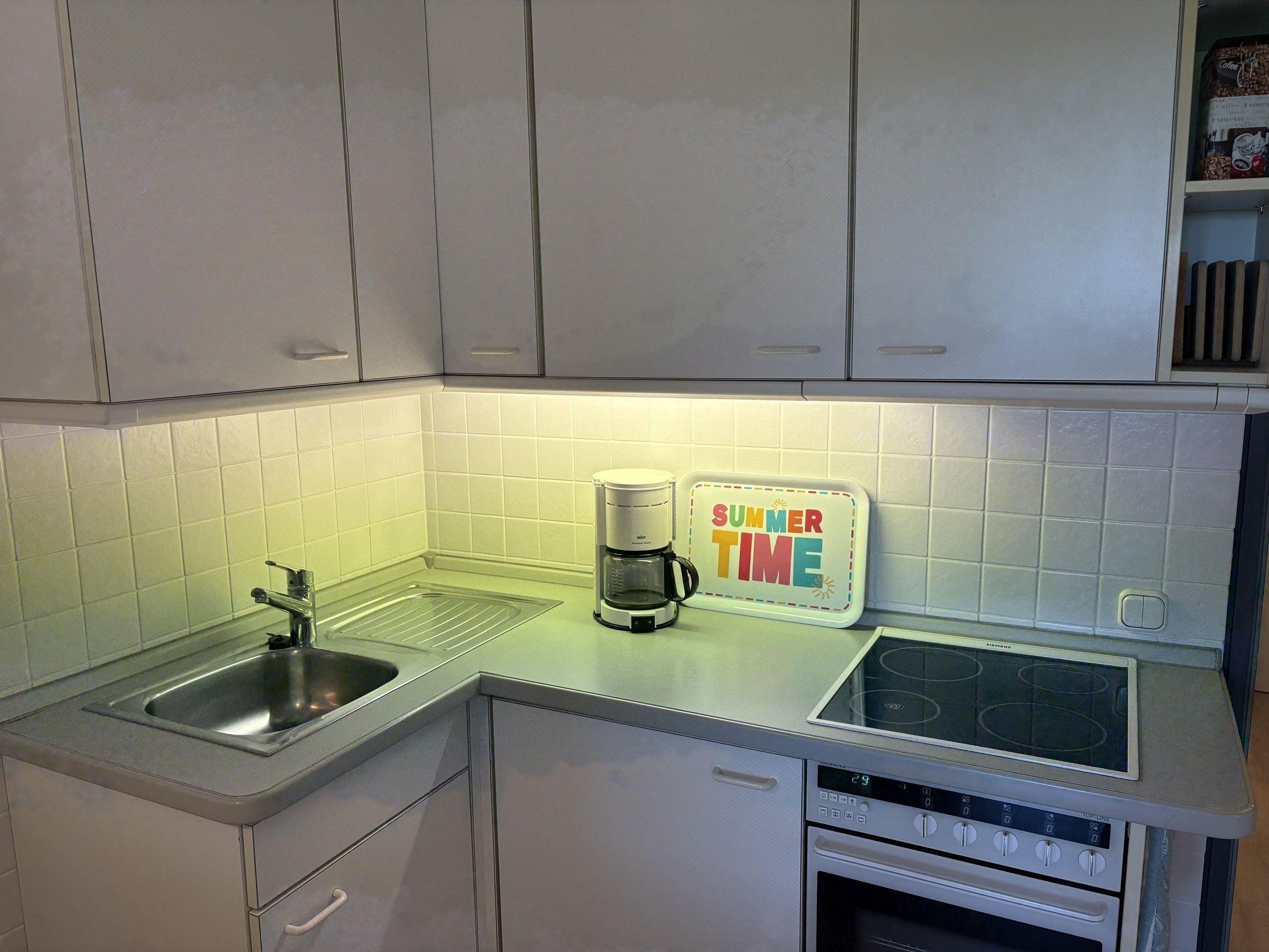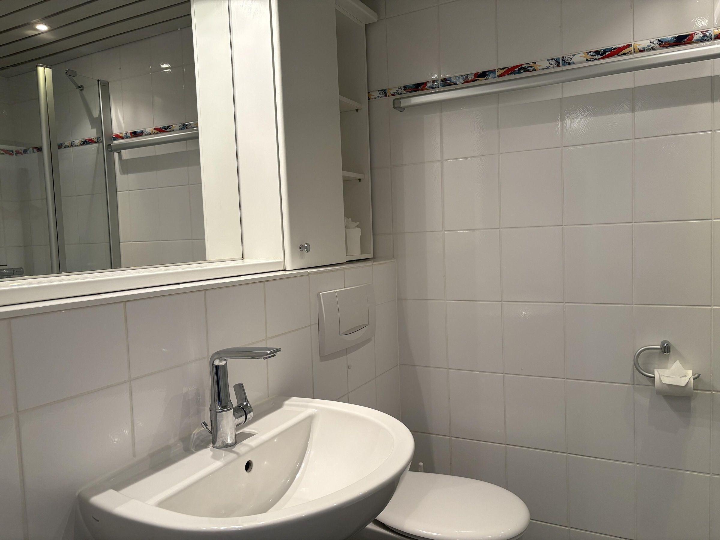 Das Badezimmer ist modern gestaltet und bietet die notwendige Ausstattung für den täglichen Gebrauch. Die offene Gestaltung der Räume sorgt für ein helles und freundliches Ambiente. Die Küche ist funktional eingerichtet und lädt dazu ein, selbst Mahlzeiten zuzubereiten. Die gesamte Wohnung ist geschmackvoll eingerichtet und bietet ausreichend Stauraum.
