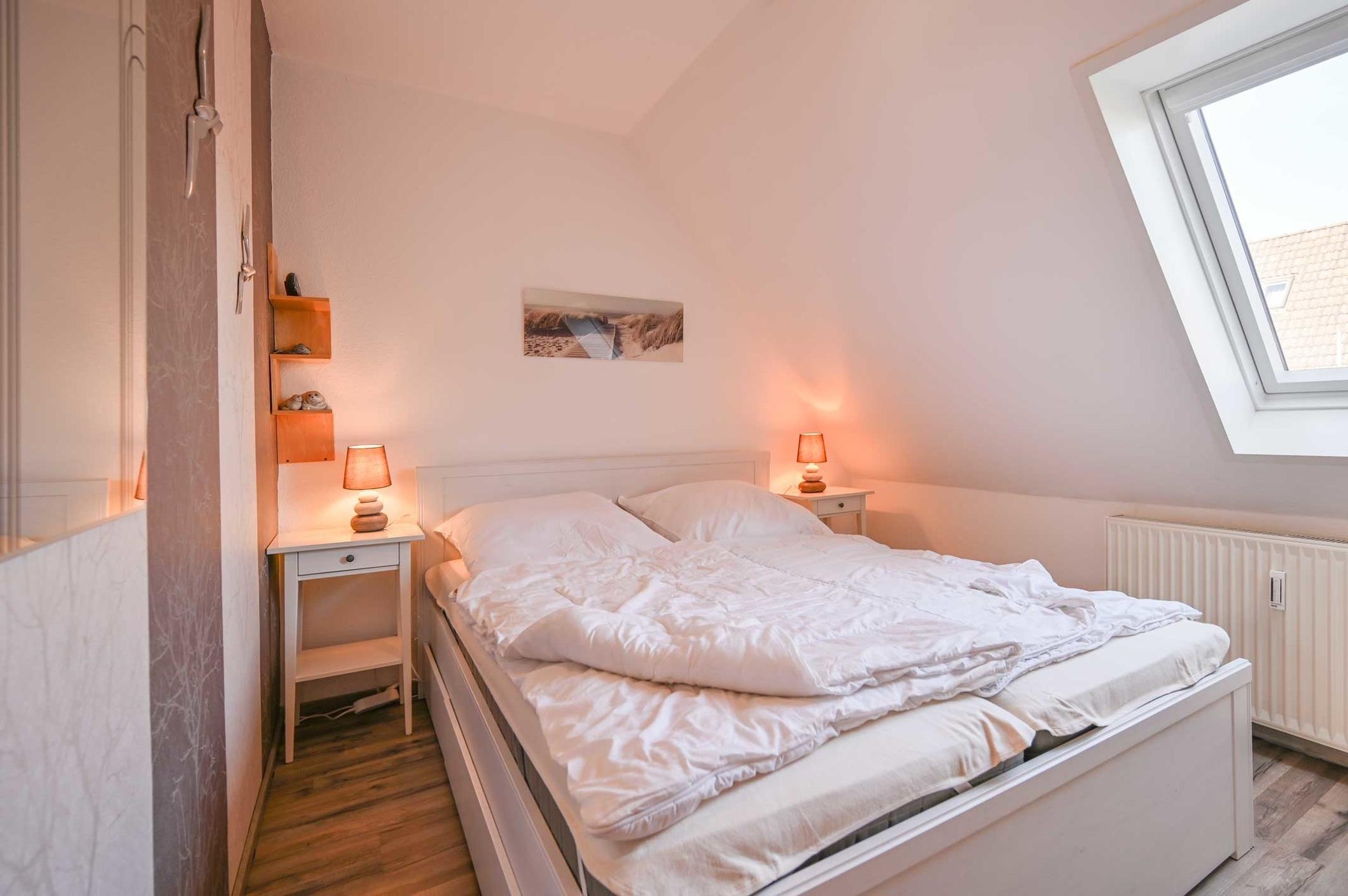 Für erholsame Nächte sorgt das separate Schlafzimmer. Das in elegantem Weiß gehaltene Doppelbett (1,60 m breit) ist mit neuen Lattenrosten und hochwertigen Matratzen ausgestattet – ideal, um nach einem langen Tag an der Seeluft in tiefe Träume zu sinken. Das Lederschlafsofa im Wohnzimmer bietet ausgeklappt eine weitere Schlaffläche (1,40 m breit). Ein modernes Badezimmer mit Dusche und WC rundet Ihr Wohlfühlpaket ab.