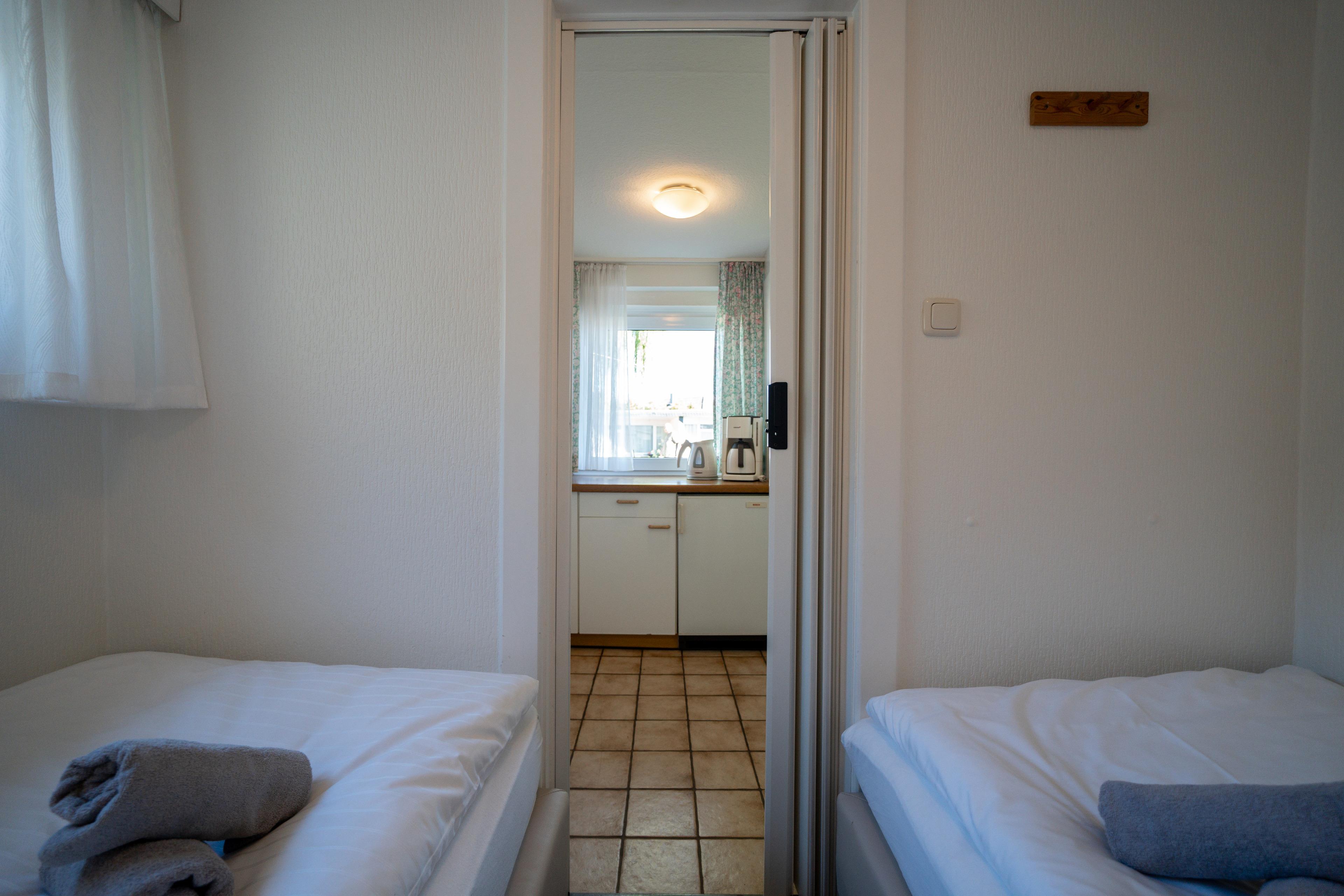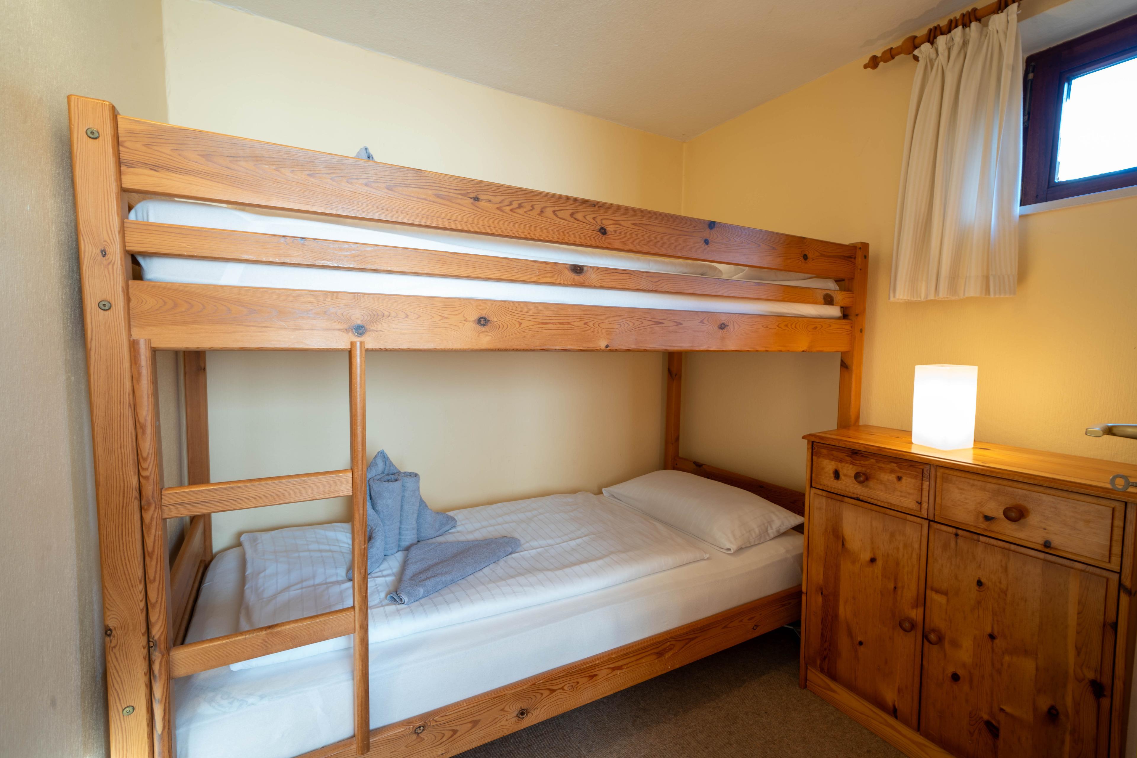 Der Bungalow verfügt über ein Schlafzimmer mit einem Etagenbett ( 90 x 200 cm ) und einem Schlafzimmer mit 2 Einzelbetten ( 90 x 200 cm ).
