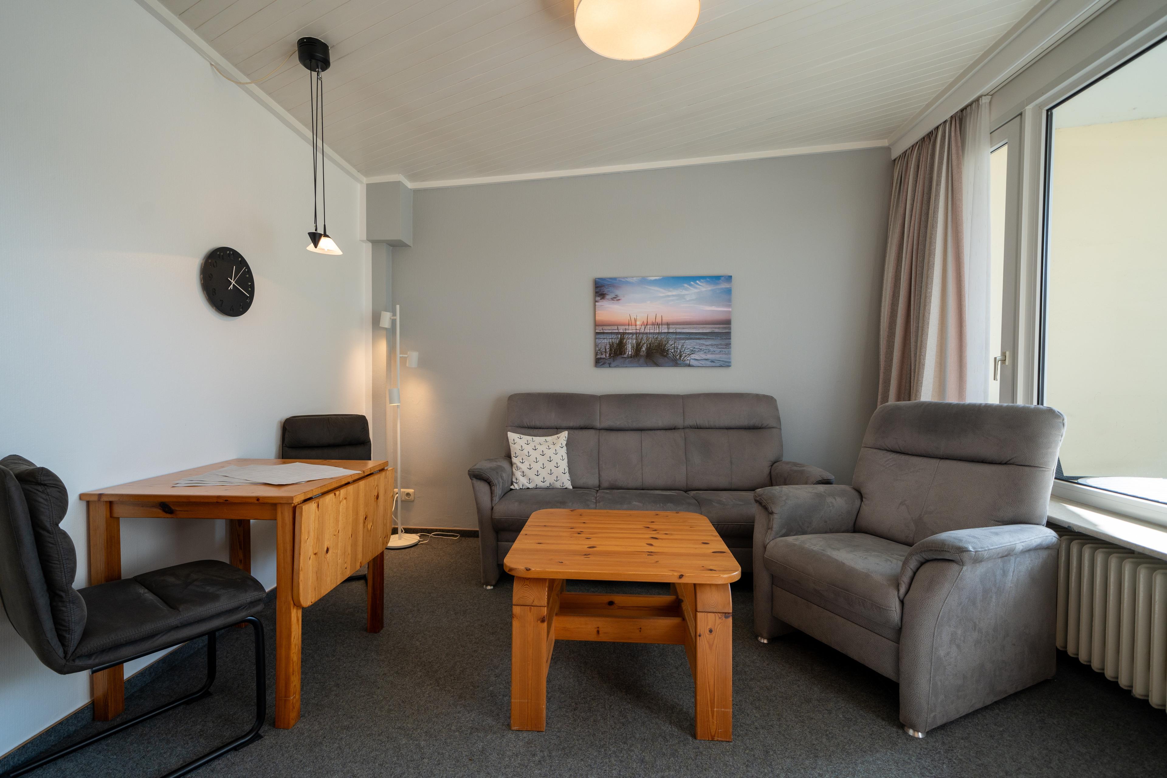 Im Wohnbereich können Sie auf der Couch entspannen. Die Einrichtung ist zweckmäßig und es gibt eine Sitzecke für bis zu 3 Personen.