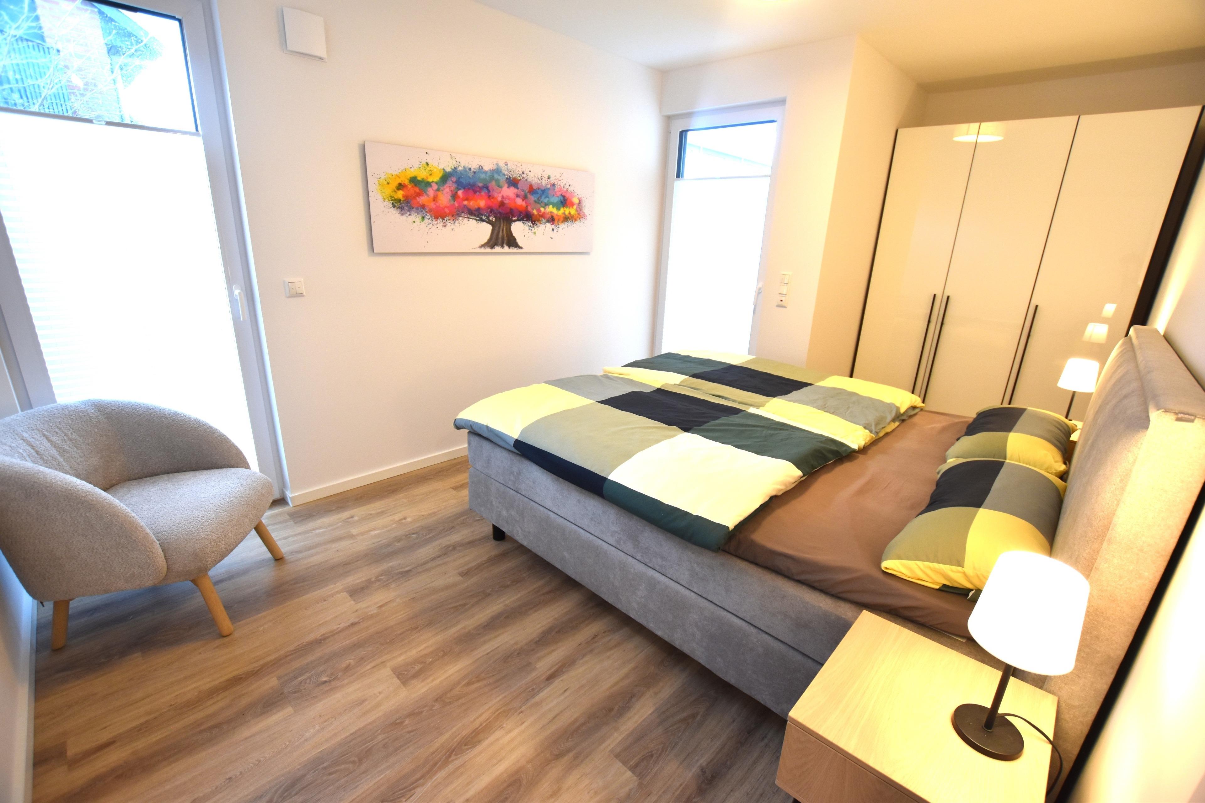 • Schlafzimmer 1: Das gemütliche Schlafzimmer verfügt über ein Doppelbett mit einer Einzelmatratzen (180 x 200 cm), zwei Nachttische mit Nachttischlampen, einen geräumigen Kleiderschrank sowie Außenrollläden für erholsamen Schlaf.