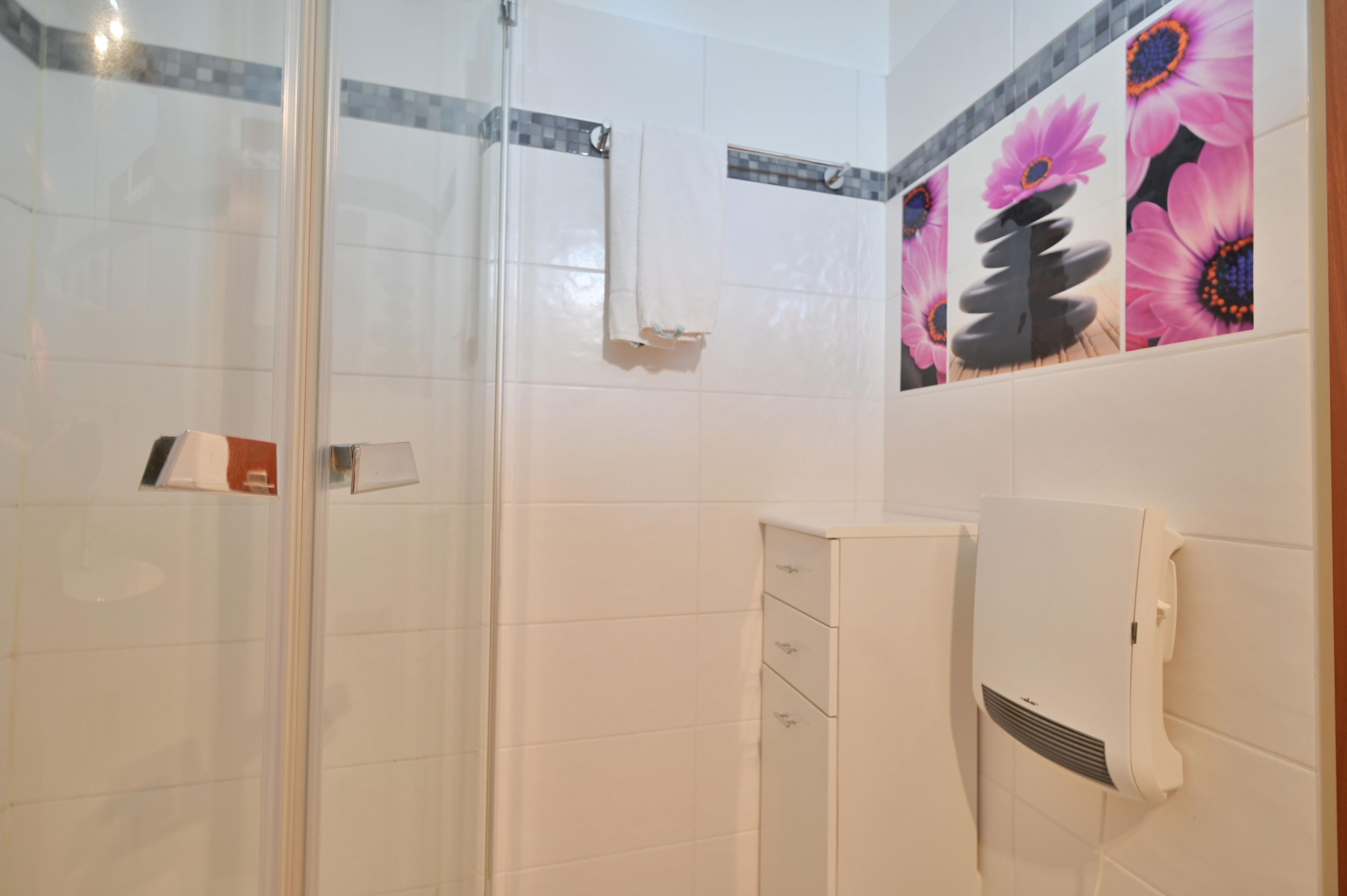 Das moderne, innenliegende Bad ist mit Dusche, WC und Waschtisch ausgestattet.