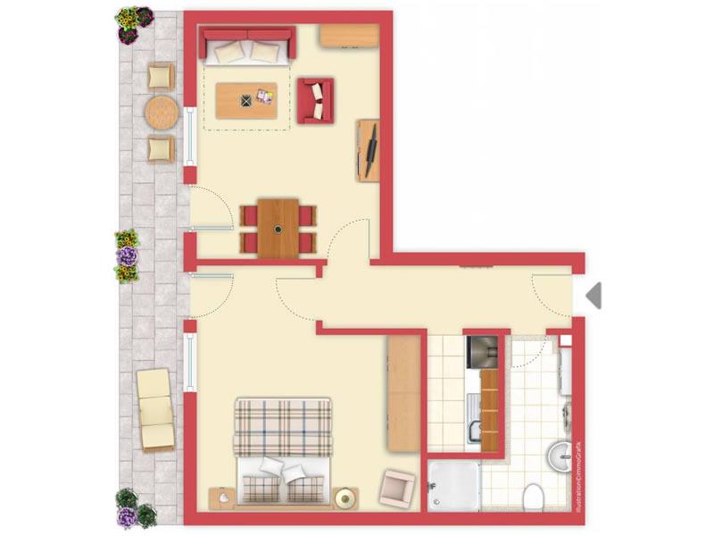 Die Wohnung Nr.16 liegt im Parterre und ist für 2-3 Personen eingerichtet. Sie haben einen Wohnschlafraum mit Schlafsofa, einen Schlafraum, Küche, Dusche/WC, Flur und Terrassen.