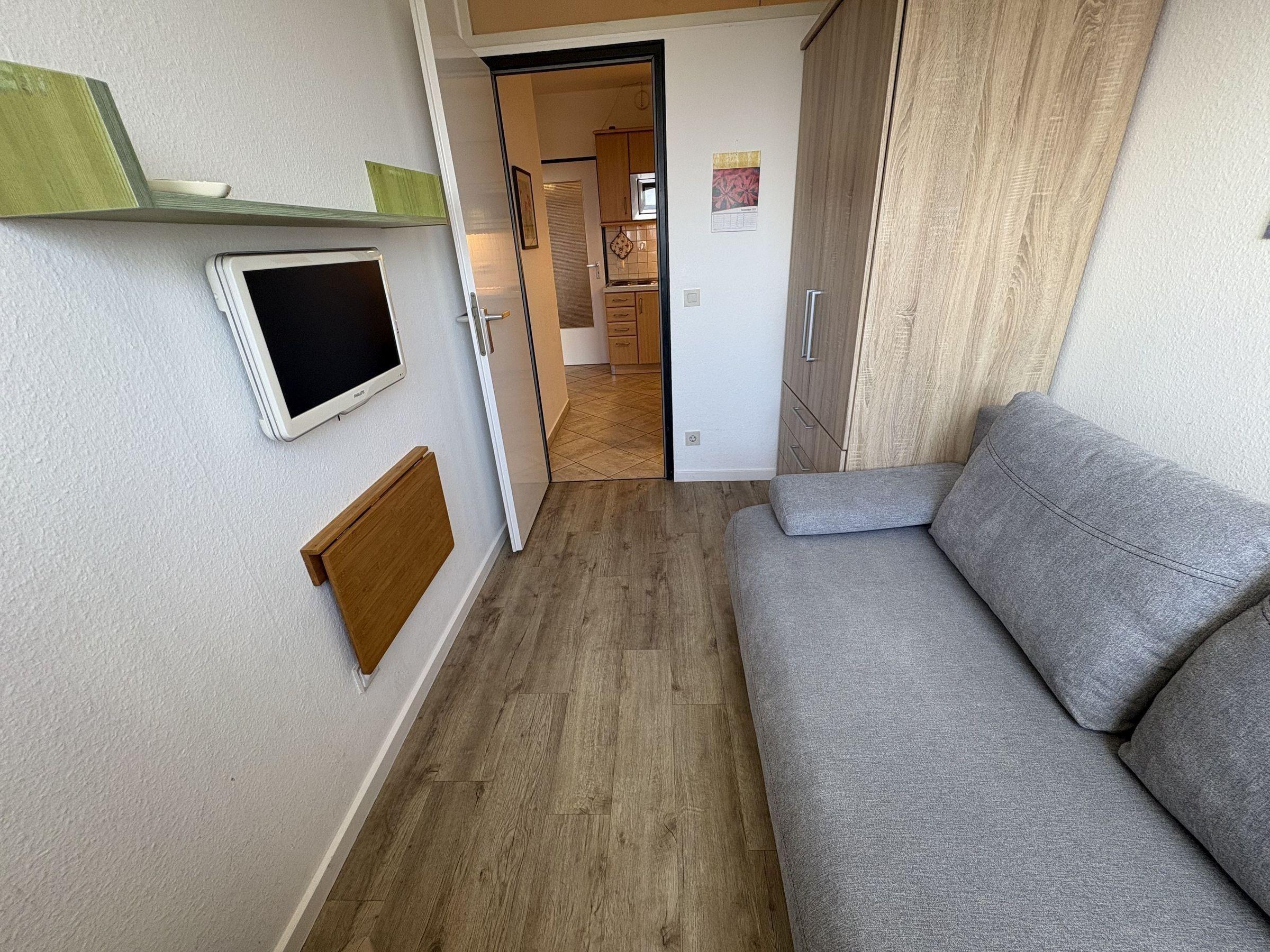Das Feriendomizil in der 5. Etage des Hauses Berolina bietet Platz für bis zu 4 Personen und beeindruckt durch einen traumhaften Blick über die Ostsee. Es disponiert über ein Wohn- und Schlafzimmer mit einer gemütlichen Eck-Couch, Sessel und TV sowie einem Doppelbett (2 Einzelmatratzen 90x200 cm) und Kleiderschrank. Ein separater Schlafraum mit Schlafsofa (120x180 cm), Klapptisch, Kleiderschrank und TV ergänzt den Raum. Die Küche ist ausgestattet mit einer Spülmaschine und einem Essplatz für 4 Personen. Im Badezimmer sind Dusche und WC vorhanden.