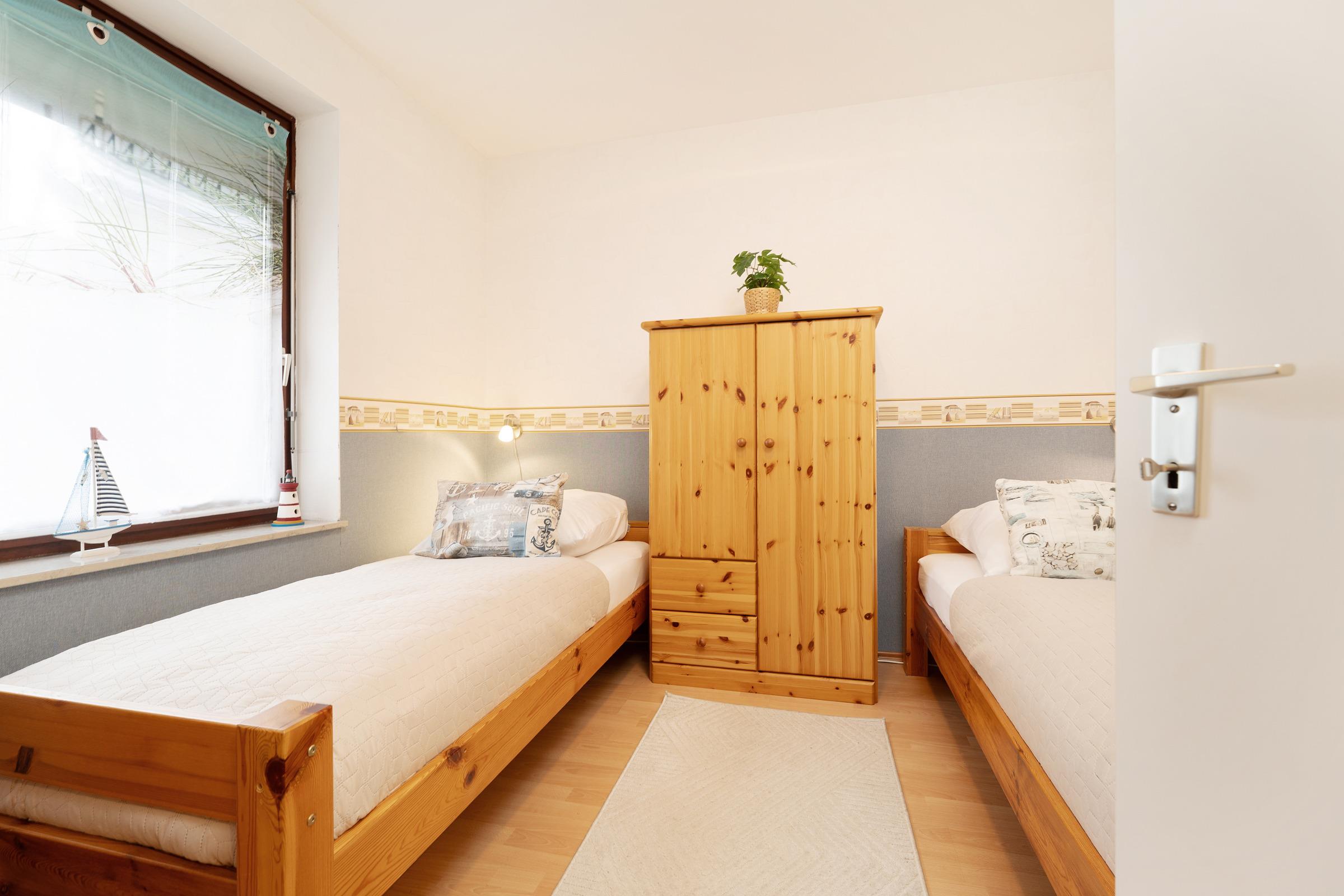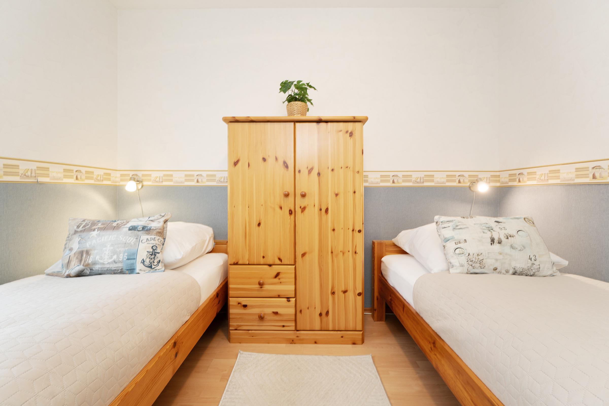Schlafzimmer 2: 2 Einzelbetten (je 90x200 cm), Kleiderschrank, TV, Verdunkelung: Rollläden, Platz für ein Babybett vorhanden