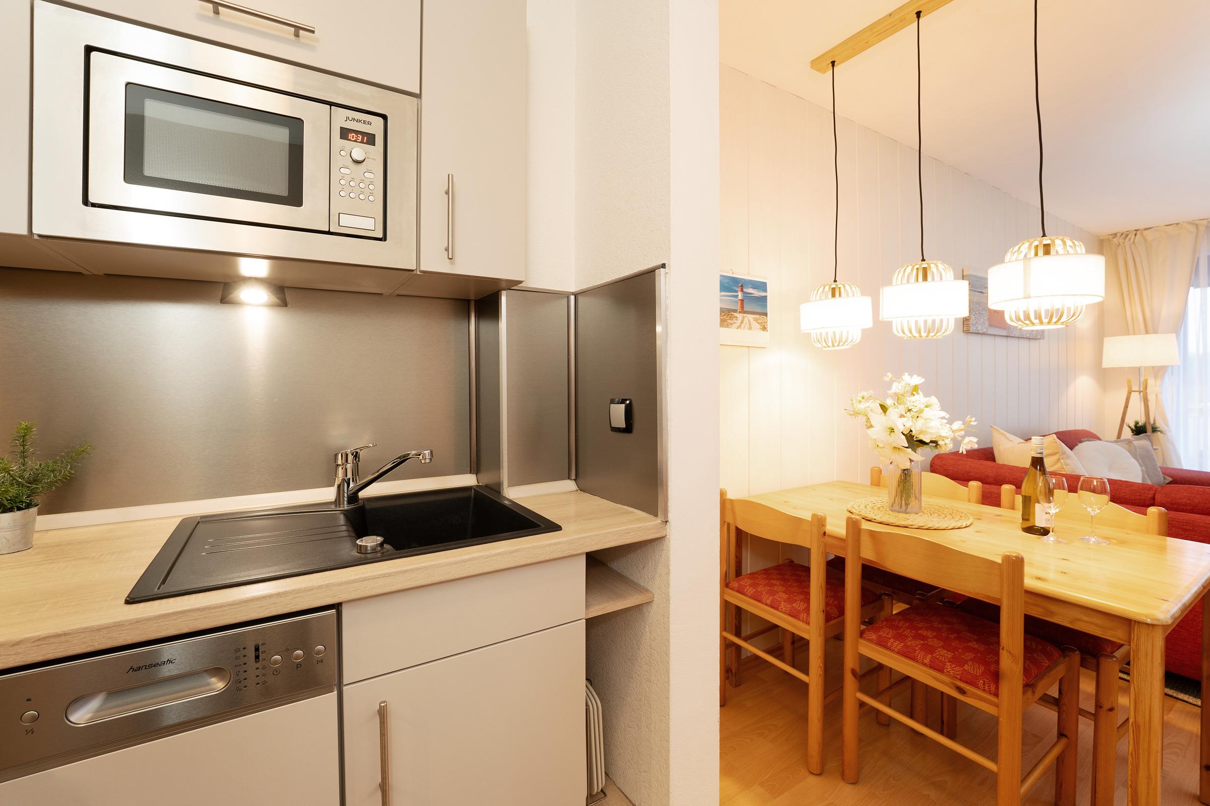Schon beim Betreten der Erdgeschosswohnung empfängt Sie der helle und freundlich gestaltete Wohnbereich mit gemütlicher Sitzlandschaft, TV und WLAN – der perfekte Ort für entspannte Urlaubsabende. Von hier aus gelangen Sie direkt auf den rund 10 m² großen, gemütlich möblierten Balkon mit Nordwest-Ausrichtung - ideal für laue Abende an der Ostsee. Hier ist Grillen erlaubt (nur Elektro oder Gas), ein Gerät müsste mitgebracht werden. Die offene Küche ist modern und umfassend ausgestattet und bietet alles, was Sie für die Zubereitung Ihrer Mahlzeiten benötigen. Ein Essbereich lädt zum gemeinsamen Genießen ein. Die Ferienwohnung verfügt über zwei Schlafzimmer: eines mit komfortablem Doppelbett, das zweite mit zwei Einzelbetten – ideal für Familien oder Freunde. Das Badezimmer ist mit Dusche und WC ausgestattet und rundet den Wohnkomfort ab. Für die kleinen Gäste stehen ein Kinderhochstuhl, zwei Kinderreisebetten und ein Bettschutzgitter zur Verfügung.