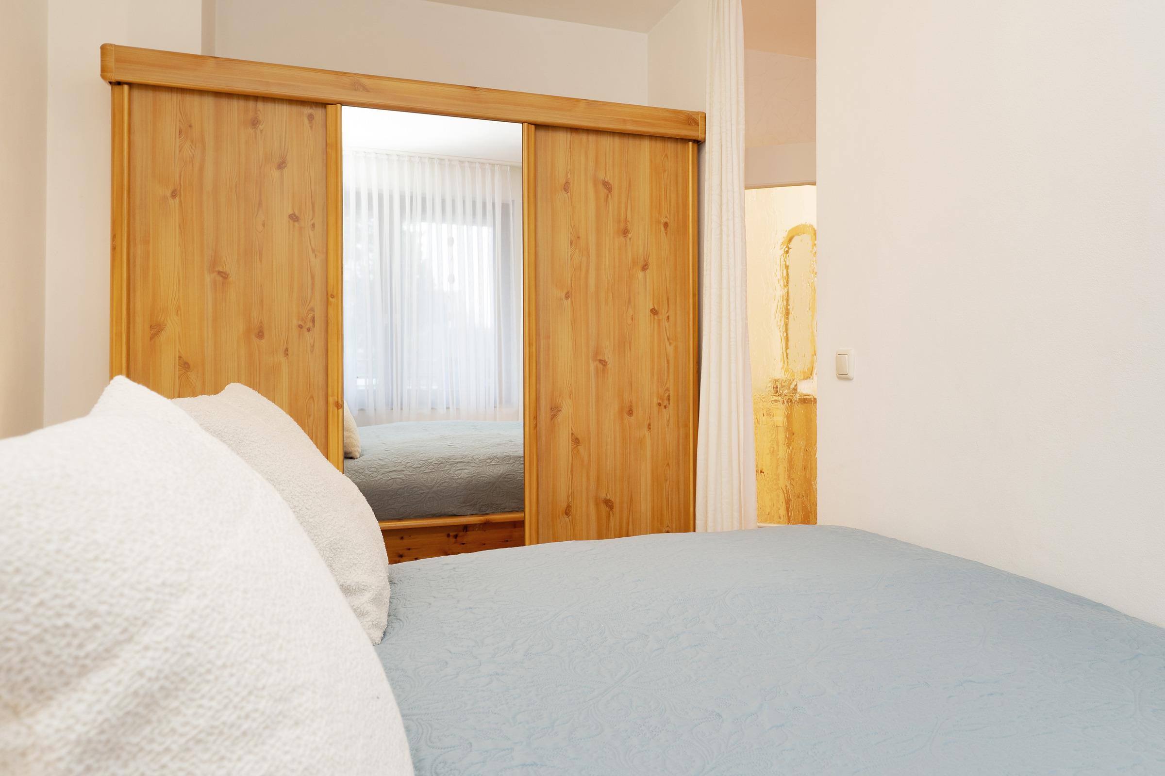 Schlafzimmer 1: 1 Doppelbett (2x 90x200 cm), Kleiderschrank, Verdunkelung: Rollladen, kein Platz für ein Babybett vorhanden