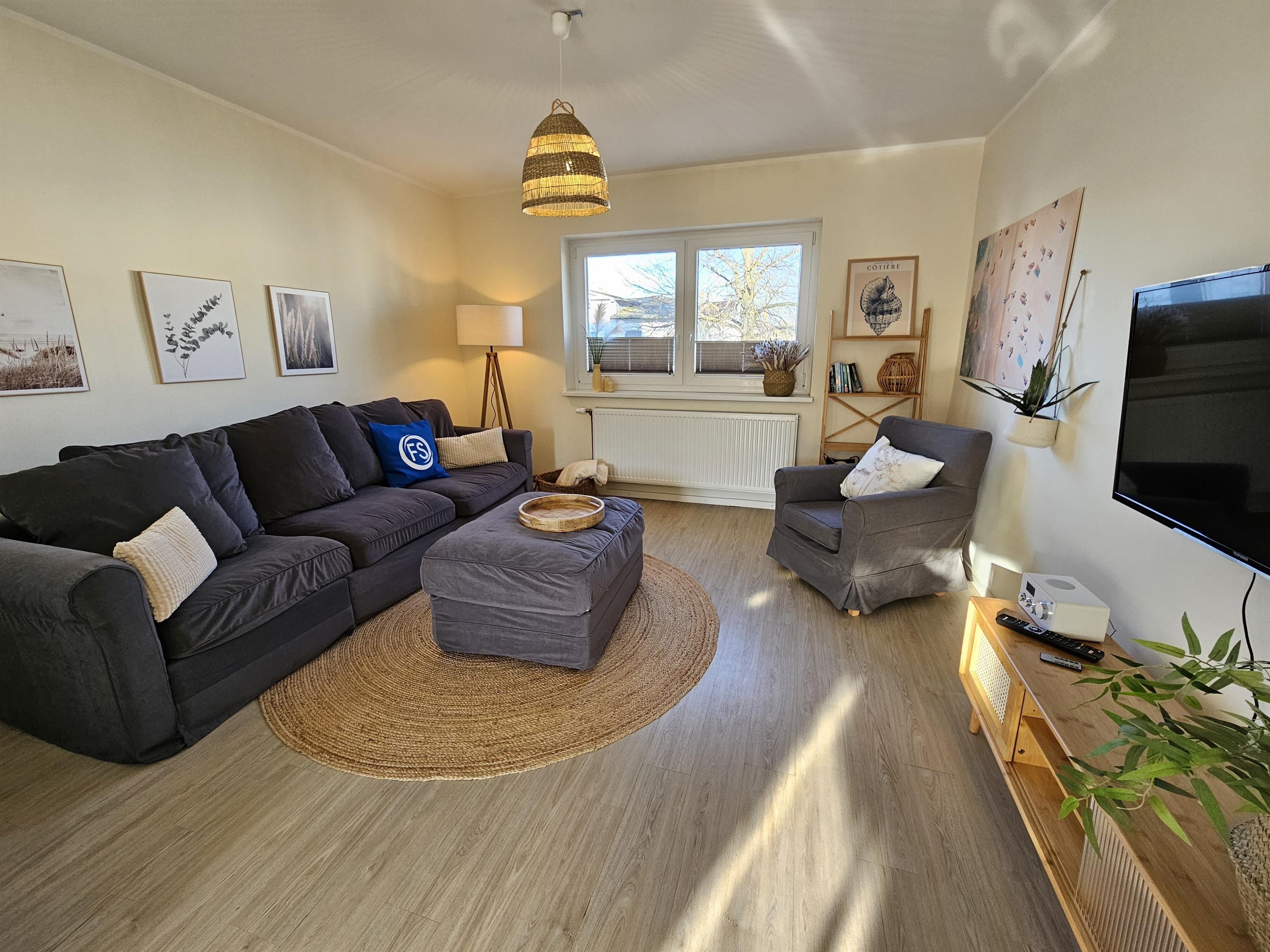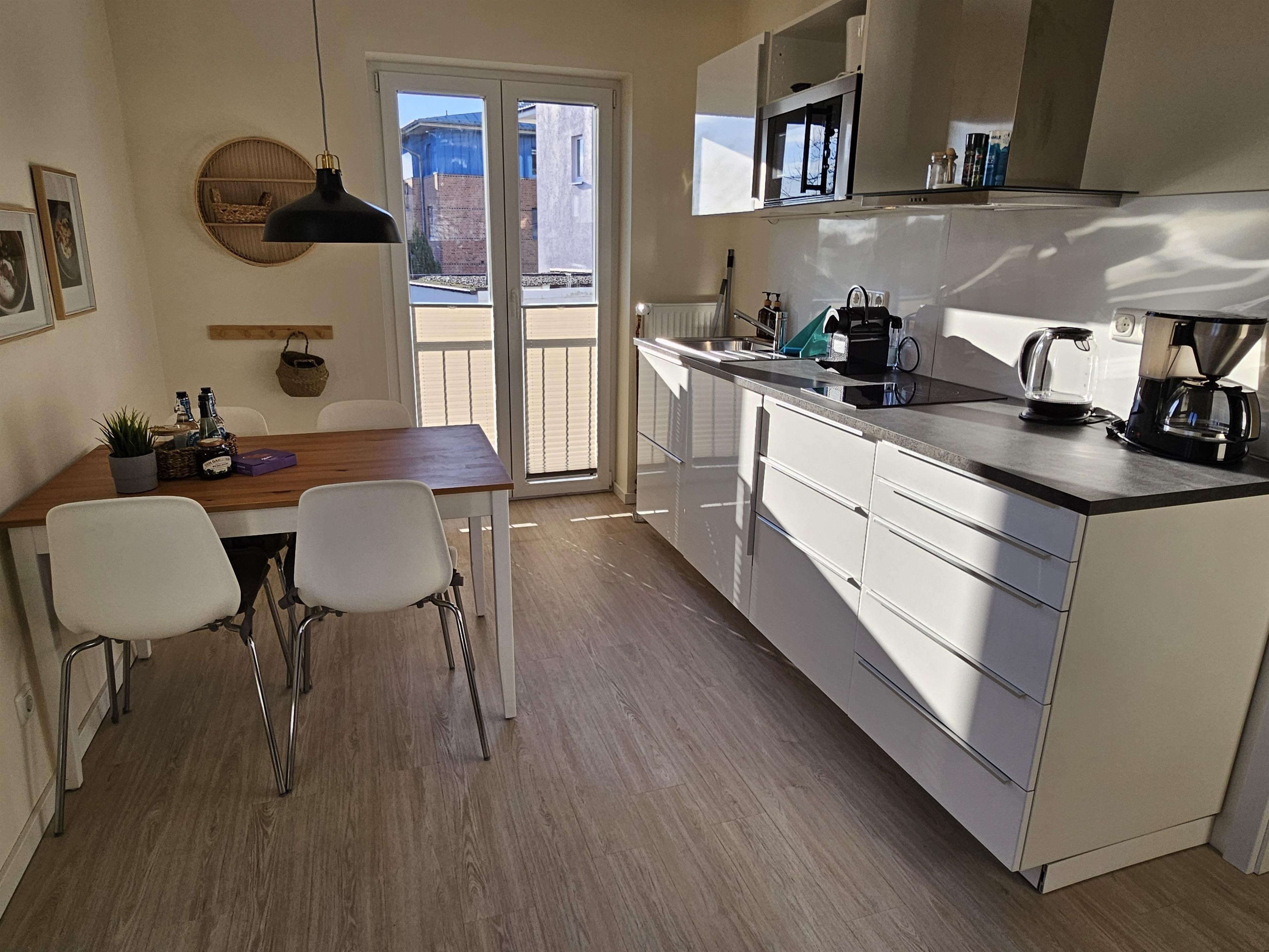 Der offen gestaltete Wohnbereich besticht durch skandinavische Leichtigkeit und Funktionalität. Die integrierte Küchenzeile ist ein echtes Raumwunder - ausgestattet mit Induktionsherd, Backofen, Wasserkocher, Kaffeemaschine und Nespresso-Maschine für den perfekten Urlaubsaufenthalt.