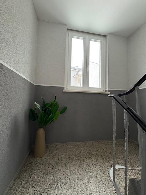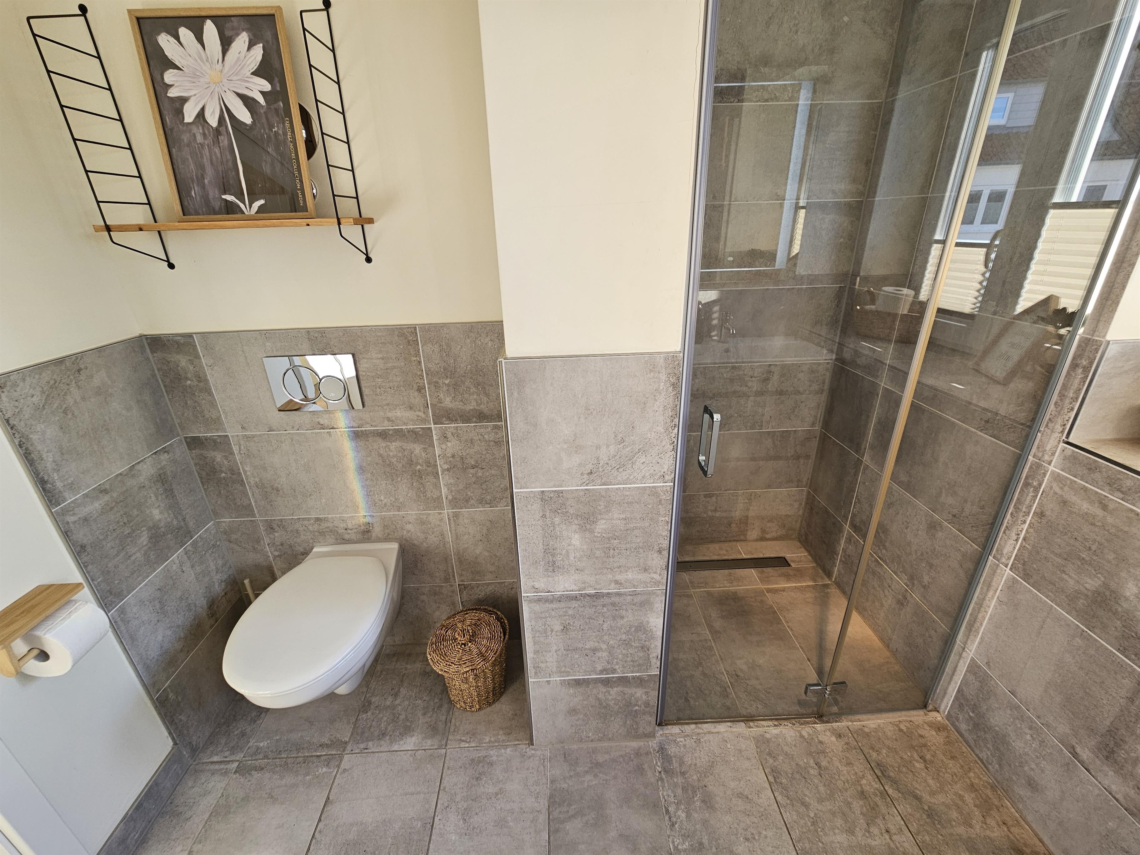 Das sanierte Badezimmer überzeugt mit einer ebenerdiger walk-in Dusche.