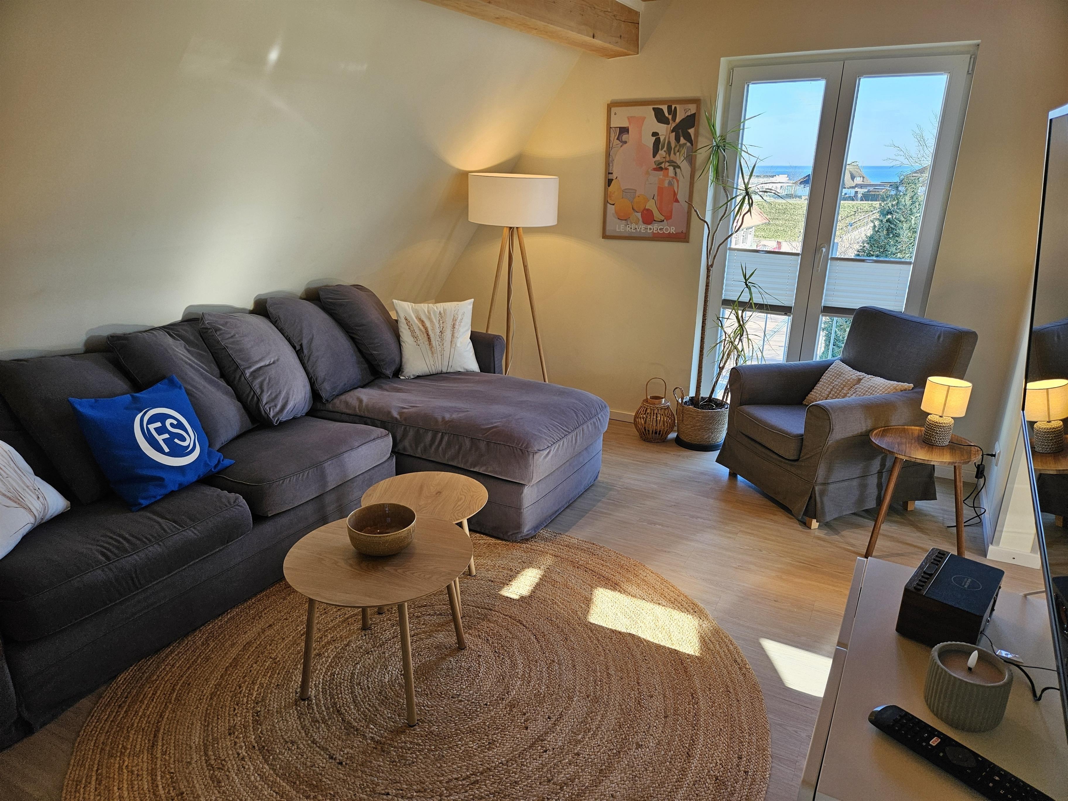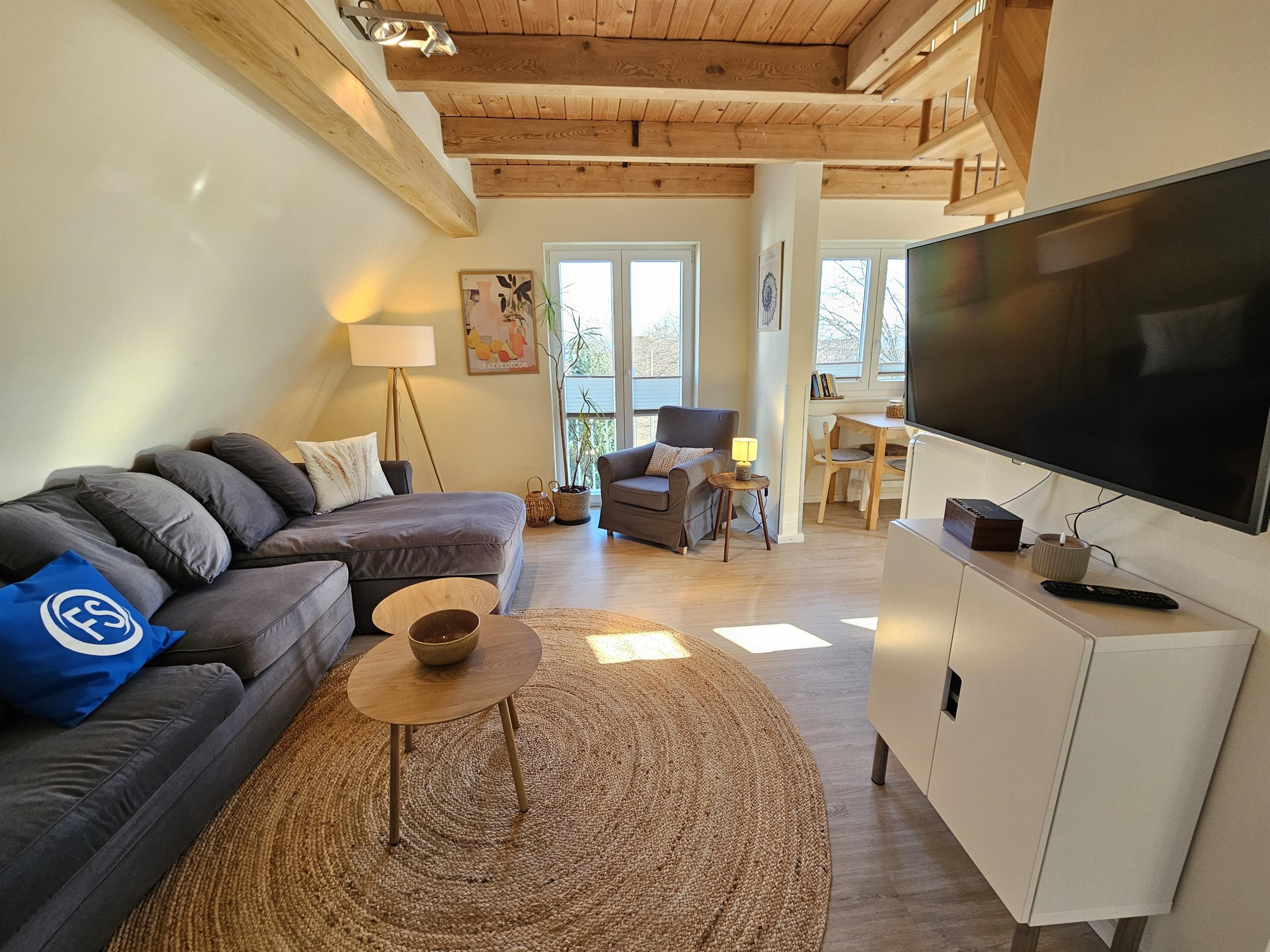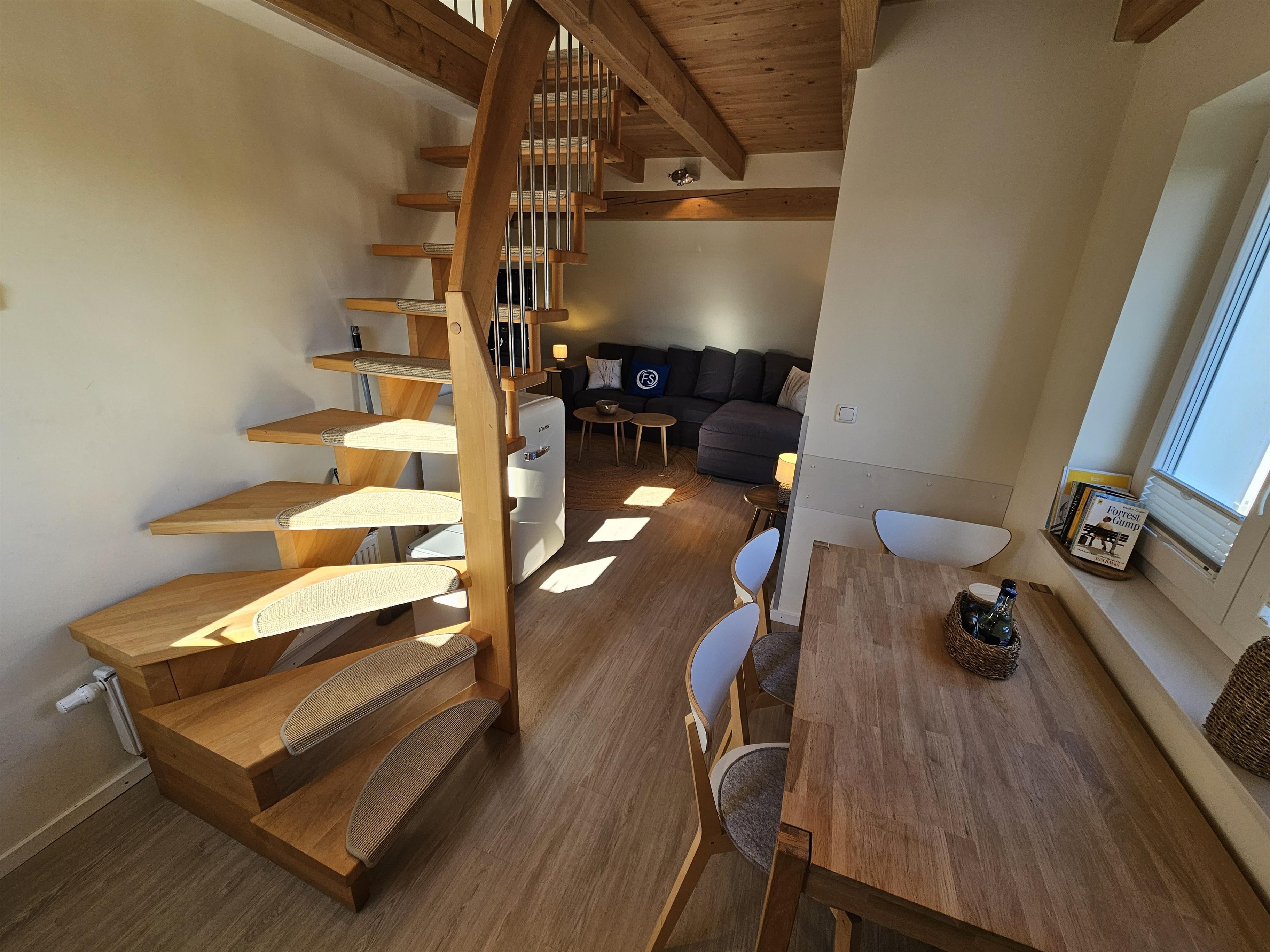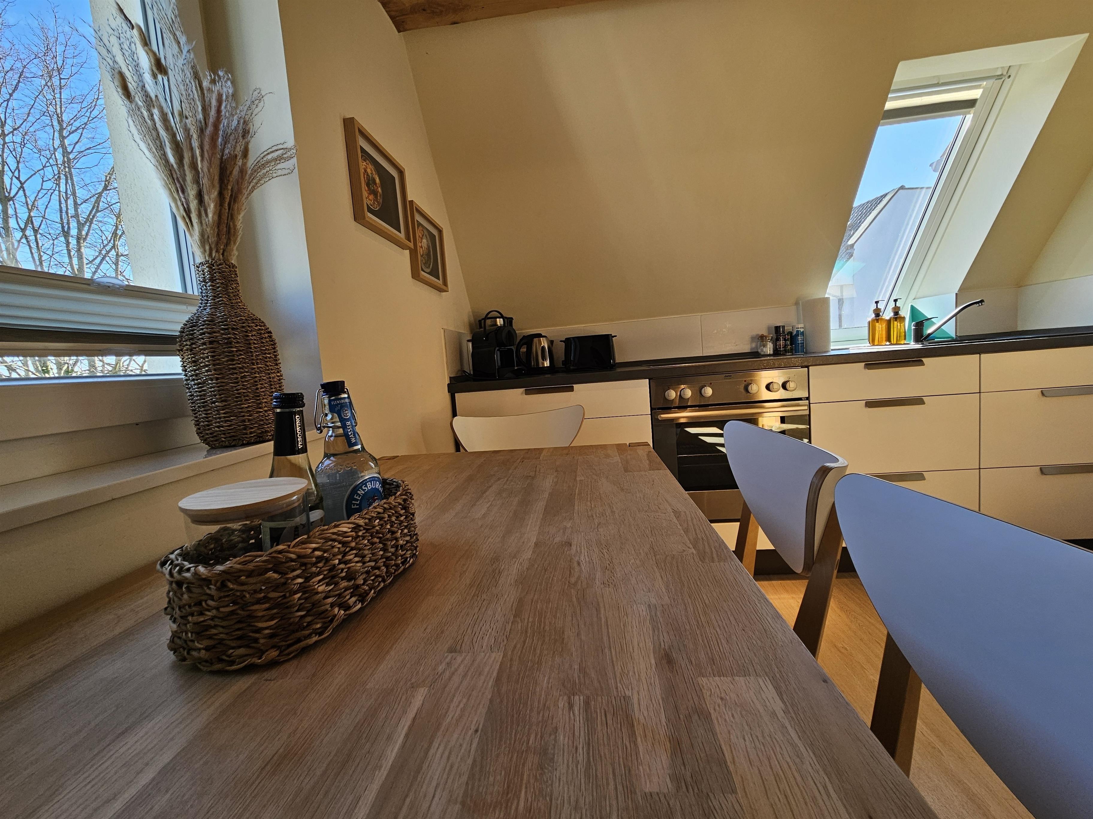 Der lichtdurchflutete Wohnbereich lädt zu gemeinsamen Abenden ein. Die vollausgestattete offene Küche (Induktionsherd, Nespresso-Maschine, Backofen) lässt keine Wünsche offen - perfekt für das gemütliche Frühstück, bevor es zum Strand geht. Frische Brötchen gibt es beim Bäcker direkt nebenan (30m)!