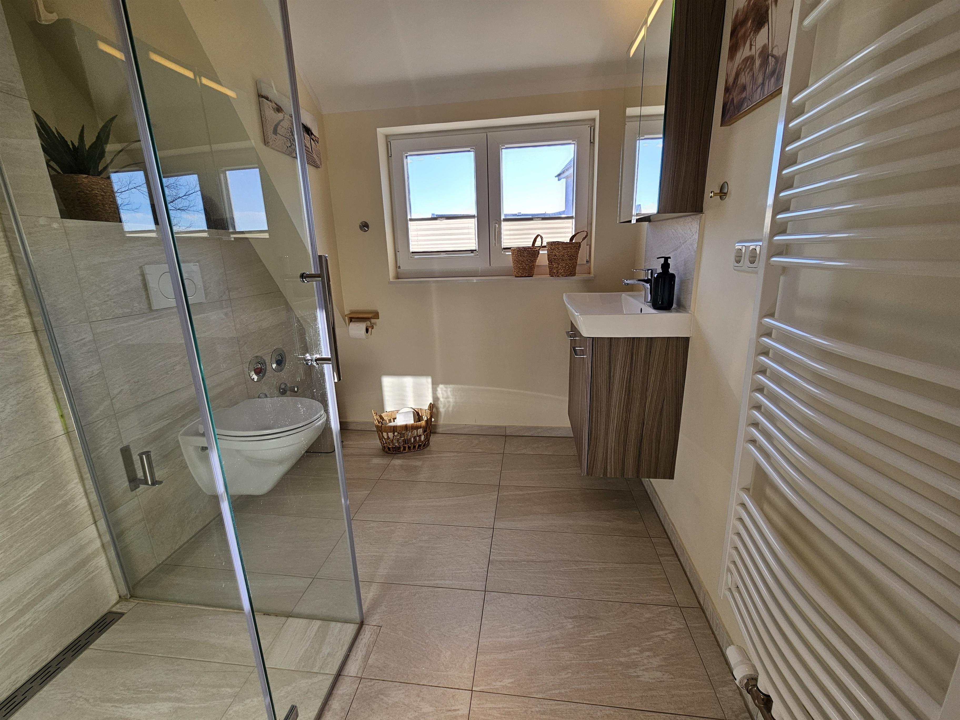 Vor dem großen Dachgeschossfenster steht ein Kicker und lädt zu einer Runde Spielspaß für jung und alt ein. Im neuen Bad befindet sich eine ebenerdige Dusche.