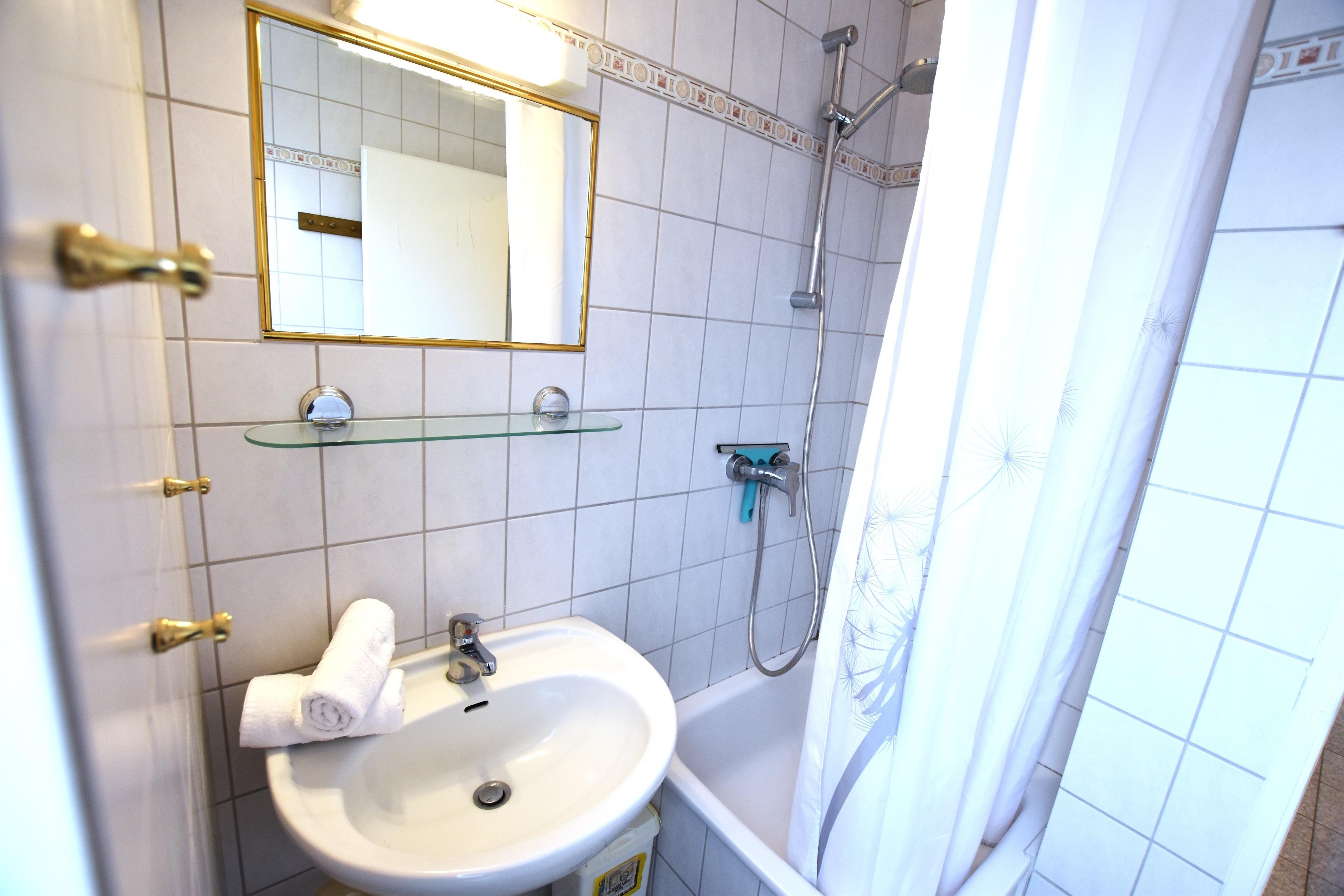 • Ebenfalls vom Flur aus zugänglich ist ein separates WC mit Waschbecken und Spiegel - besonders komfortabel bei mehreren Gästen.