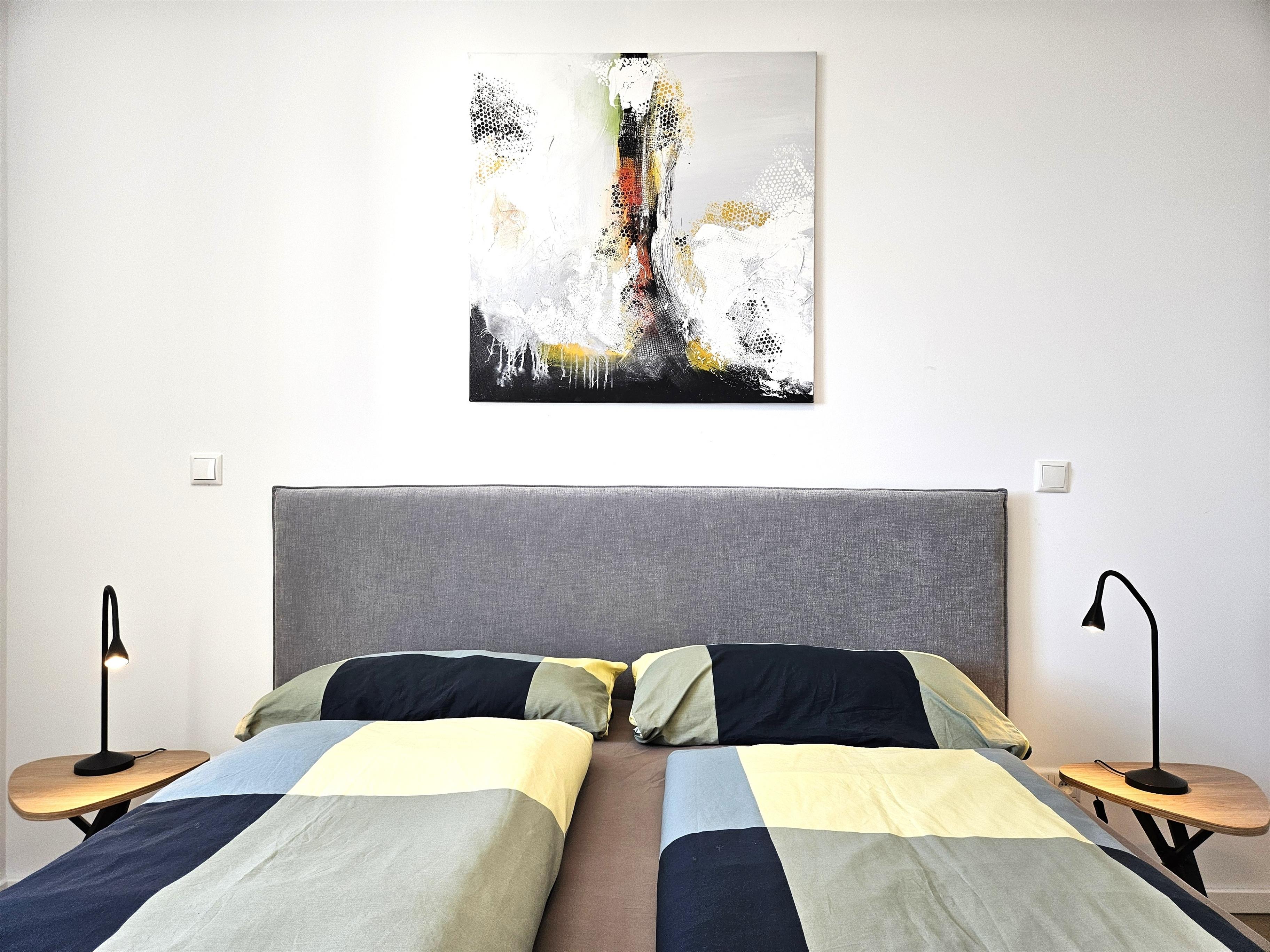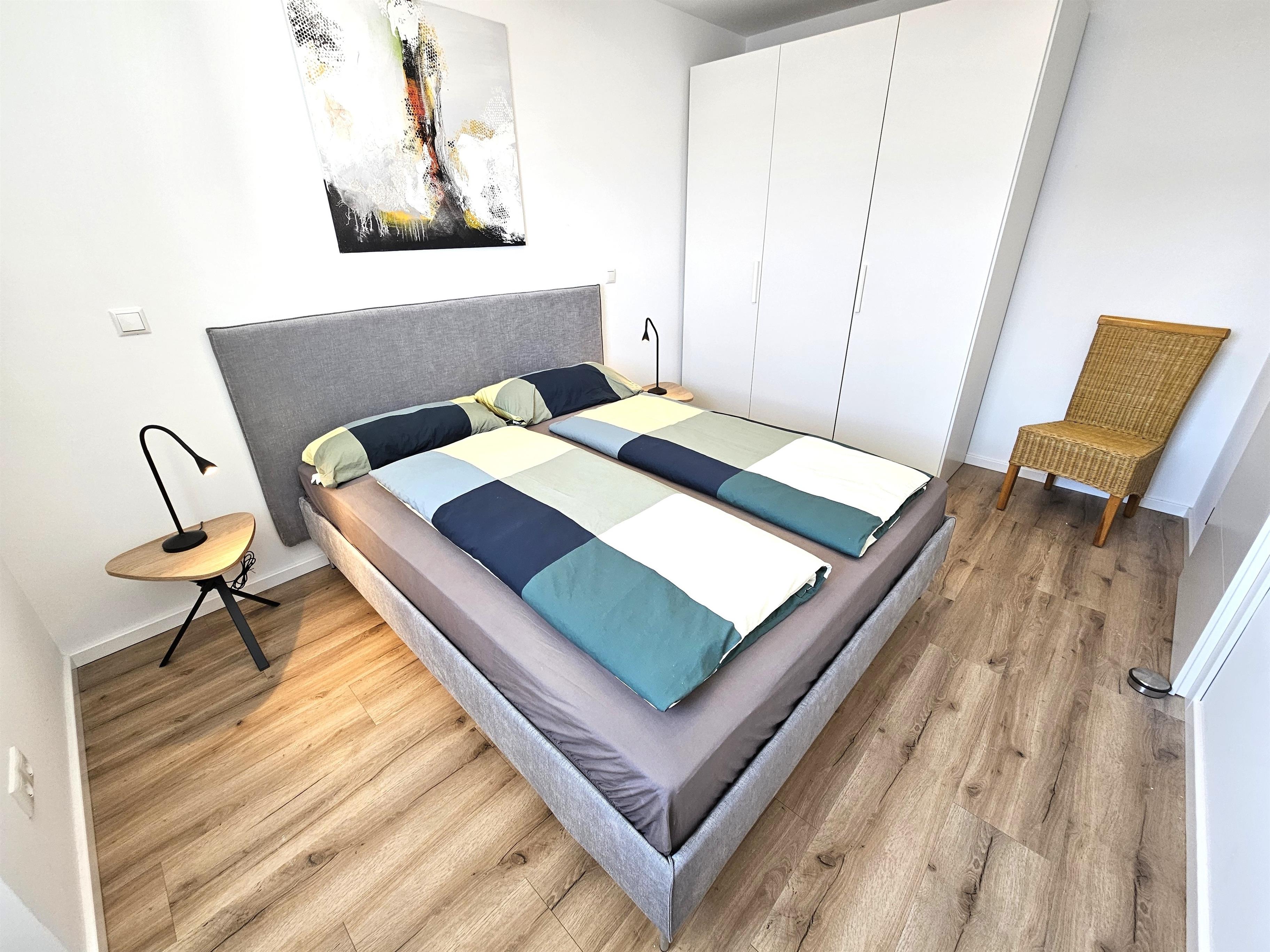 • Schlafzimmer: Das gemütliche Schlafzimmer verfügt über ein Doppelbett (2 x 80 x 200 cm), zwei Nachttische mit Nachttischlampen, einen geräumigen Kleiderschrank sowie Plissee für einen erholsamen Schlaf.