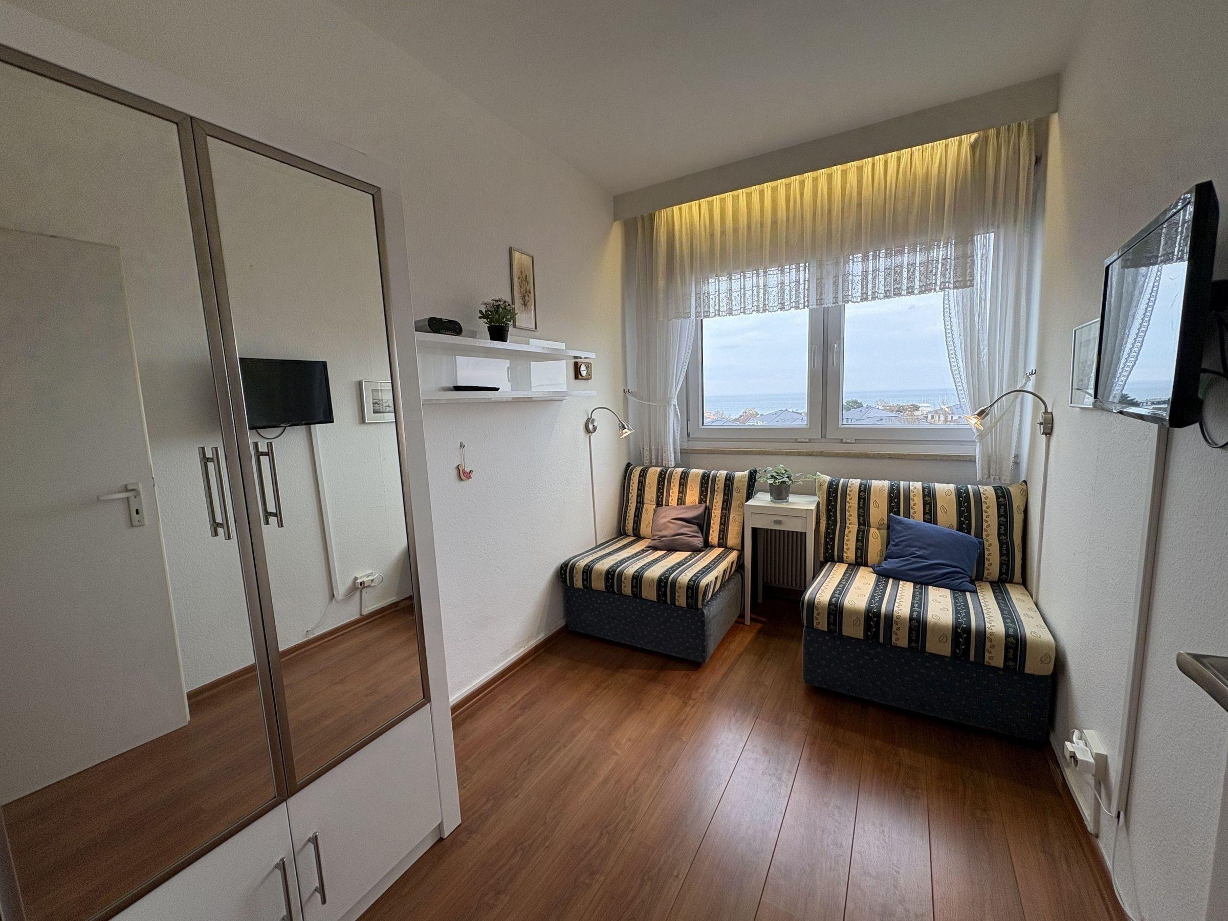 Die Ferienwohnung in der 5. Etage des Hauses Berolina bietet Platz für maximal 3 Personen. Sie verfügt über ein Wohn-, Schlafzimmer mit einer Couch, TV und einem Schrankbett (2 Einzelmatratzen 90x200 cm) sowie einen Kleiderschrank. Zusätzlich gibt es einen separaten Schlafraum mit einem Schlafsessel (90x200 cm). Die voll ausgestattete Küche beinhaltet eine Spülmaschine und einen Essplatz für 4 Personen. Das Badezimmer ist mit Dusche und WC ausgestattet. Weitere Annehmlichkeiten umfassen einen Zugang zum hauseigenen Schwimmbad sowie gemeinschaftlich nutzbare Waschmaschinen und Trockner auf den Etagen 1 bis 4 (Münzautomat). Ein PKW-Stellplatz in der Tiefgarage mit einer Durchfahrtshöhe von 185 cm gehört zur Wohnung. Rauchen ist auf dem Balkon erlaubt.