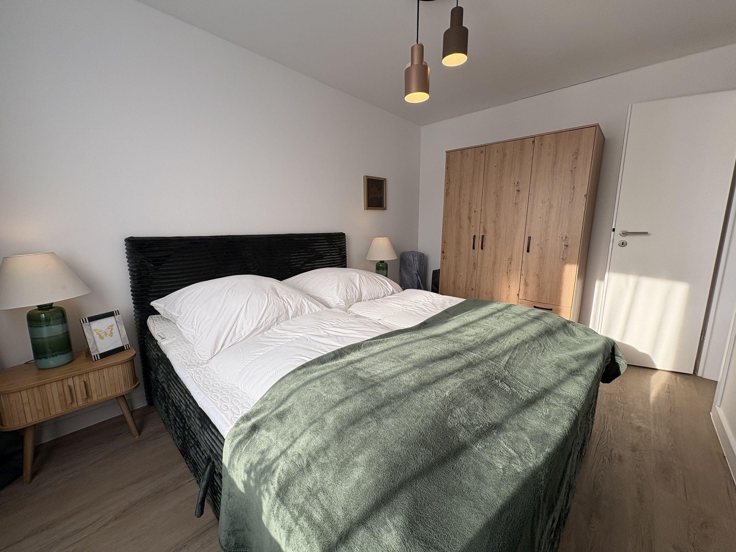 Die Wohnung verfügt über zwei Schlafzimmer: eines mit einem Doppelbett und Kinderreisebett sowie ein weiteres mit einem Etagenbett. Das Badezimmer ist mit Dusche und WC ausgestattet. Ein PKW-Stellplatz befindet sich direkt am Haus. Müllbehälter für Restmüll, Altpapier und Plastik sind am Gebäude vorhanden. Bettwäsche und Laken sind selbst mitzubringen.