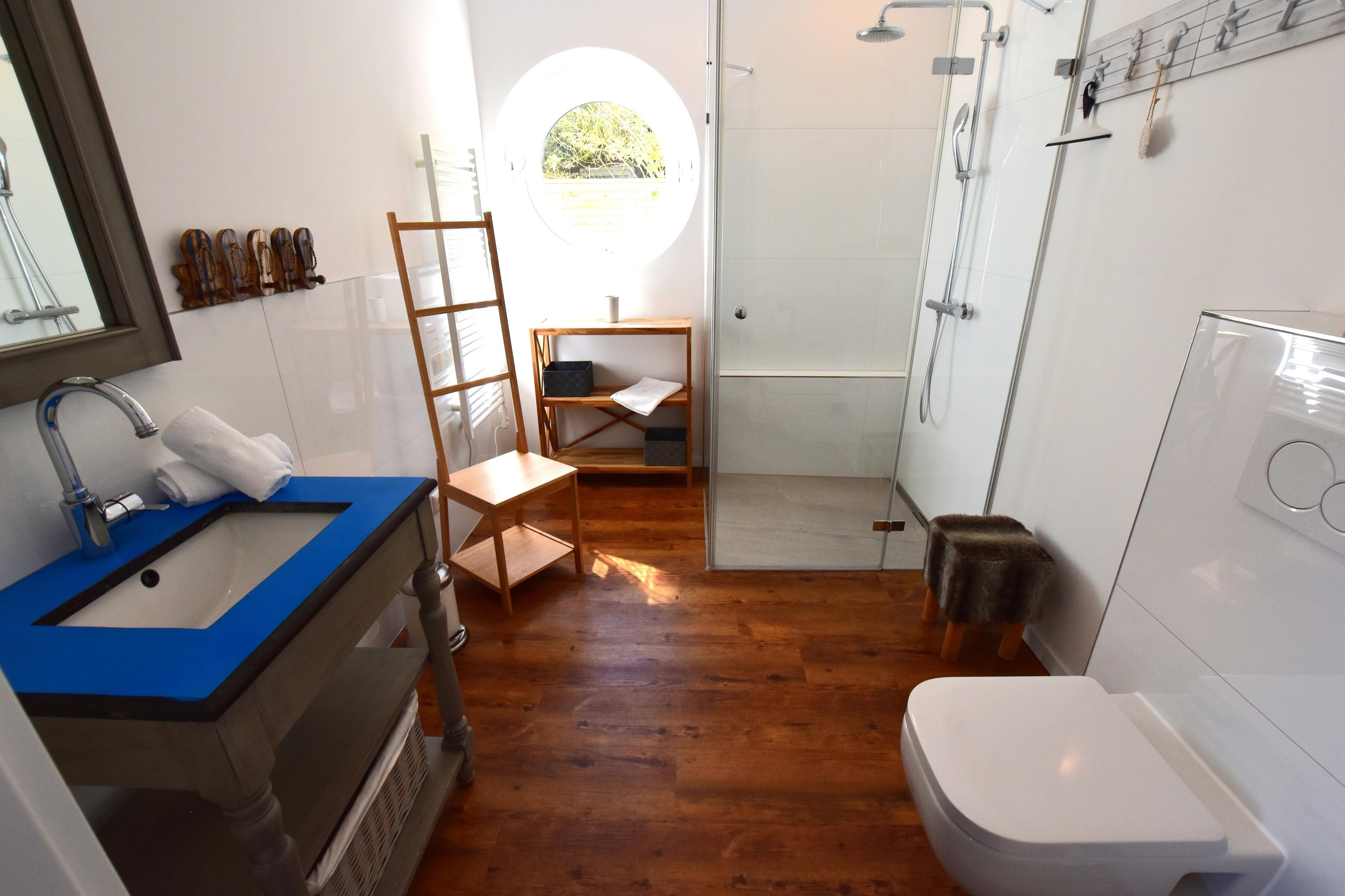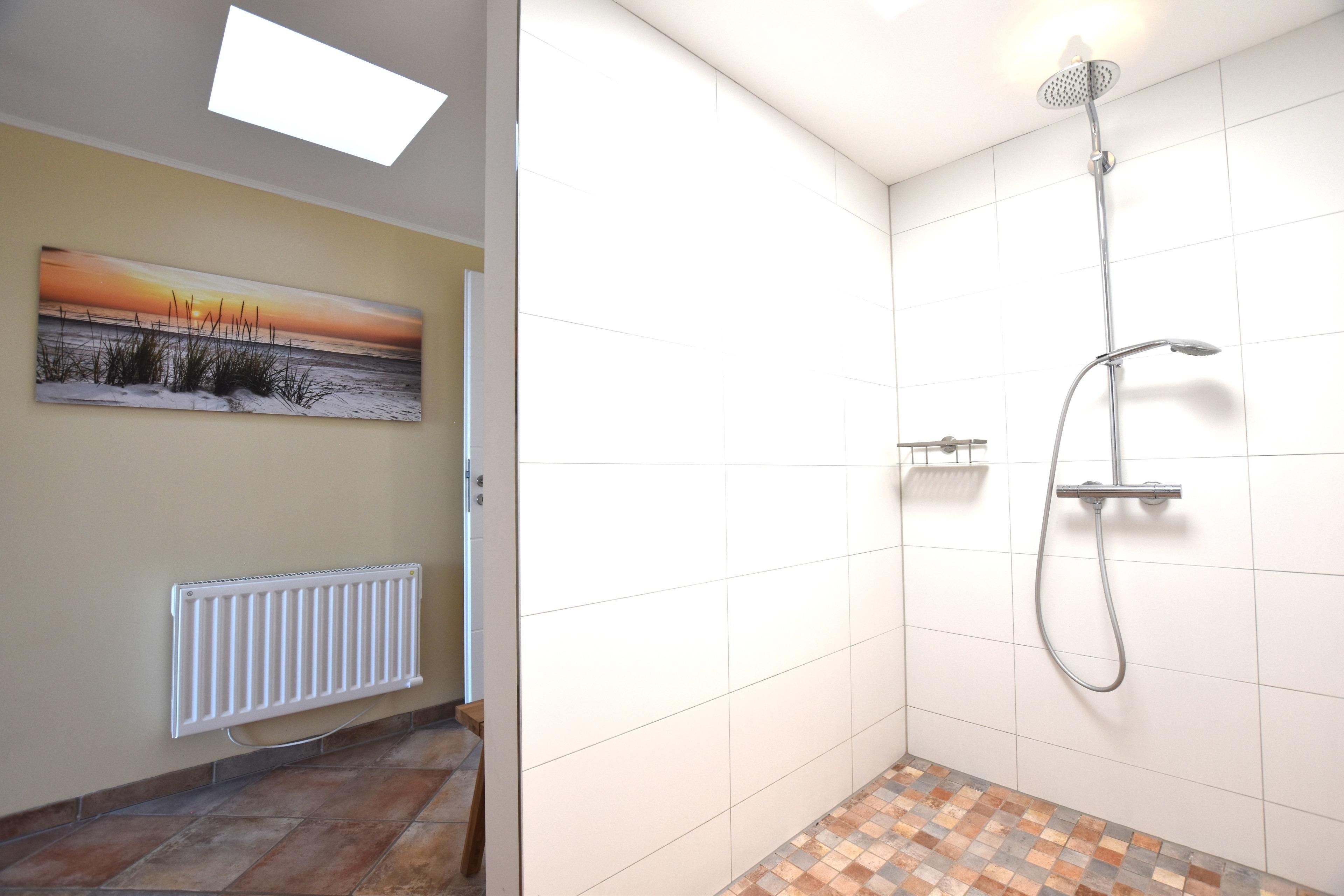 - Duschbad: bodentiefe große Dusche, Waschtisch mit Spiegel, Toilette und ein Fenster.