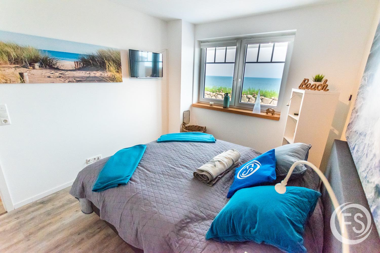 Schlafzimmer I: Doppelbett (Boxspring 160 cm x 200 cm), Kleiderschrank, Kommoden, Bettwäsche, Regal, Verdunkelungsrollo, TV Antenne, TV SAT